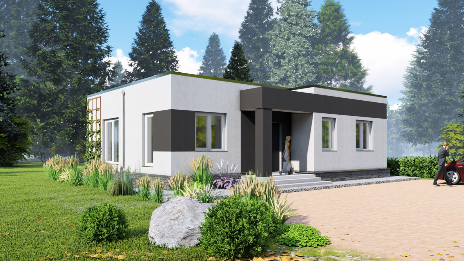 Предлагаем Вашему вниманию участок с одноэтажным домом с плоской (односкатной) крышей в современном стиле и панорамными окнами. Построен по каркасной технологии с соблюдением всех строительных норм по дизайн-проекту.