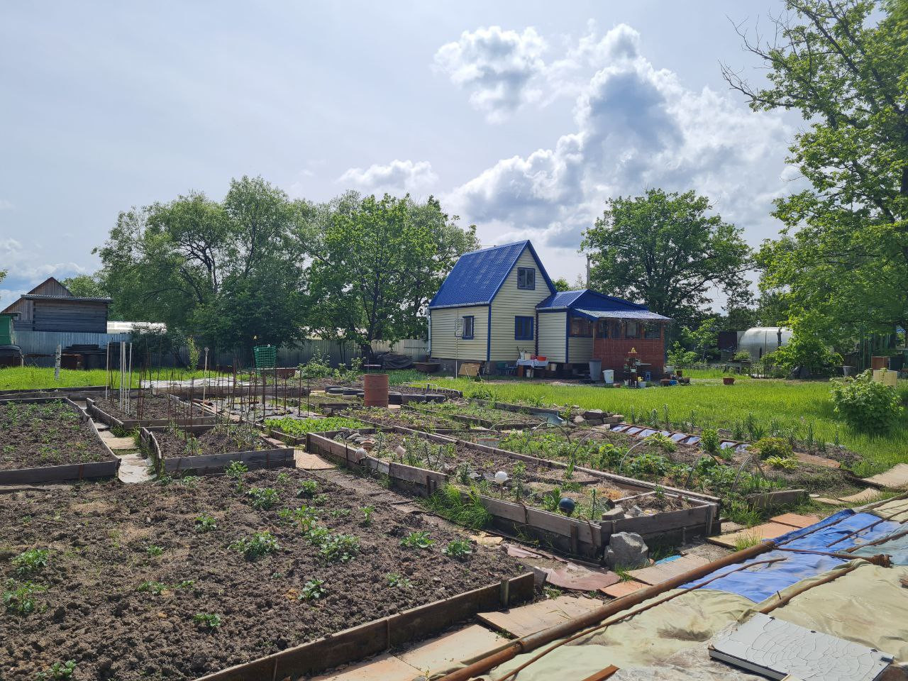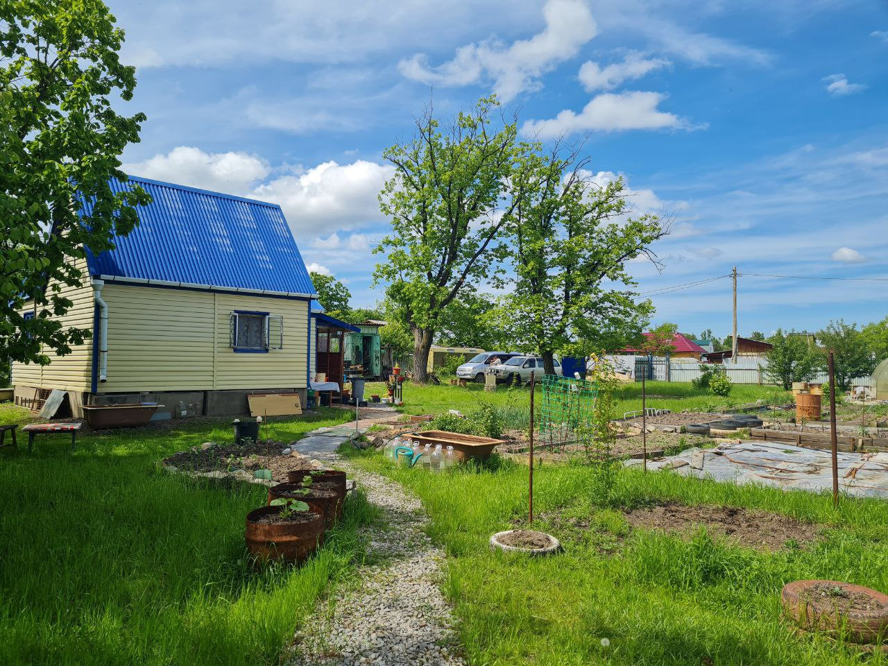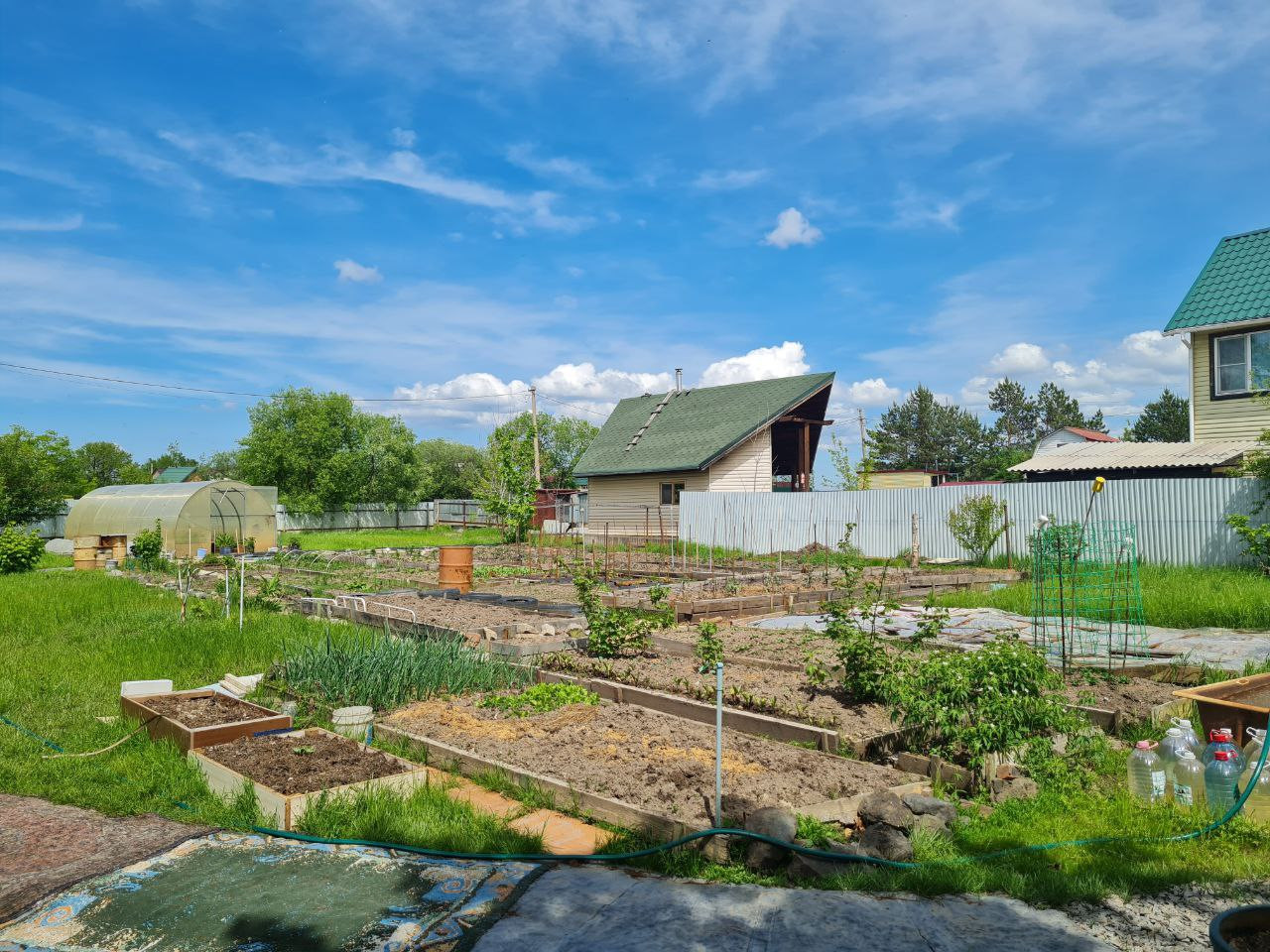 Охраняемая территория, несколько мест для парковки автомобиля, большая зона отдыха, утеплённый дом с печкой со всем необходимым для комфортного проживания, электричество (установлен счётчик), скважина, теплица, три контейнера, хозпостройки (сарай для кур и кроликов, душевая, туалет), хорошая плодородная земля, плодовые деревья и кустарники (яблоня, слива, черноплодная рябина, смородина, жимолость, клубника, малина).