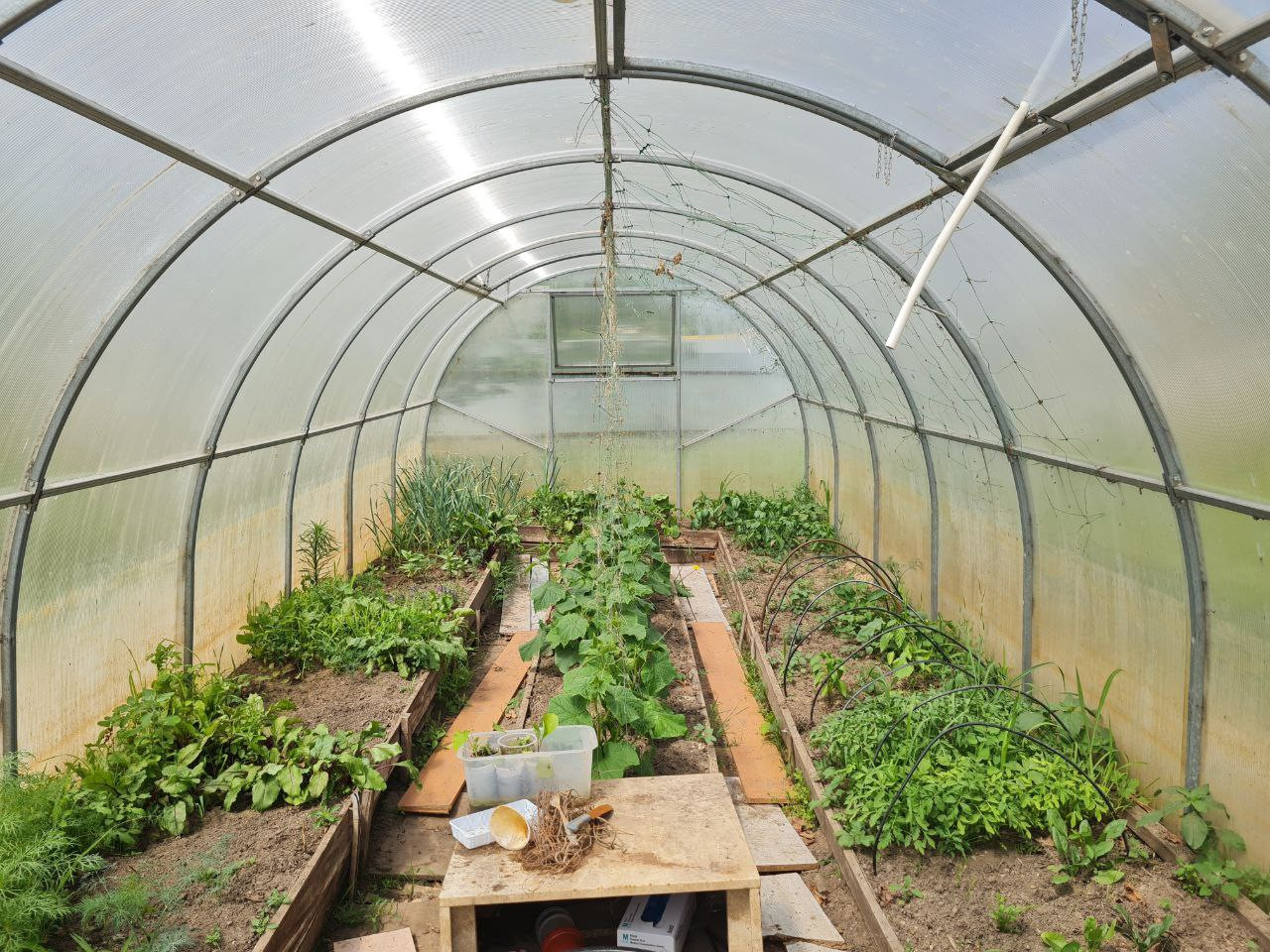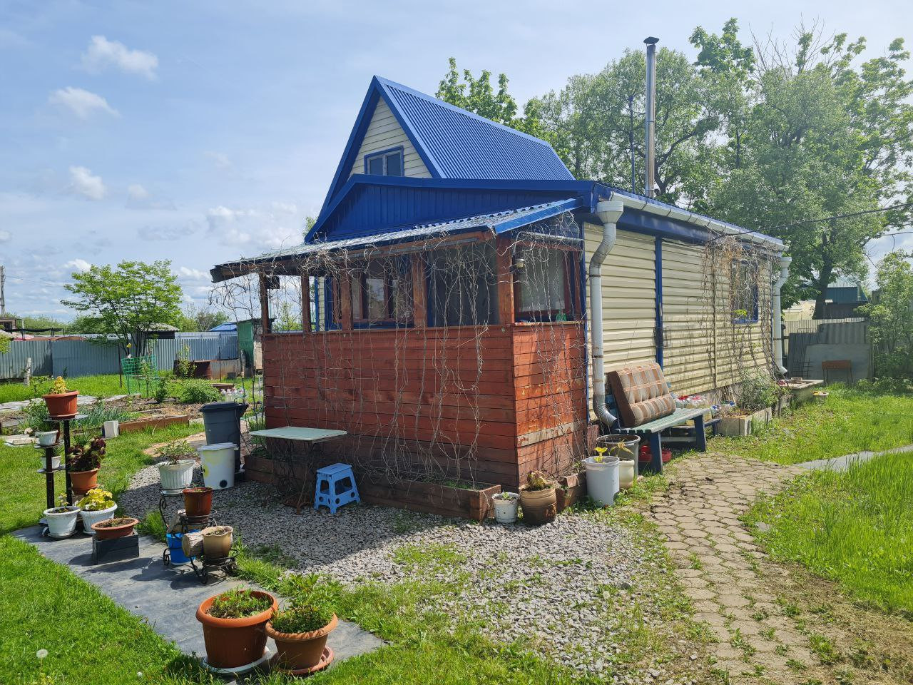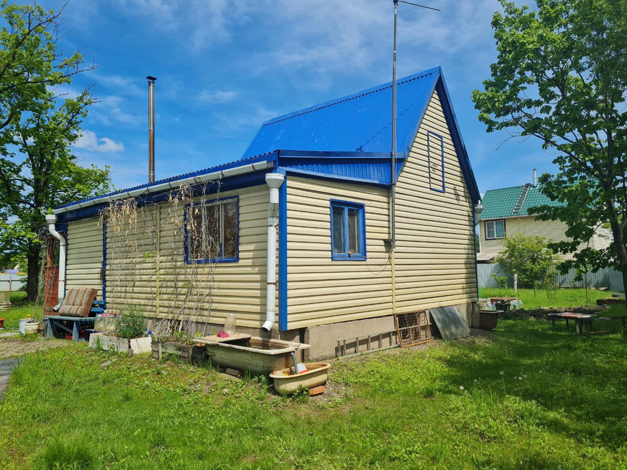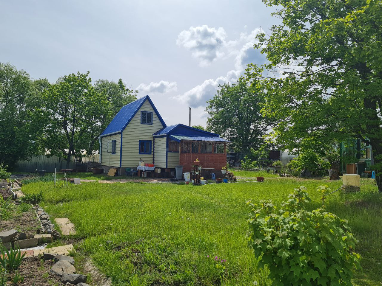 Охраняемая территория, несколько мест для парковки автомобиля, большая зона отдыха, утеплённый дом с печкой со всем необходимым для комфортного проживания, электричество (установлен счётчик), скважина, теплица, три контейнера, хозпостройки (сарай для кур и кроликов, душевая, туалет), хорошая плодородная земля, плодовые деревья и кустарники (яблоня, слива, черноплодная рябина, смородина, жимолость, клубника, малина).