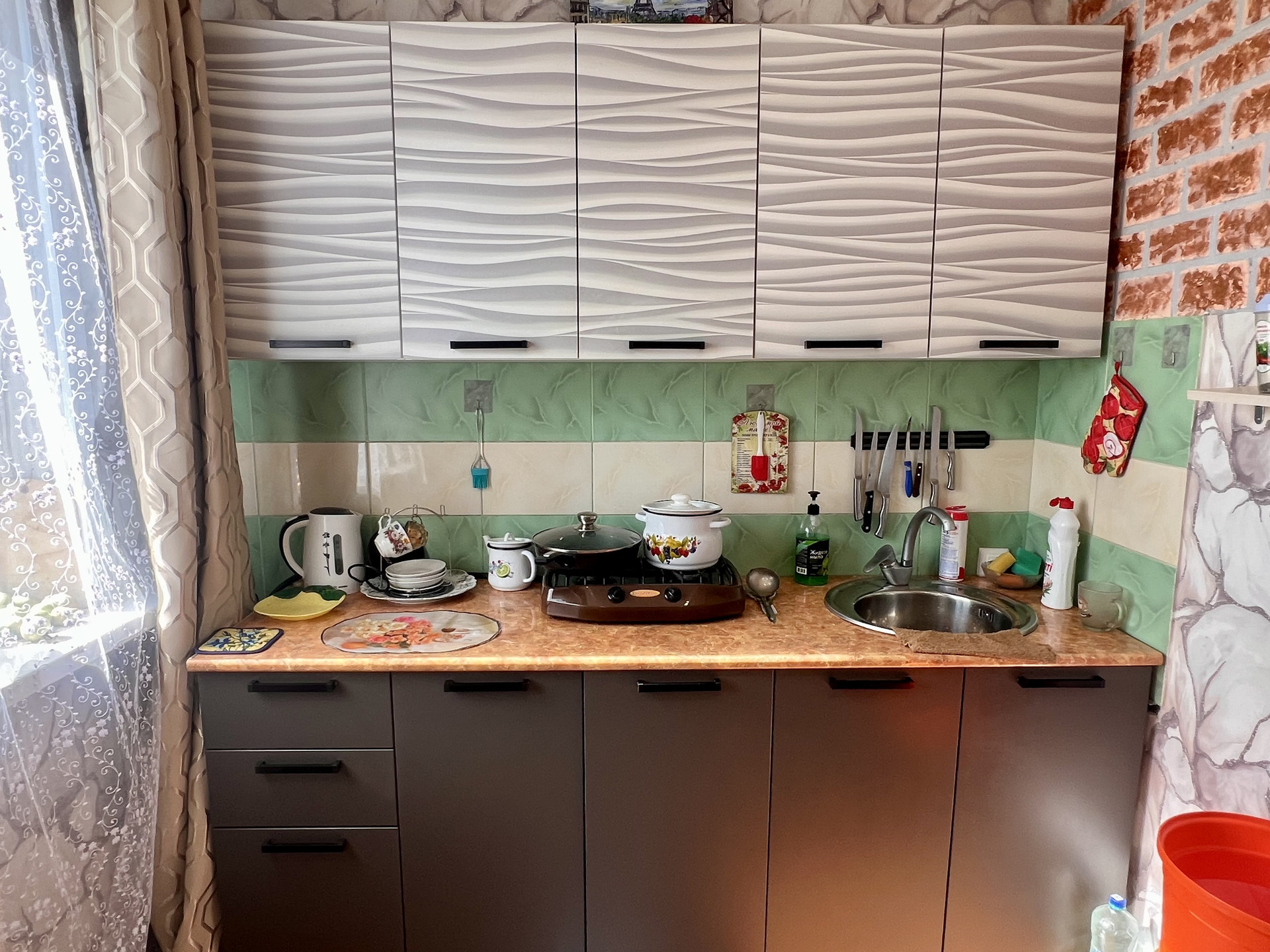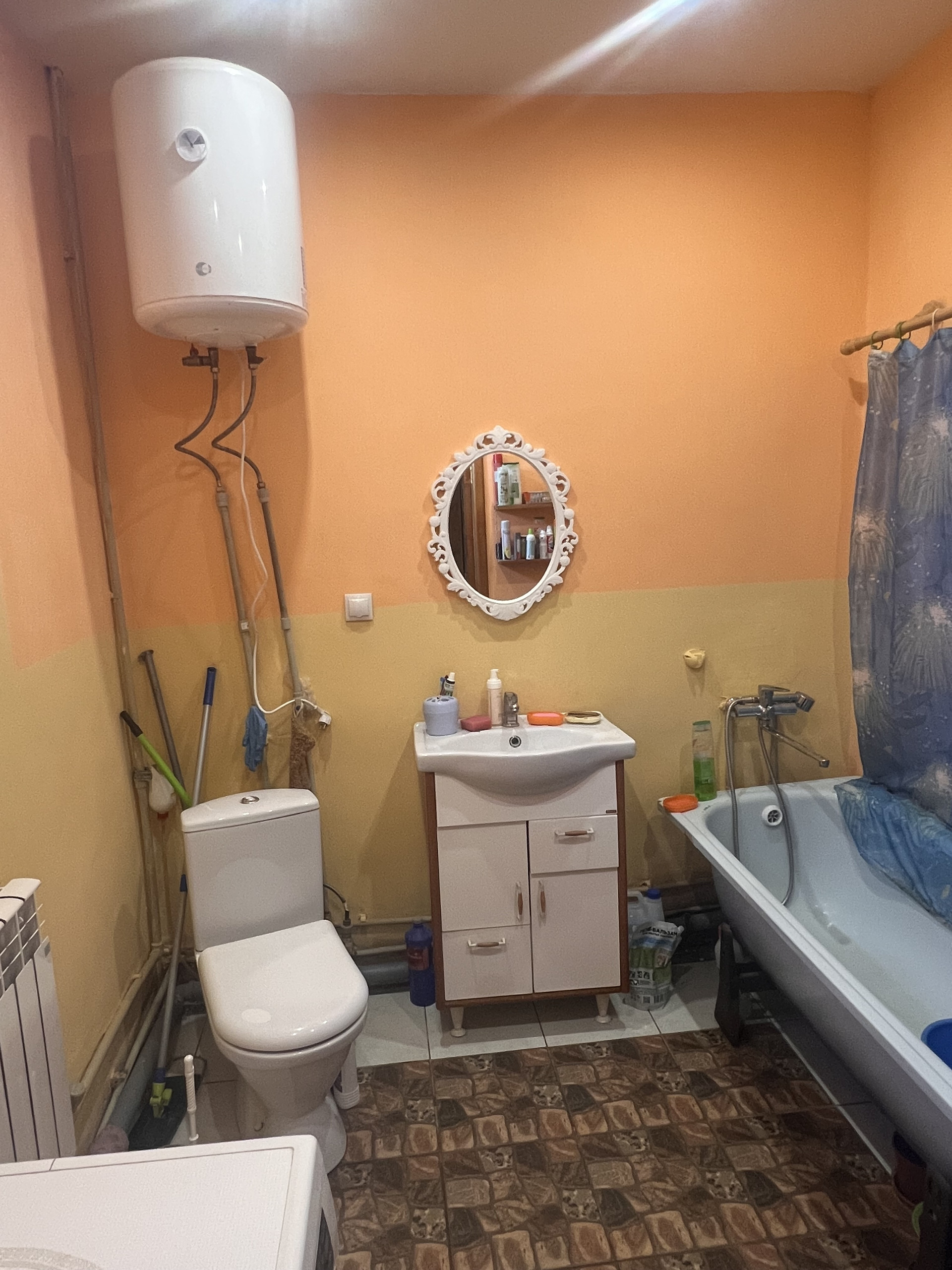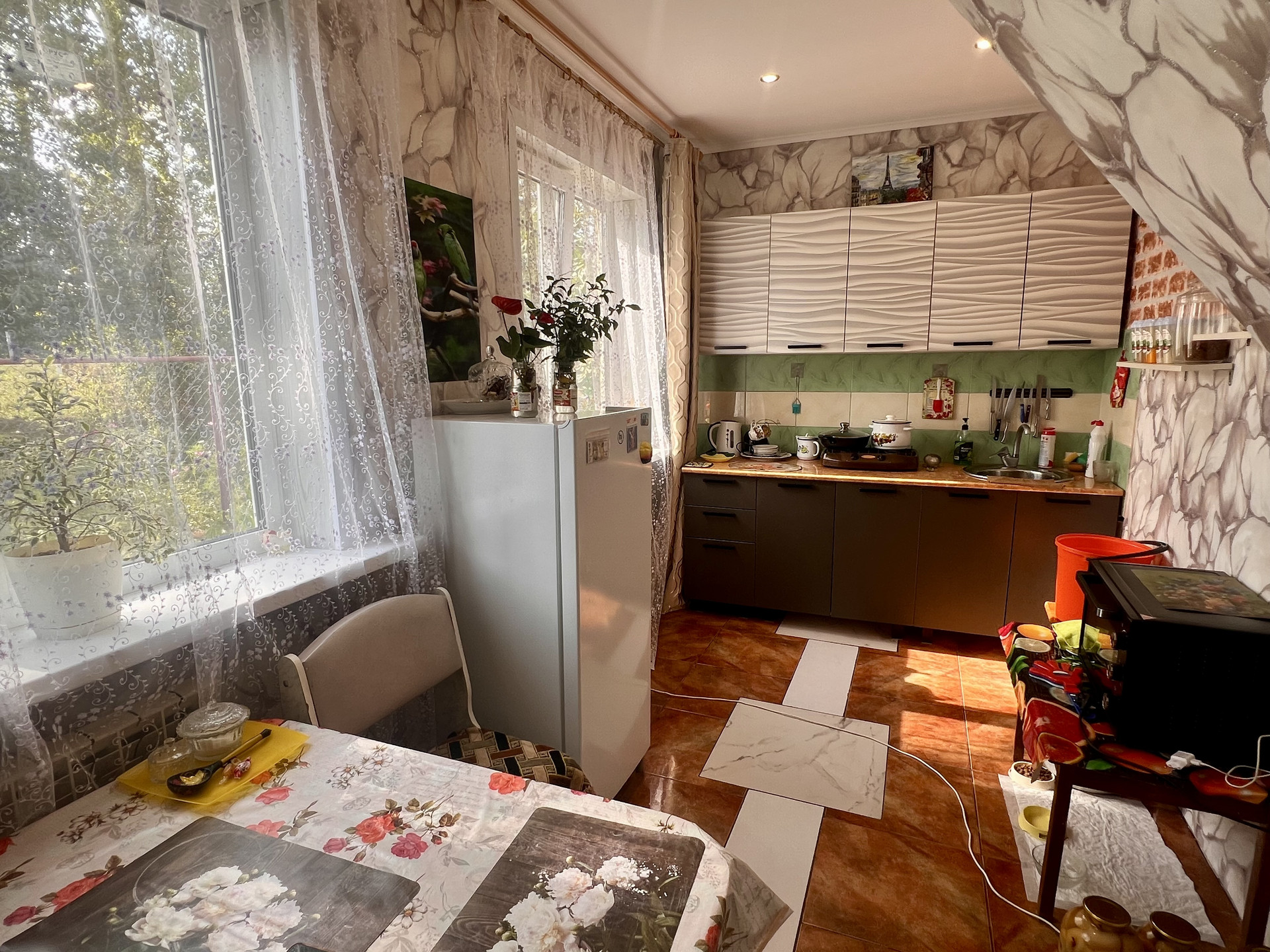 Кухня просторная, есть кухонный гарнитур. На полу кафель. Санузел большой, удобный.