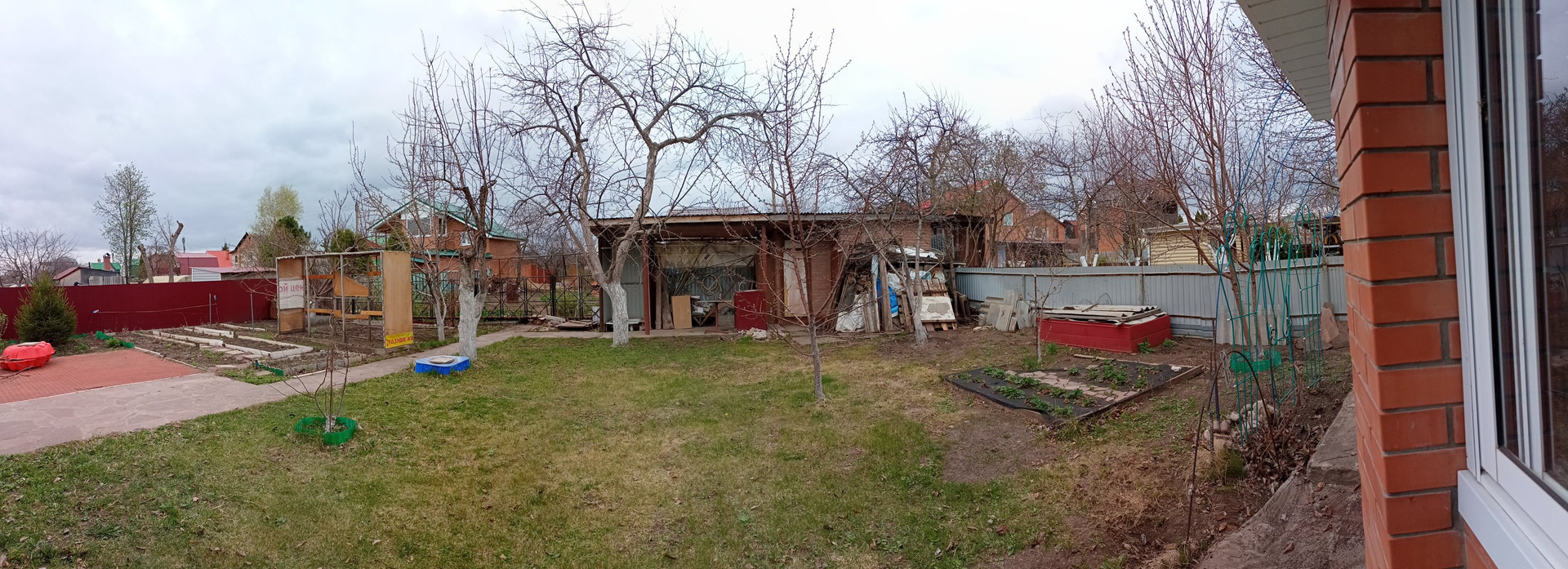 Деревья: яблони - 2 больших плодоносящих и 4 маленьких (2 обычных, 2 колоновидного типа), вишня - 3 штуки, груша - 1, абрикос - 1. Смородина - красная, черная. Ремонтантные малина и клубника, 2 куста крыжовника и по одному кусту ежевики и голубики.