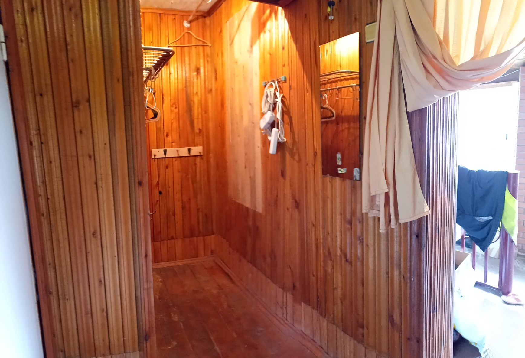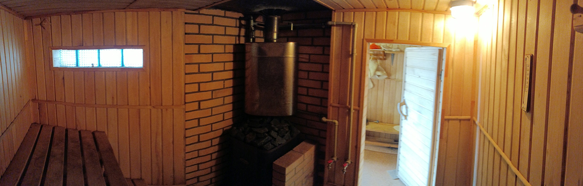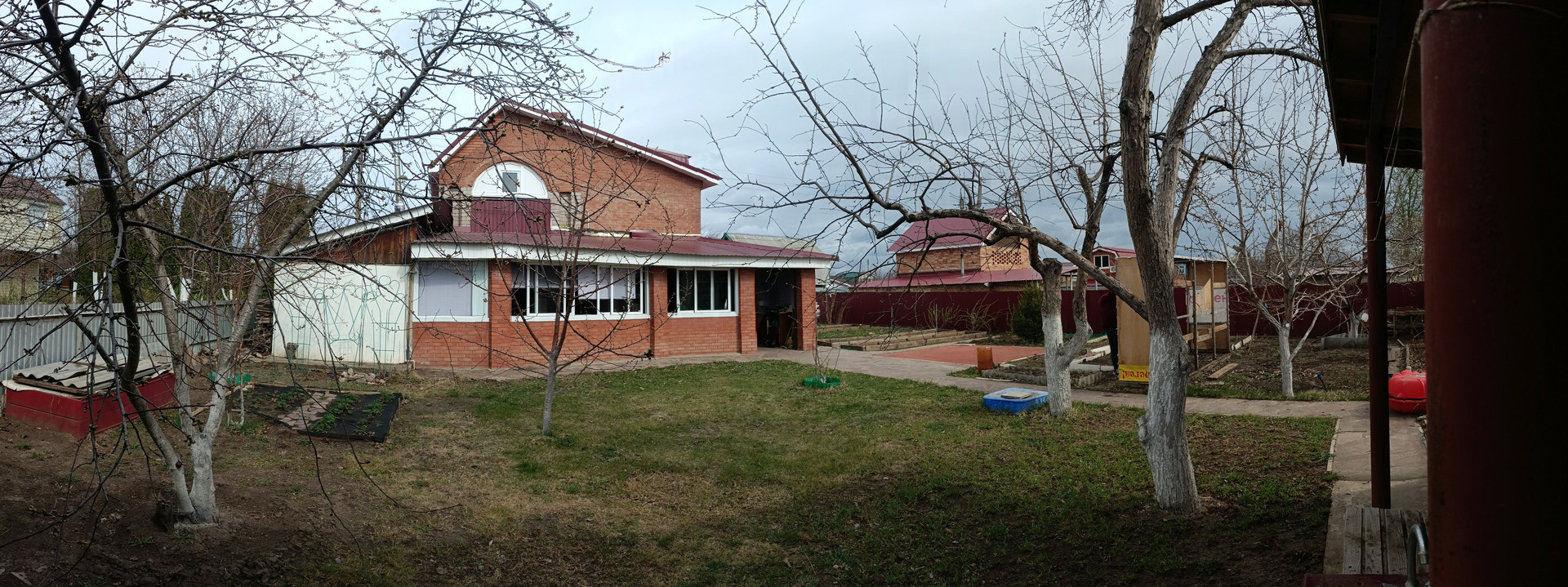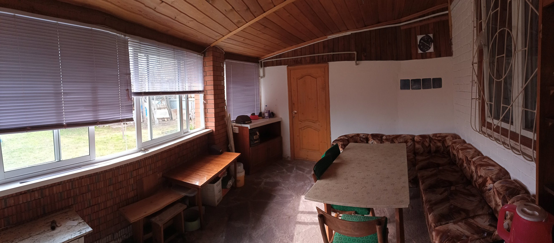 Дом кирпичный, 3 комнаты + кухня, веранда с двух сторон дома (бОльшая часть - для отдыха и времяпрепровождения, из неё же вход в баню, вторая - под летнюю кухню. В доме пластиковые окна с одинарным стеклопакетом, веранда остеклена - одна сторона раздвижными окнами на алюминиевой раме, вторая - пластиковыми окнами с одинарным стеклом, по периметру веранды - жалюзи.
