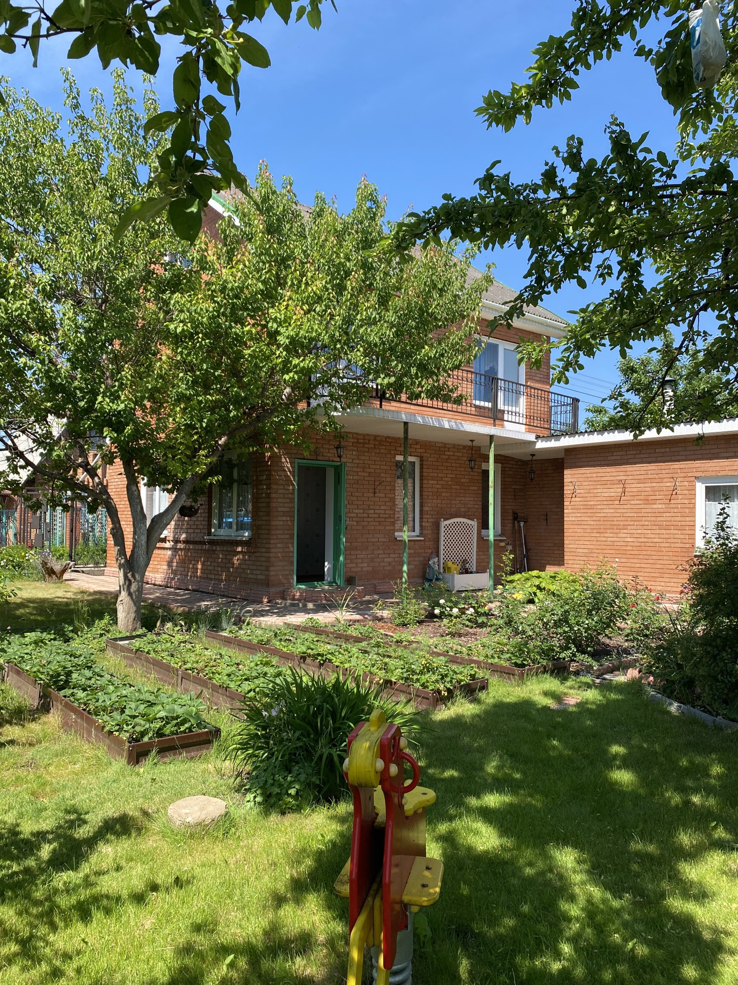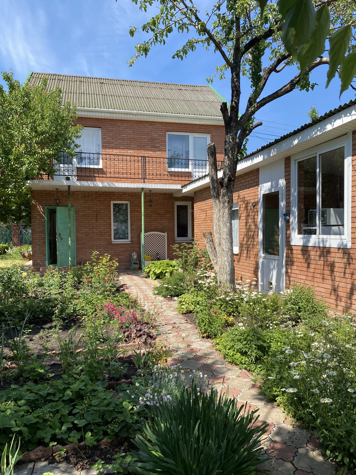 Уютный 2х этажный дом из блоков и обложен красным кирпичом , построен в 2010 году, крыша покрыта ондулином , если провести отопление , возможно проживать в зимний период ,по периметру забор.