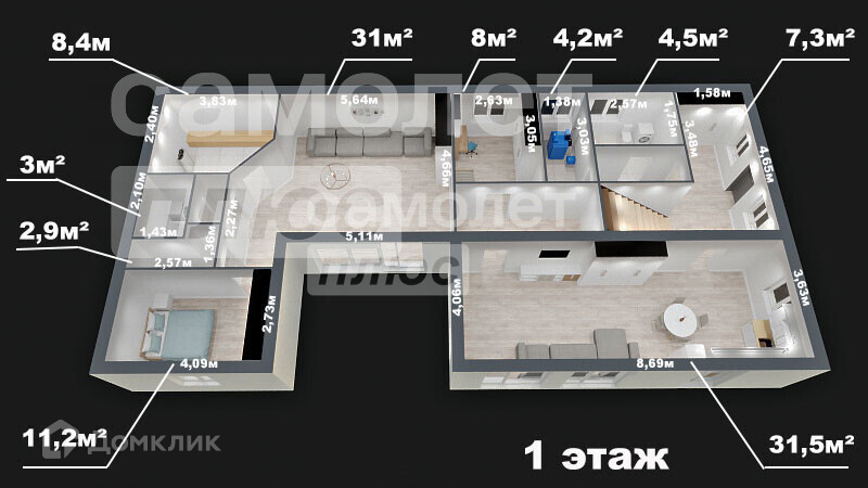 В объявление добавлена 3д планировка дома с указанием площадей помещений.