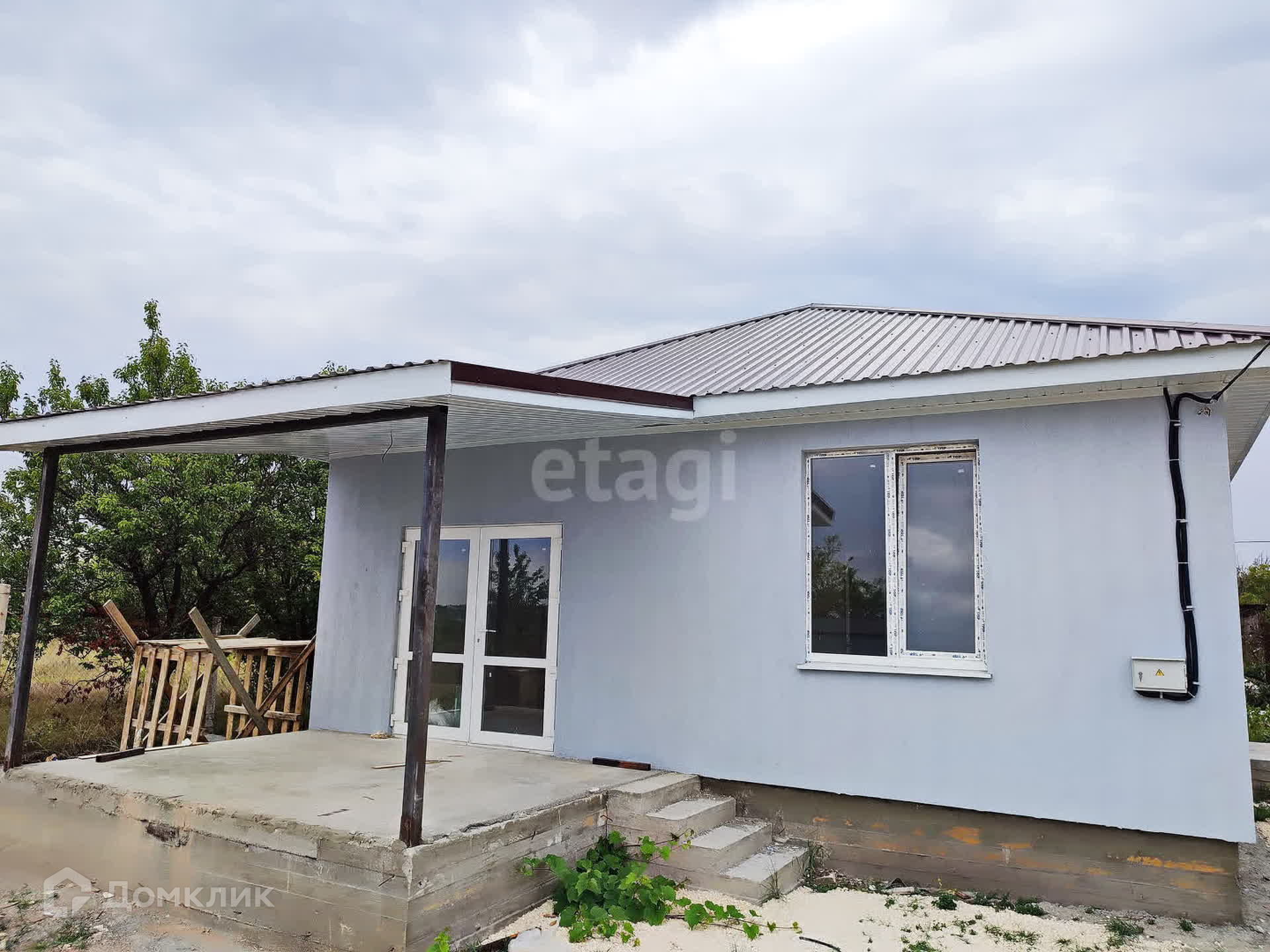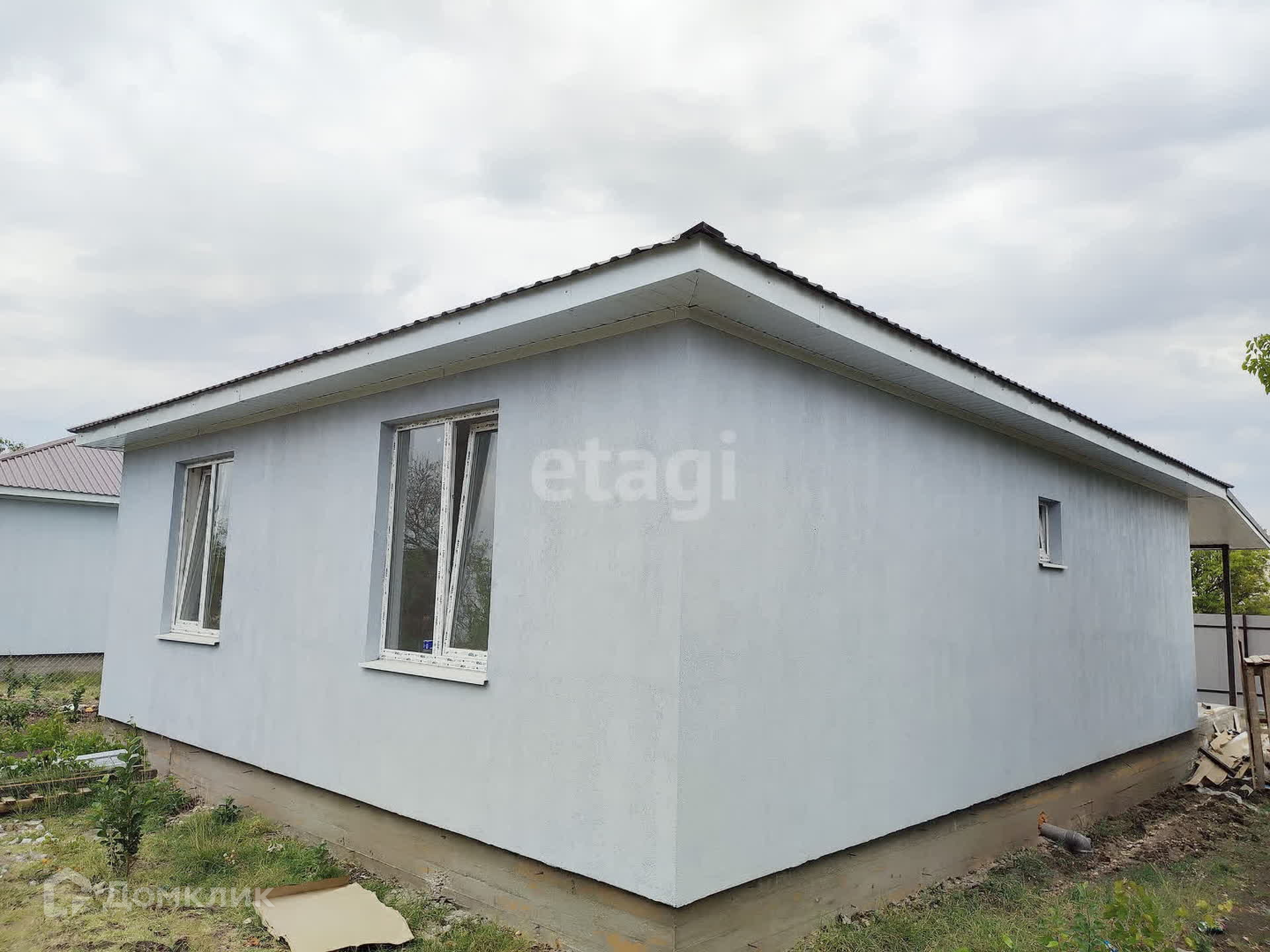 Дом выполнен из газоблока, утеплен пенопластом, крыша-профлист, большая выгребная яма.