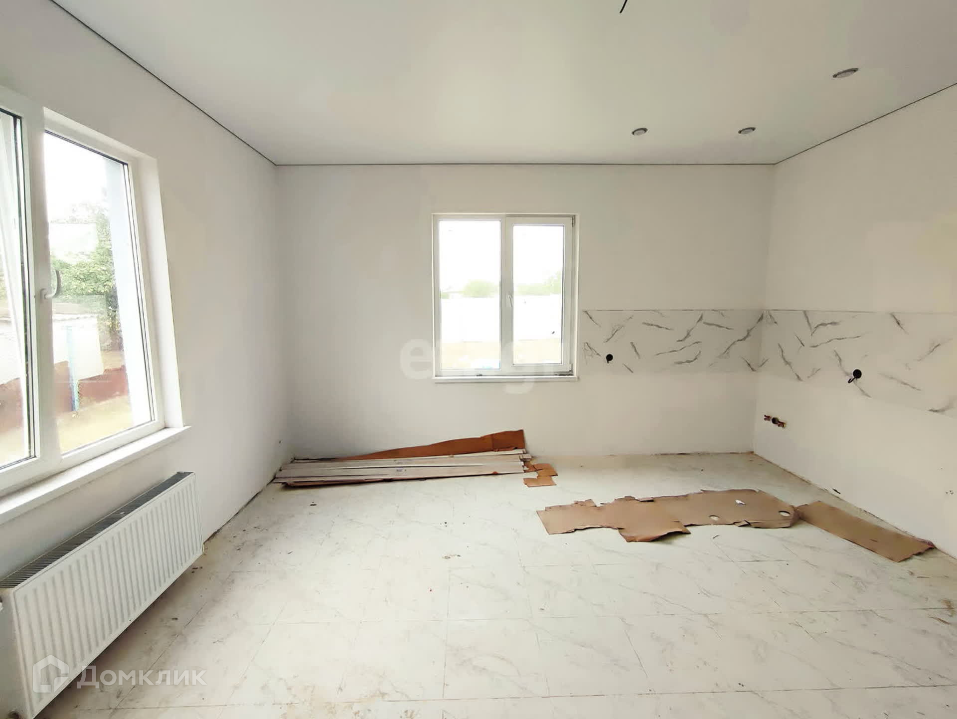 Общая площадь 90 кв.м, большая кухня-гостиная, 3 комнаты, санузел и техническое помещение. Заведено электричество, установлен электрокотел, в комнатах радиаторы на отопление, в остальных помещениях теплые полы.