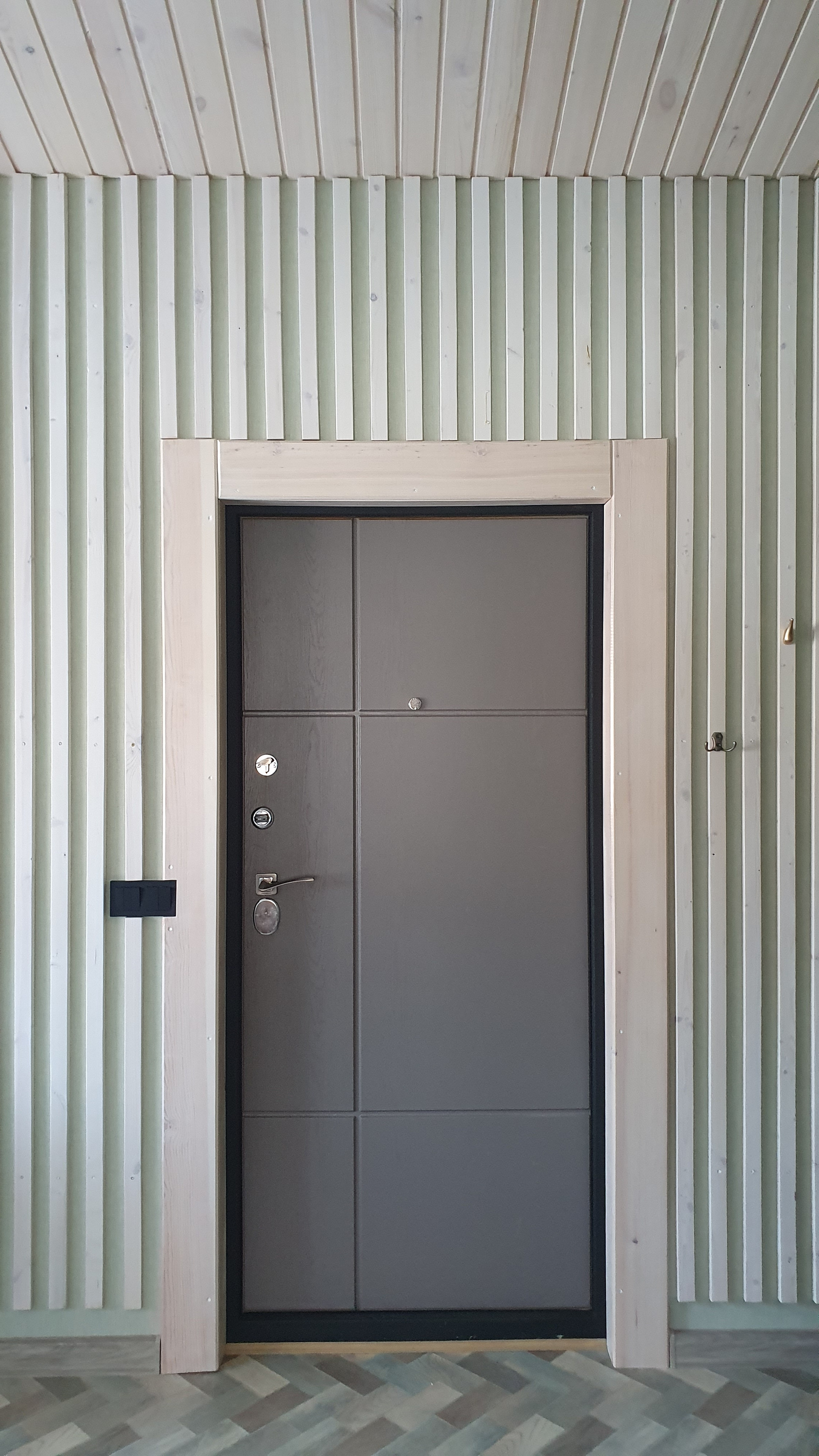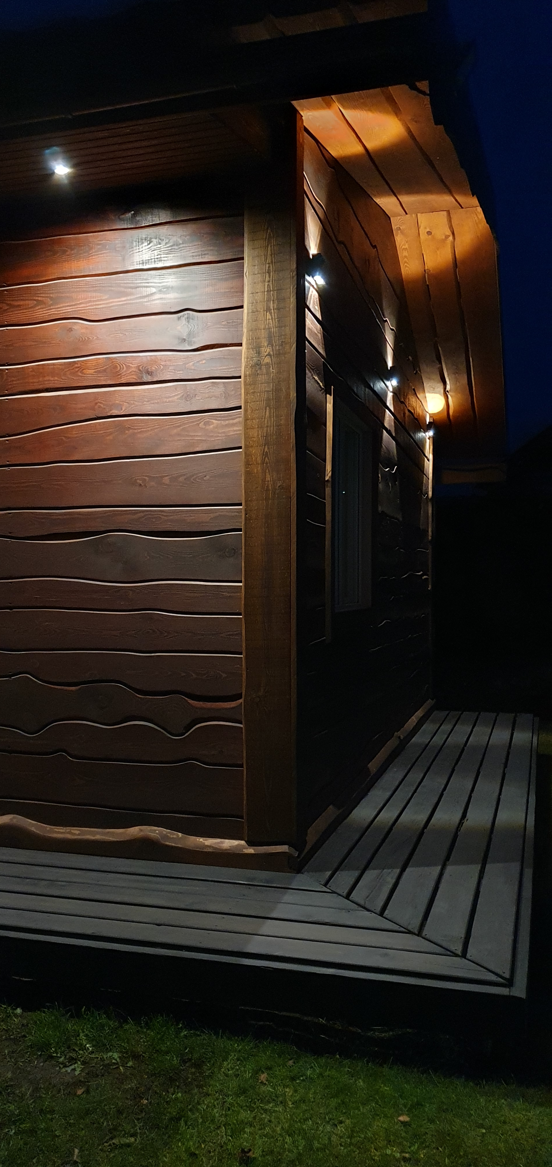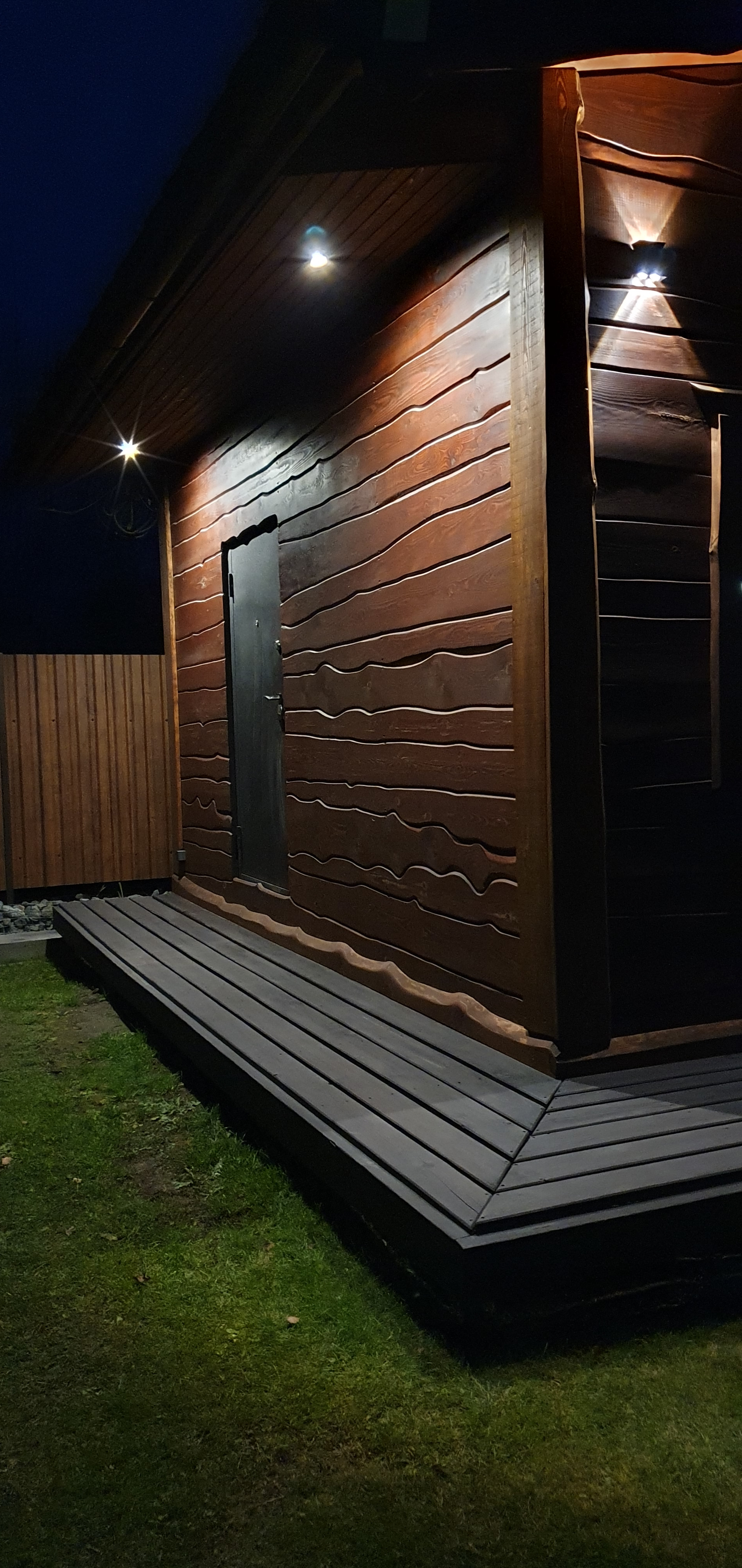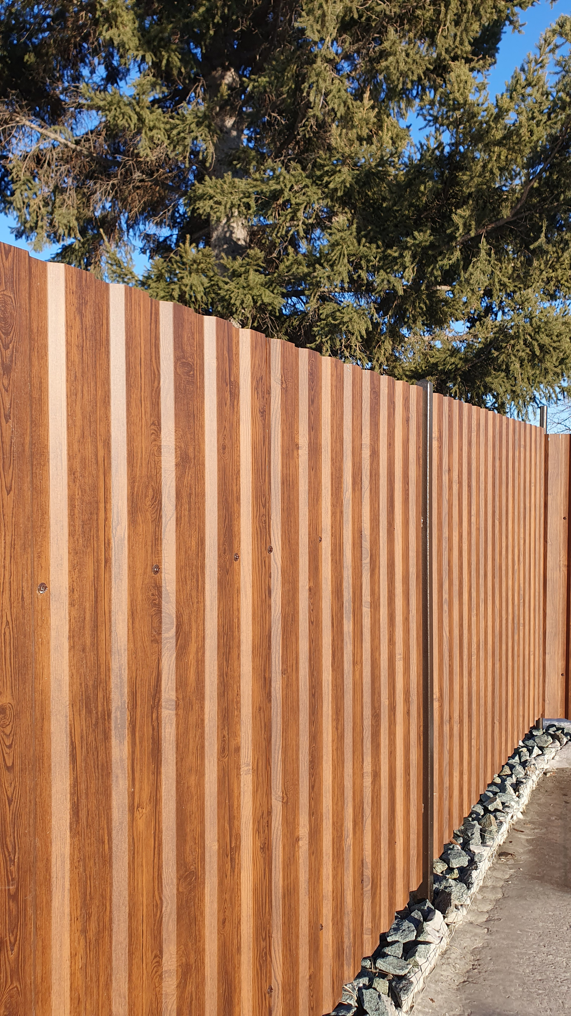 По бокам и задниму плану,обшит металлопрофиль золотистый дуб ECOSTEEL коллекция серии премьер,гарантия 30 лет.