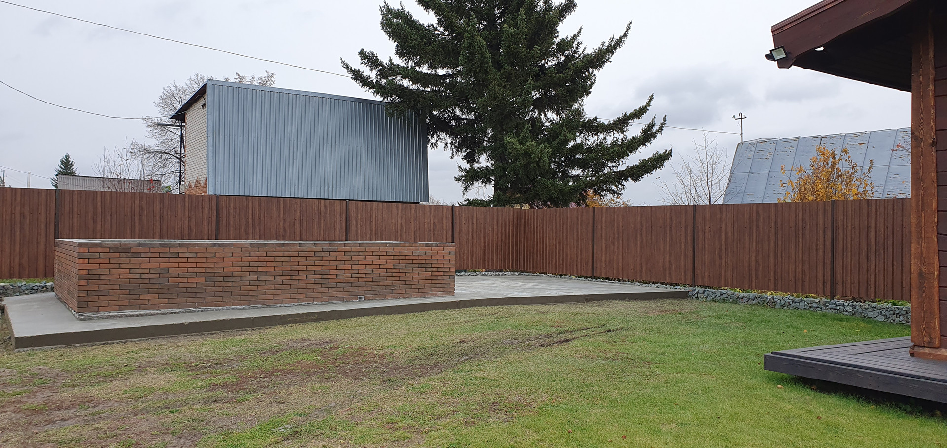 Участок полностью огорожен высоким забором,по всему периметру забора выполнен цоколь из габиона,