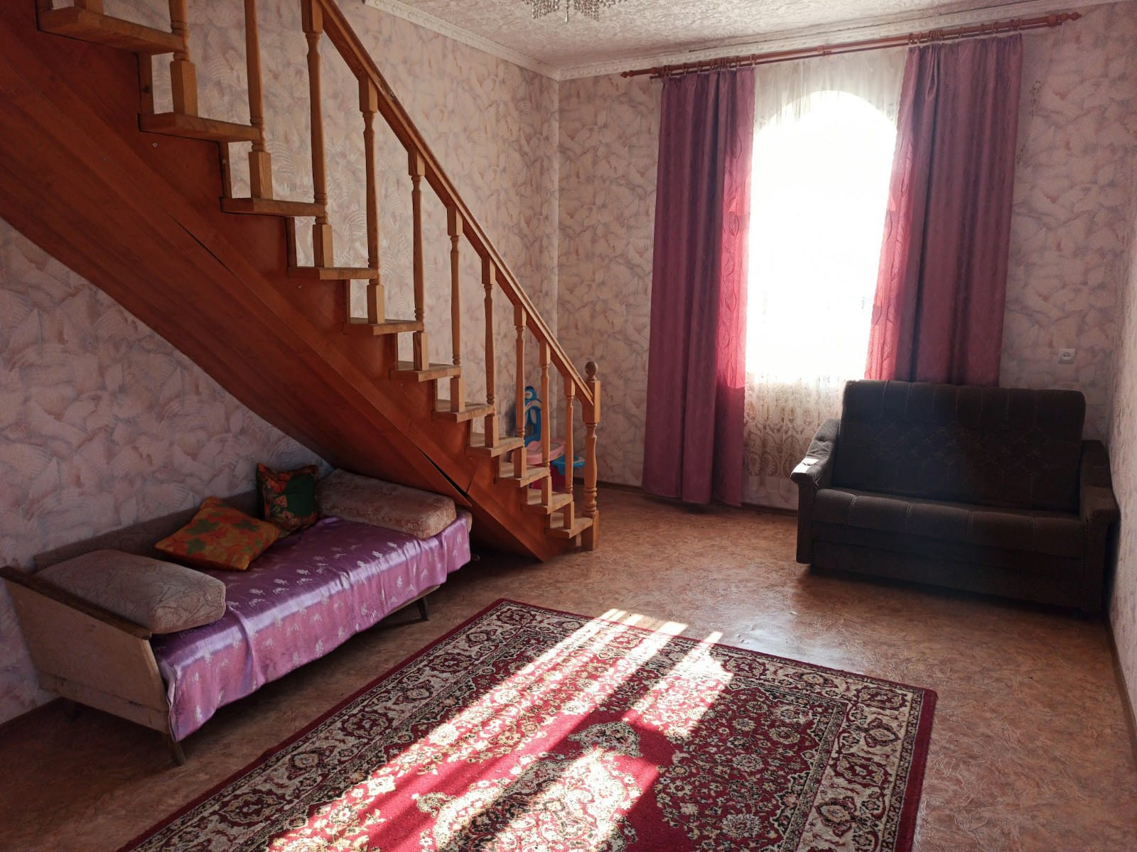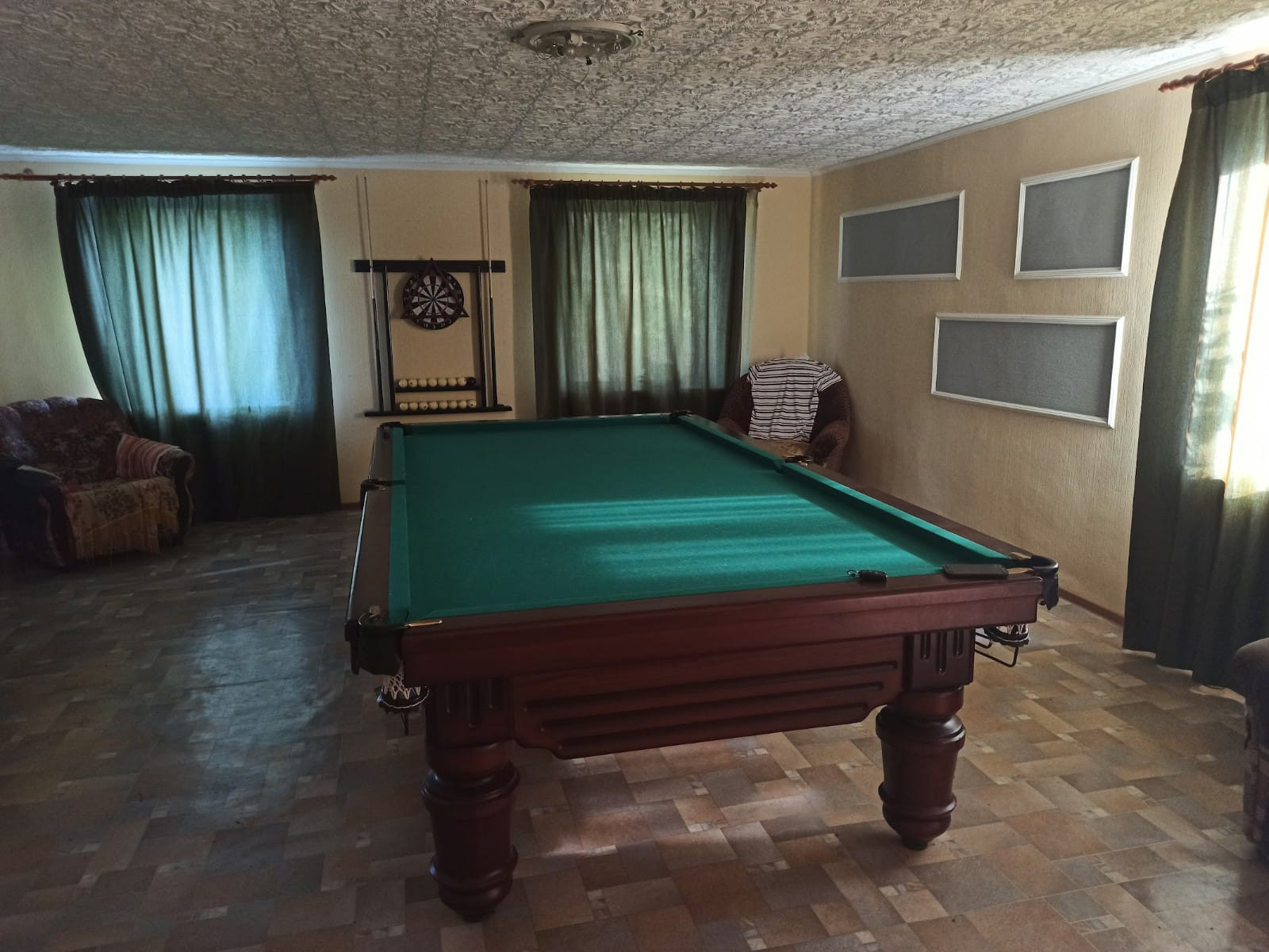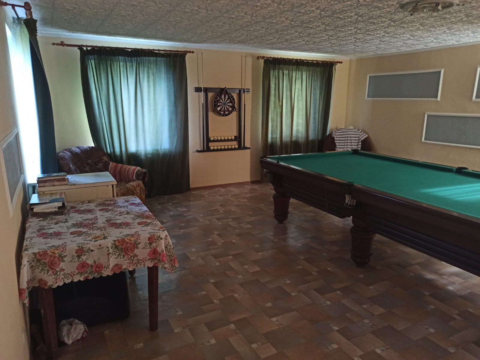 В доме несколько комнат, большая гостинная и зона отдыха, бильярдный стол, диван, встроенная кухонная мебель. Строительств велось "для себя".