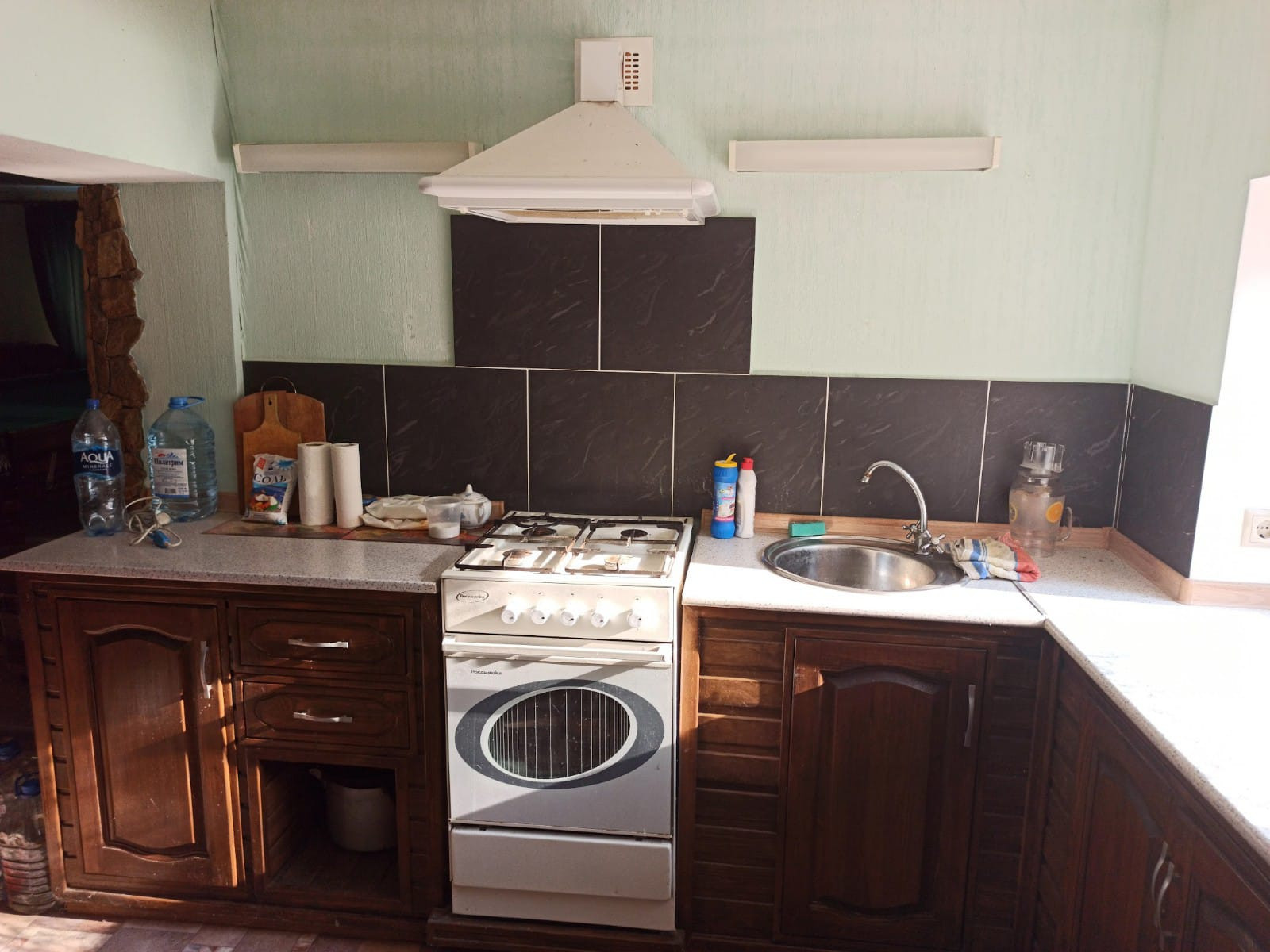 Для плиты используется газовый баллон, под слив канализации используются "кольца", водоснабжение поступало из скважины. Электричество три фазы 380ват.