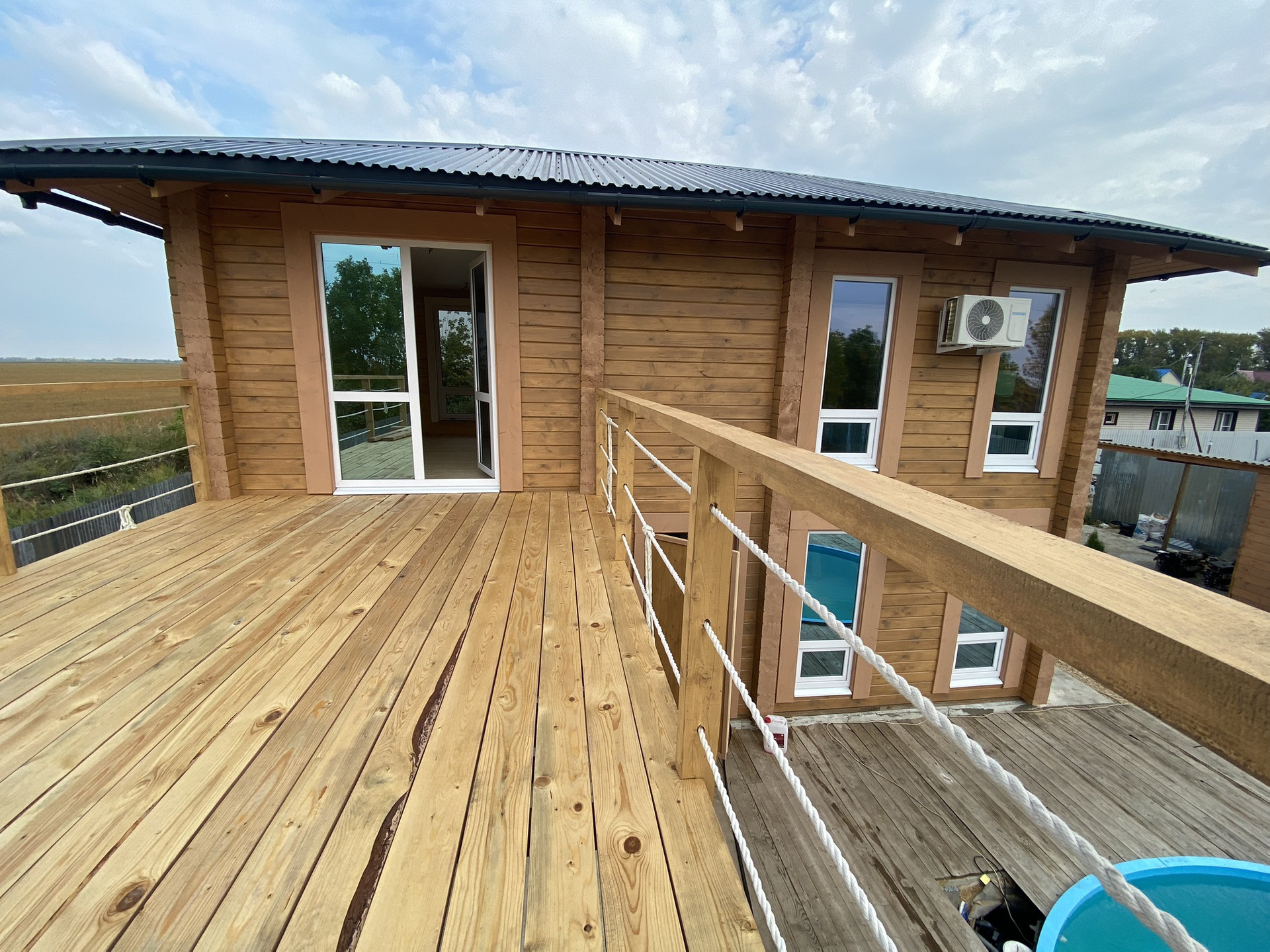 Дом из профилированного бруса 200х150 камерной сушки, 2 этажа, 65м2. 1-й этаж: большой с/у, т/п, гостиная. 2-й этаж: 2 комнаты. Фундамент УШП (обогрев «теплые полы»). Внутри дома -собственная скважина (37м). Проведена наружная и внутренняя покраска стен. Потолки натяжные с разводкой освещения. Электротехнические работы выполнены на 95%.