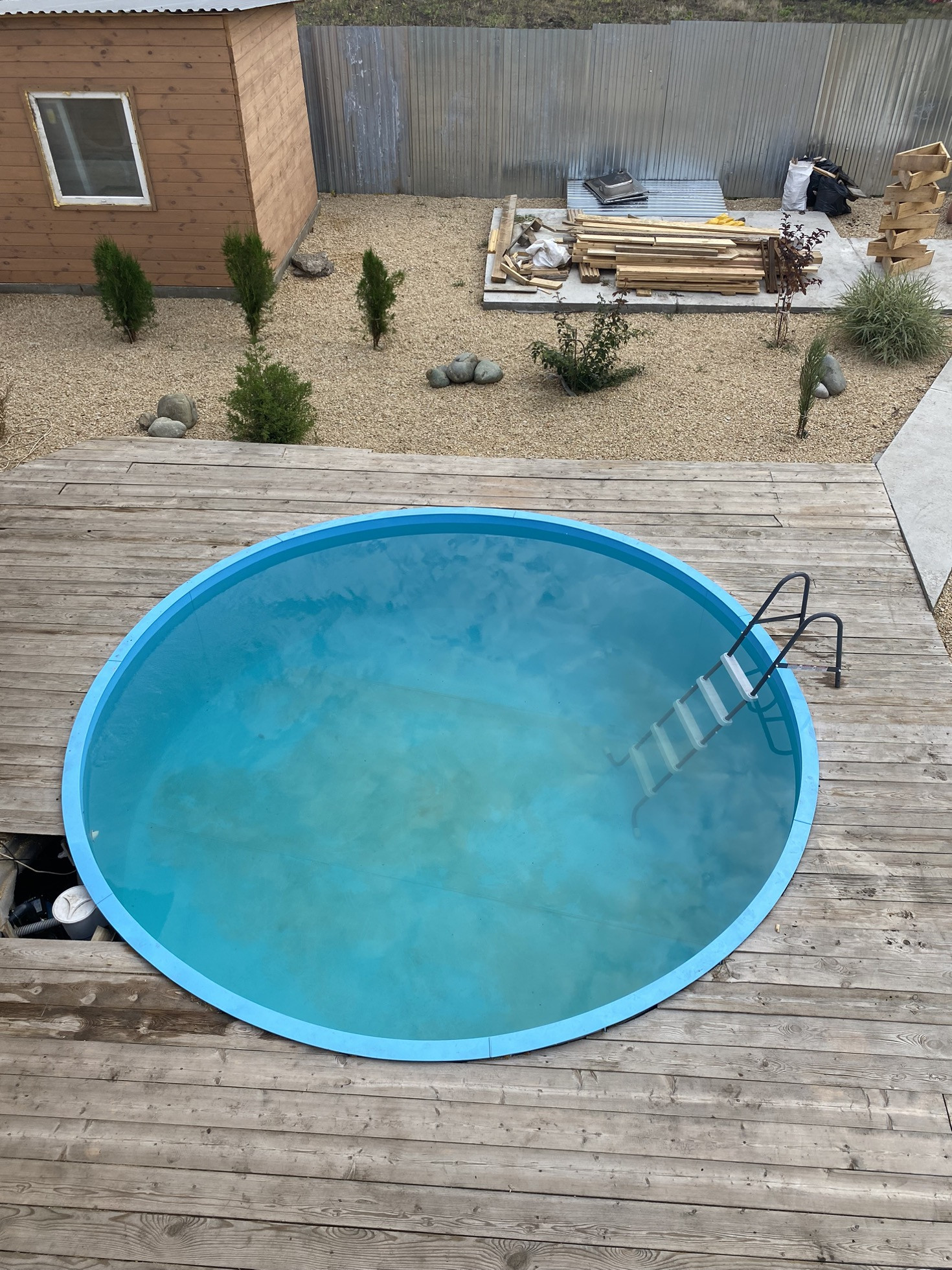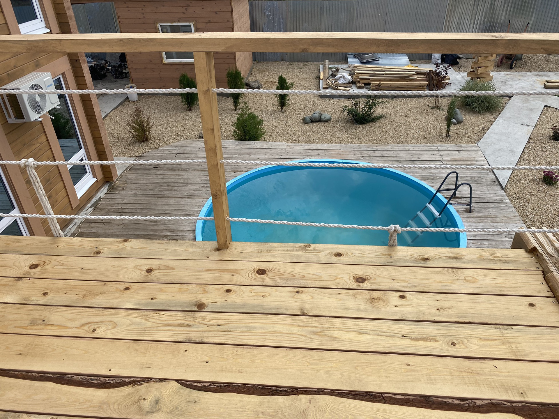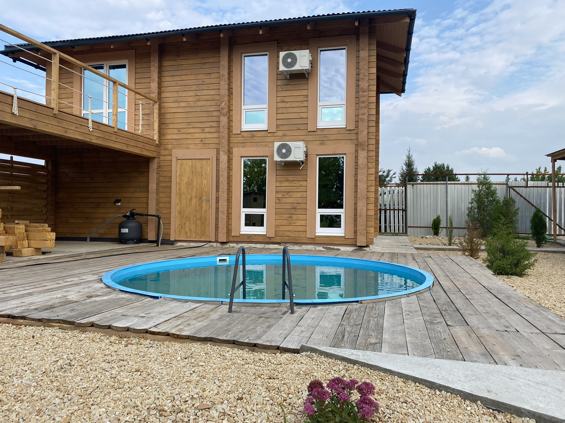 В зоне отдыха- бассейн (чаша из полипропилена, диаметр 4 м, на бетонном утепленном основании с хорошей фильтрационной  системой), открытая терраса со стационарной мебелью (кресла, диван, стол).