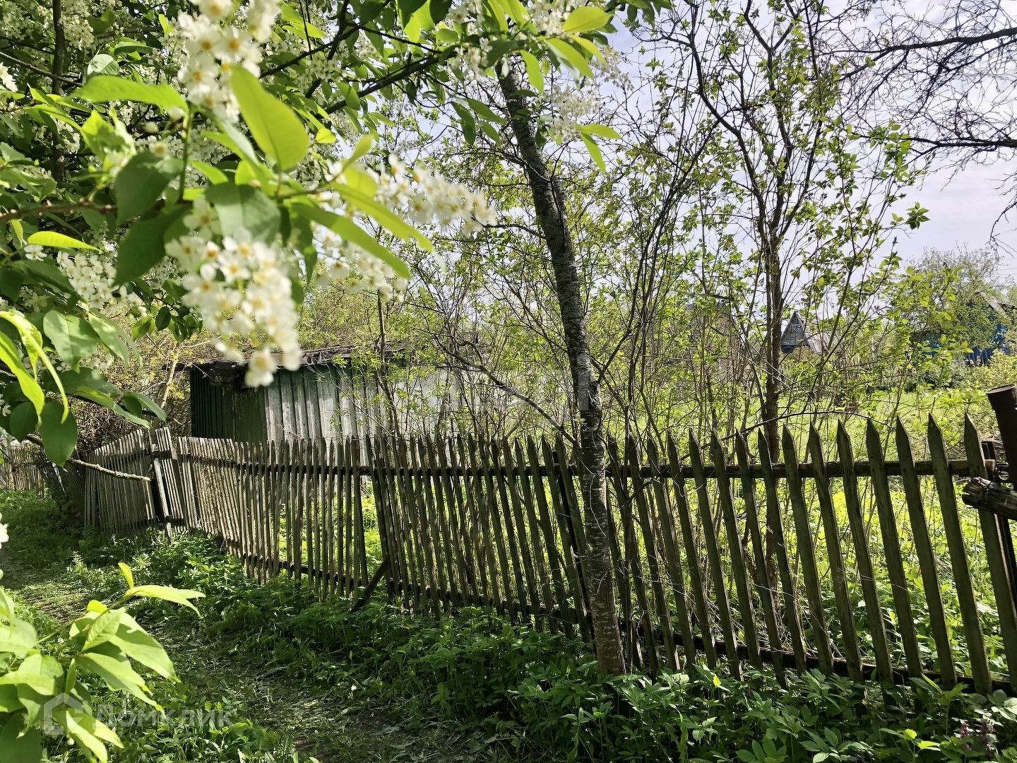 Есть домик для садового инвентаря. Из насаждений: черная и красная смородина, крыжовник, малина, слива, яблоня, боярышник, сирень, жасмин.