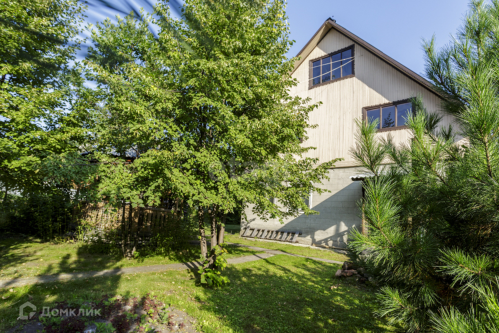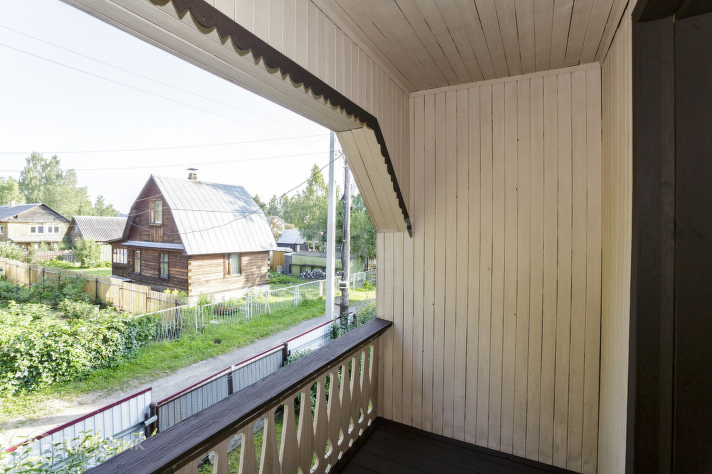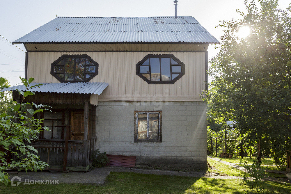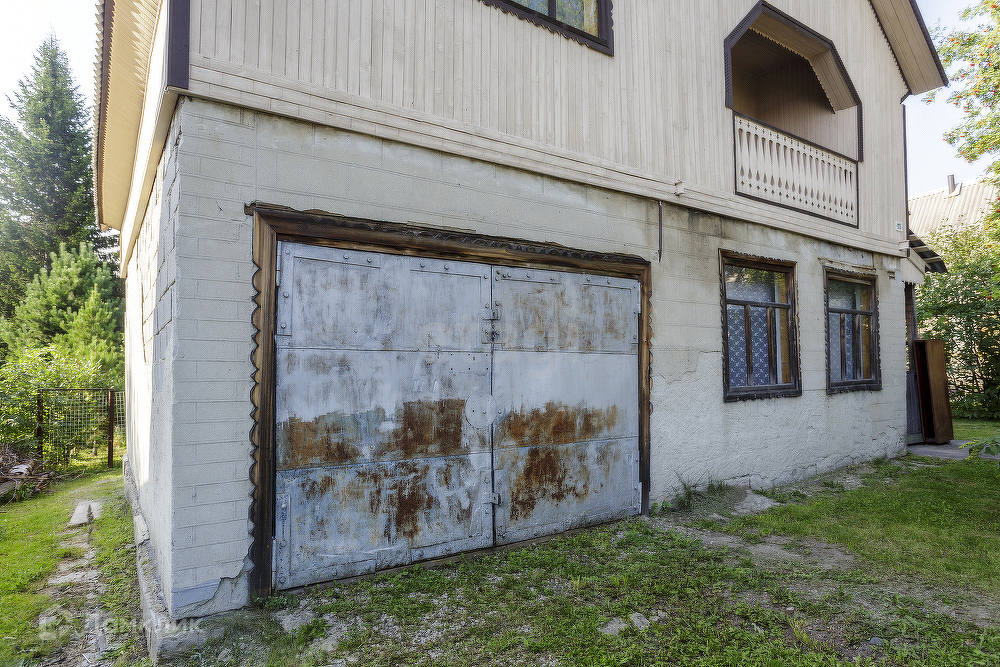 Большой летний дом 7*8 м, с камином на втором этаже. Первый этаж из шлакоблока, снаружи оштукатурен и покрашен. Второй этаж из бруса, внутри и снаружи всё обшито вагонкой, кровля покрыта оцинкованным листом, окна деревянные. В доме есть капитальный гараж.
