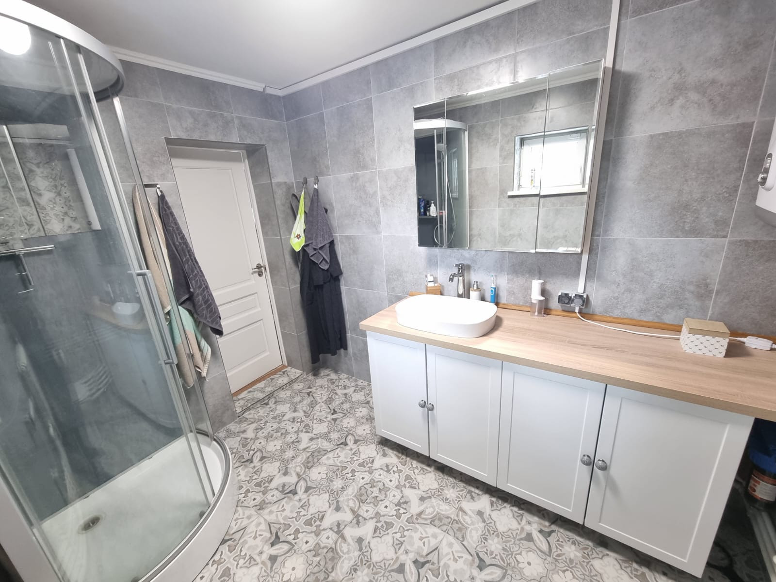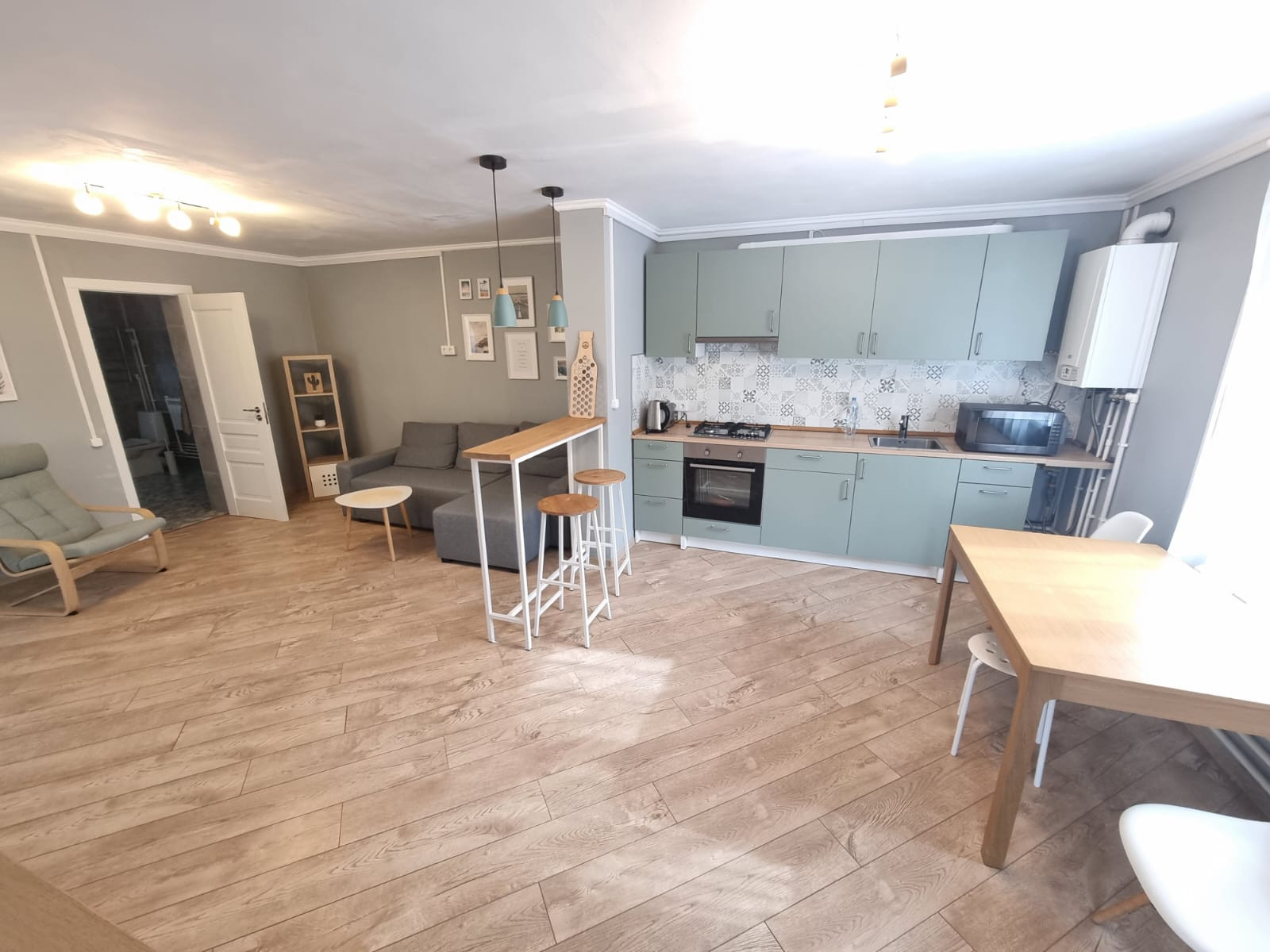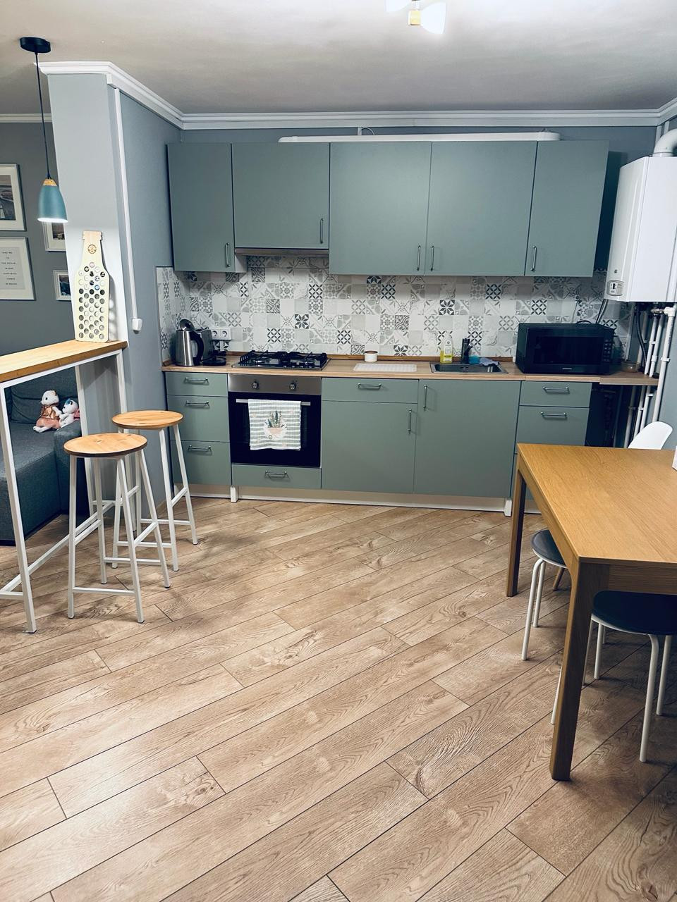 1 этаж: прихожая, кухня-гостинная, коридор, санузел (туалет, душевая кабина, раковина, бойлер на 100 л, очистные фильтры и насосная станция).