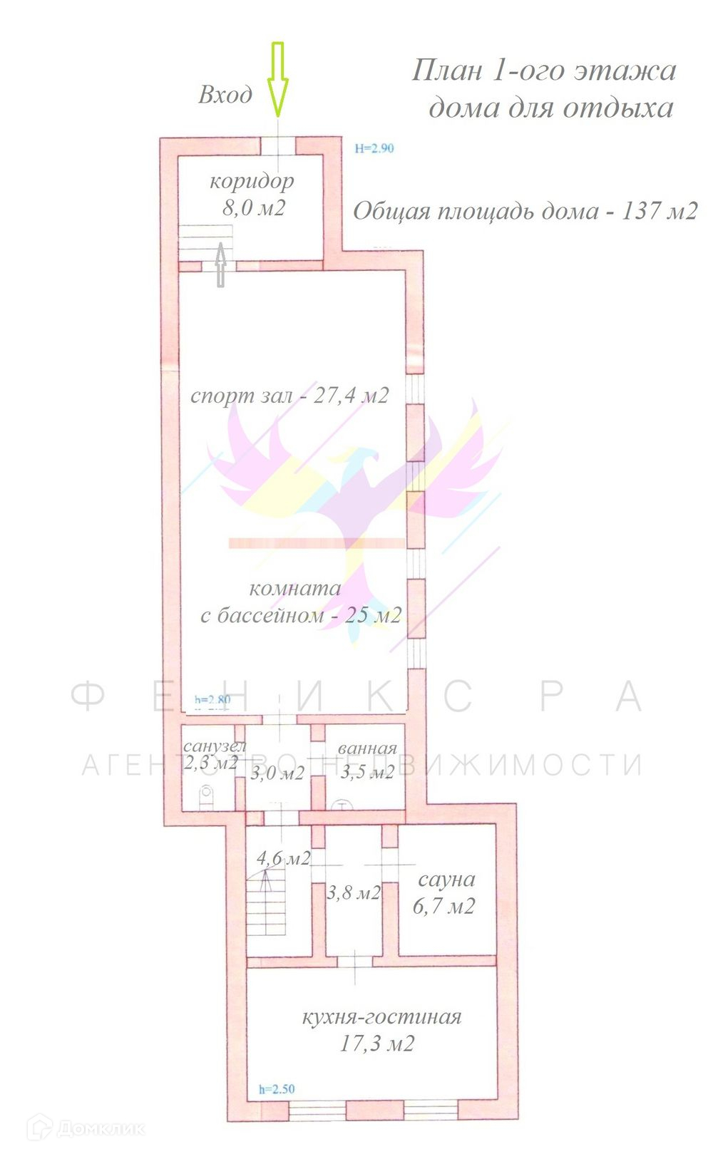 1-ый этаж: коридор - котельная 8,0 м2, спорт зал 27,4 м2, комната с бассейном 25 м2, кухня гостиная 17,3 м2, сауна 6,7 м2, ванная 3,5 м2, санузел 2,3 м2, высота потолка 2,80 метра.