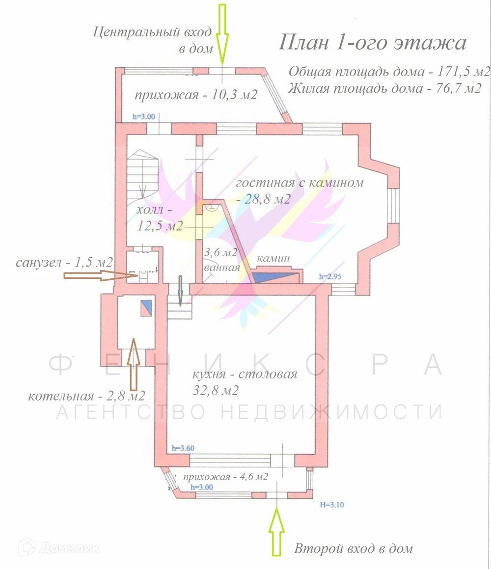 1-ый этаж: прихожая 10,3 м2, холл 12,5 м2, гостиная с дровяным камином 28,8 м2, кухня столовая 32,8 м2 с теплым полом, ванная 3,6 м2, санузел 1,5 м2, вторая прихожая 4,6 м2, котельная 2,8 м2, высота потолка 3,0 метра.