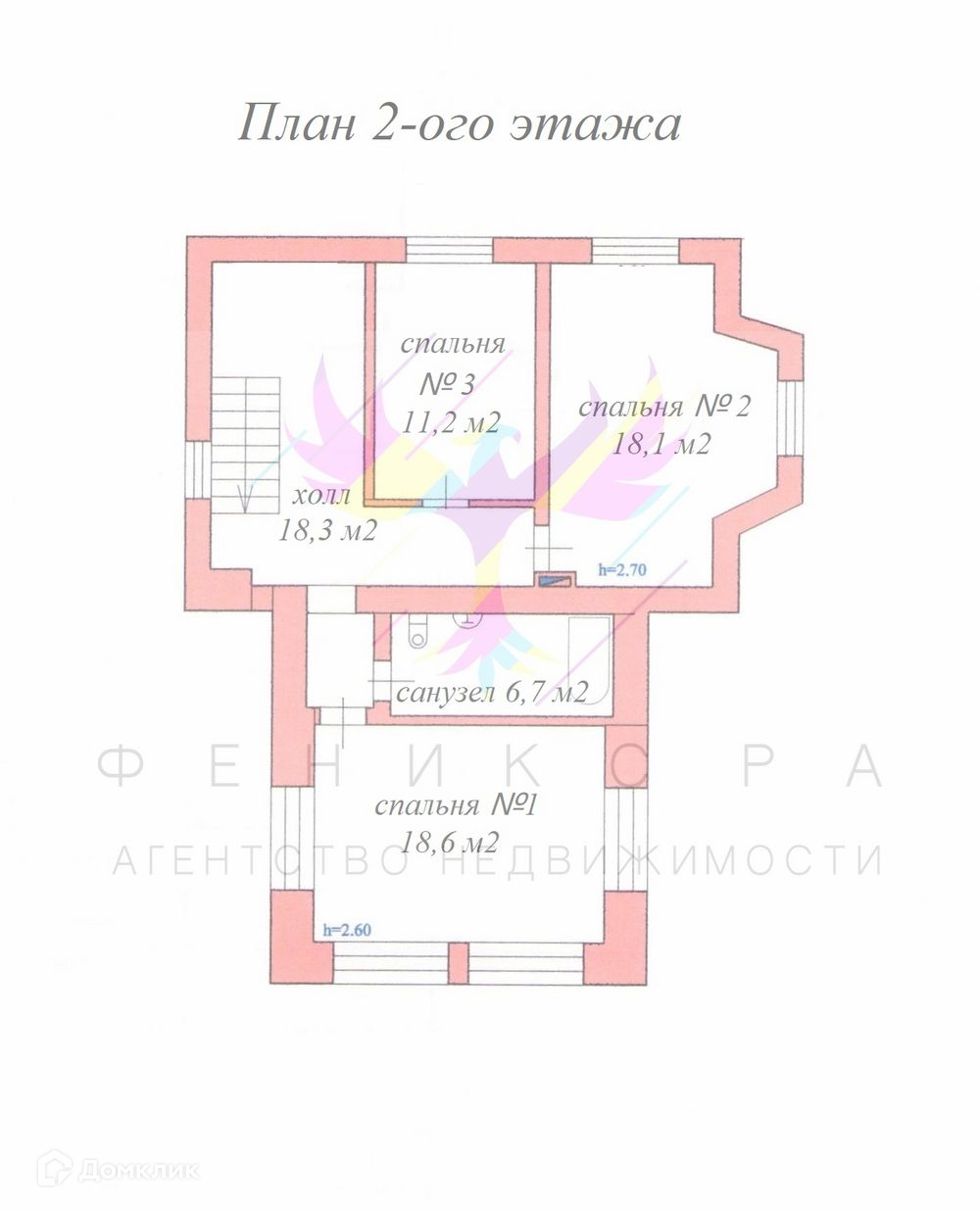 2-ой этаж, мансардный: холл 18,3 м2, спальня №1 18,6 м2 со своим санузлом 6,7 м2, спальня №2 18,1 м2, спальня №3 11,2 м2, высота потолка 2,70 метра.