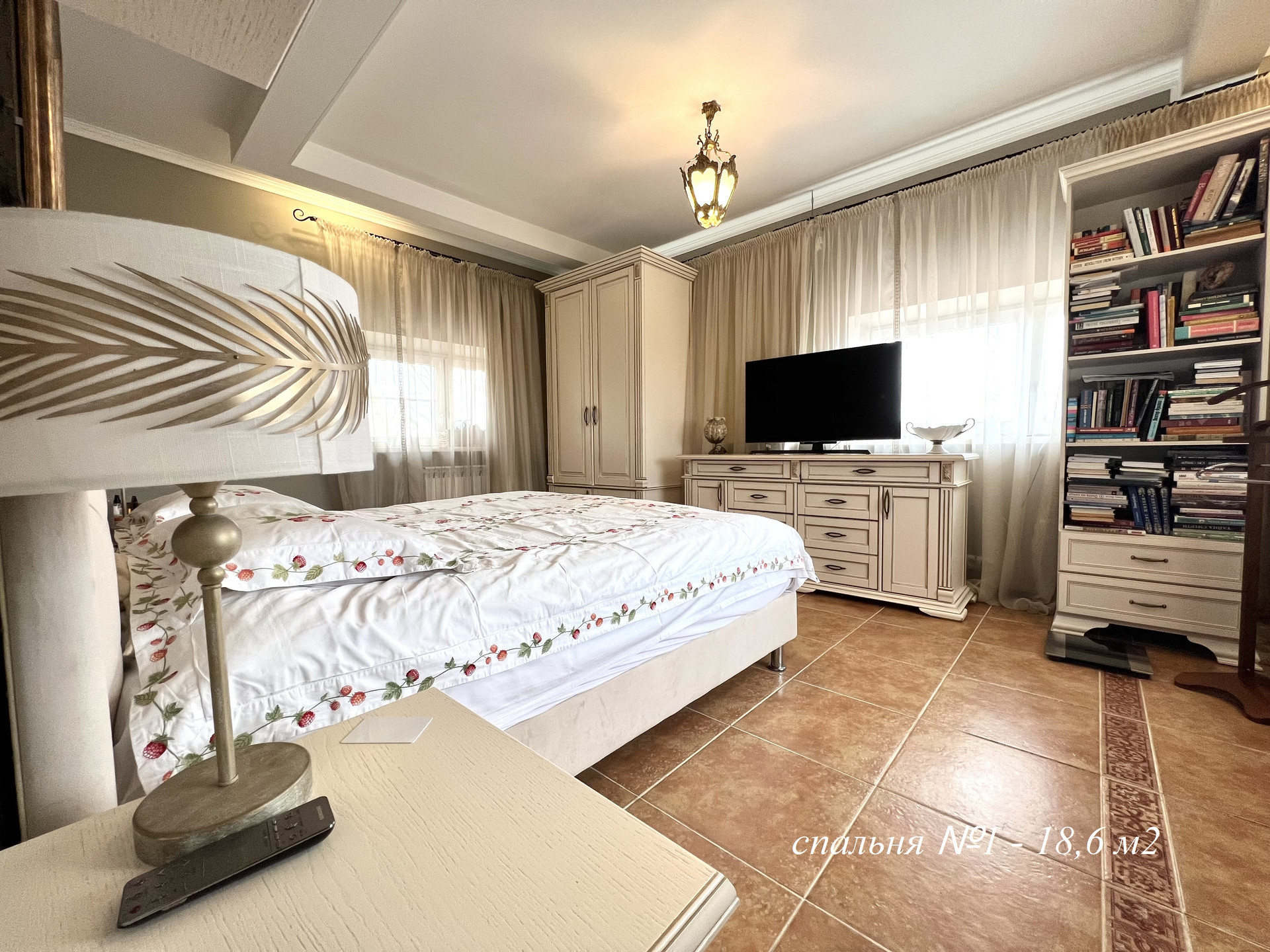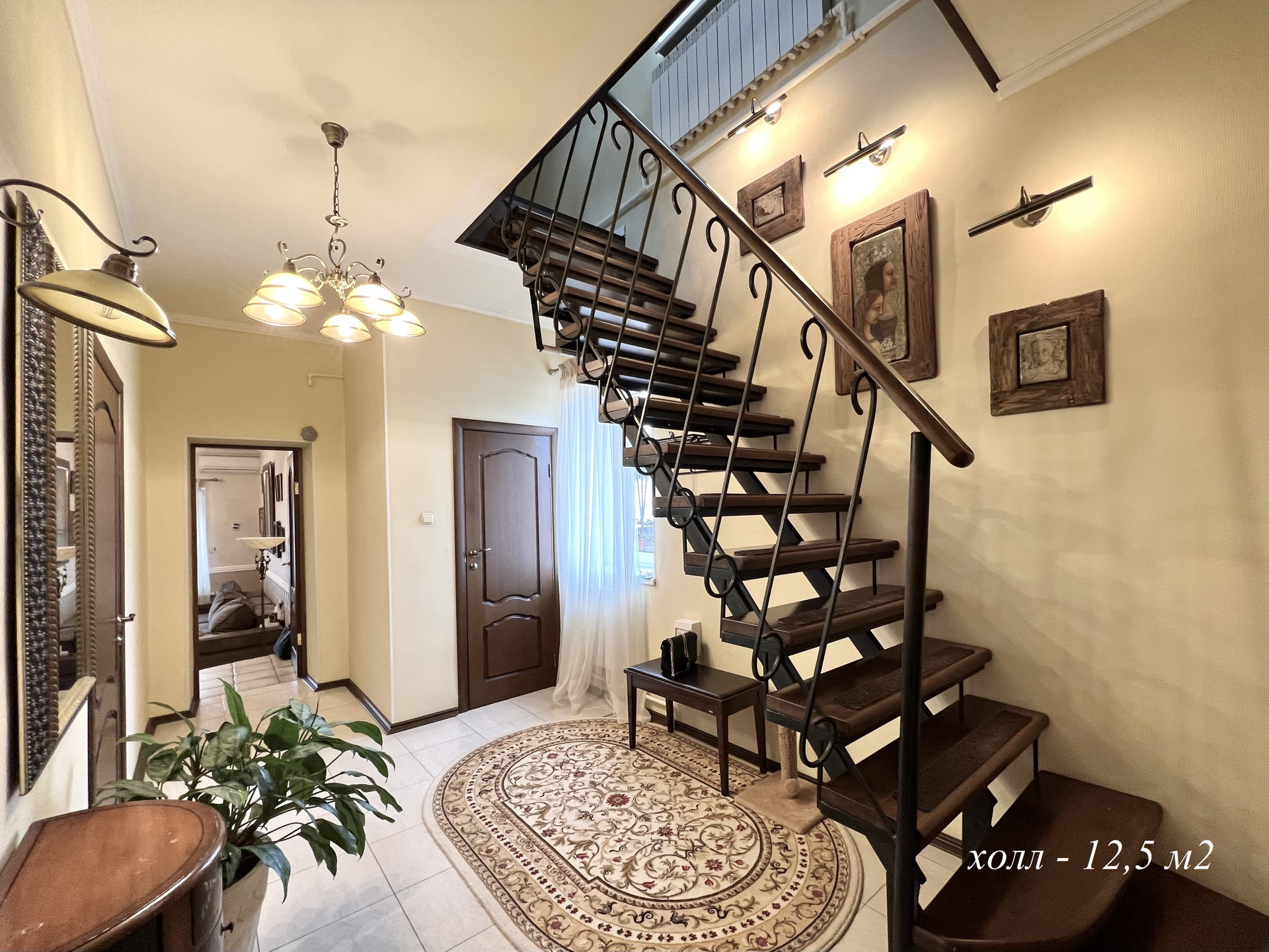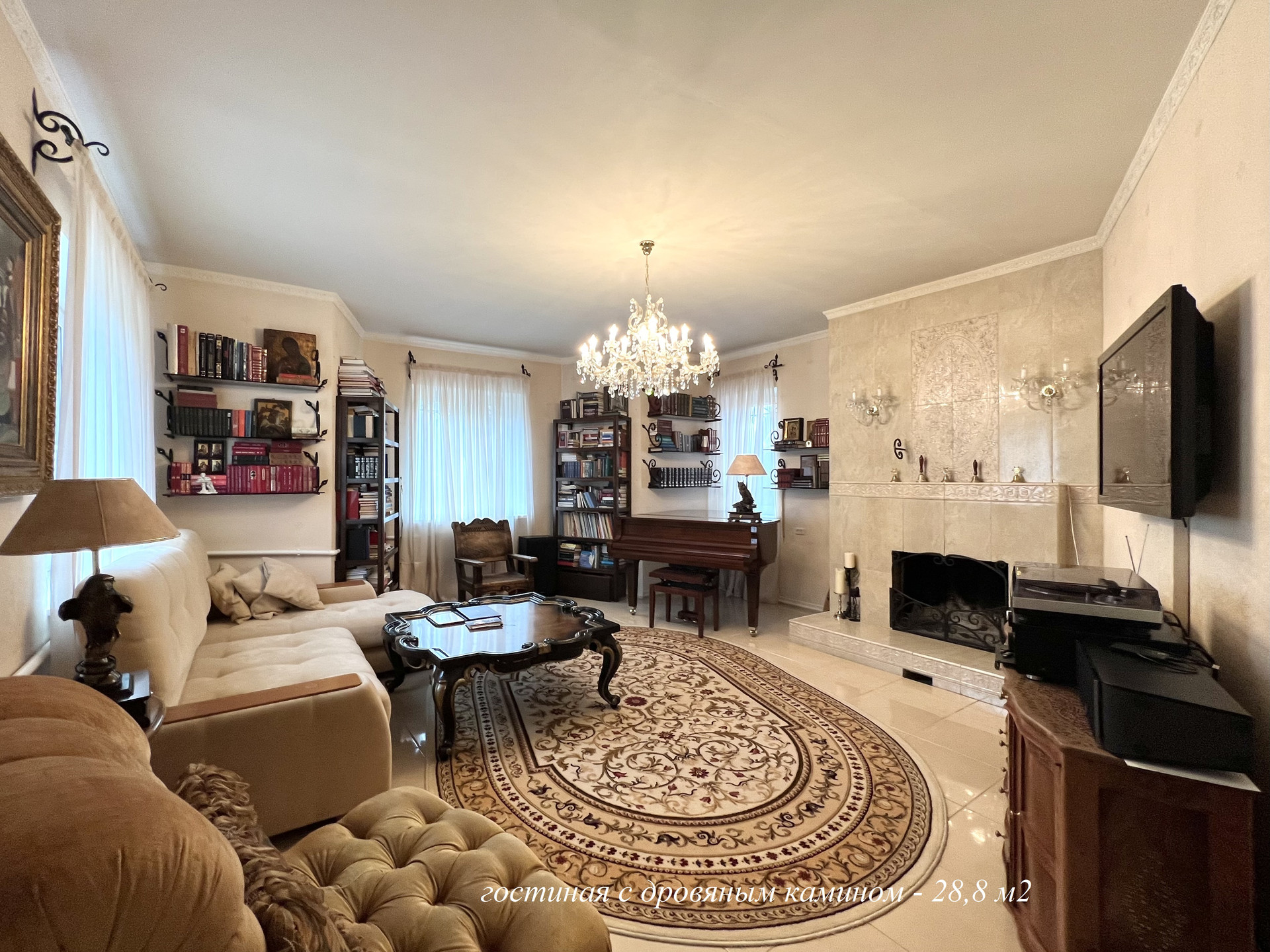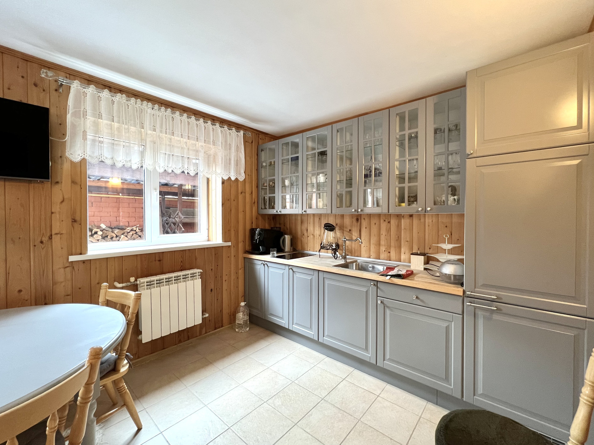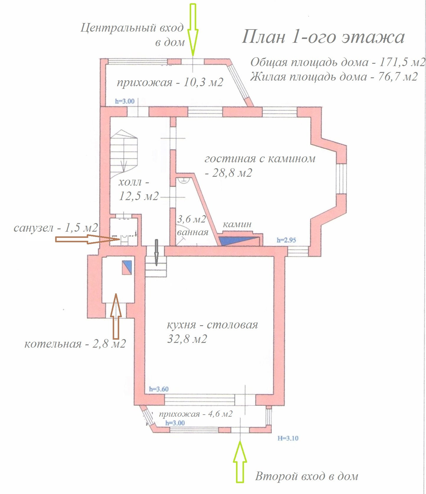 1-ый этаж: прихожая – 10,3 м2, холл – 12,5 м2, гостиная с дровяным камином – 28,8 м2, кухня – столовая – 32,8 м2 с теплым полом, ванная – 3,6 м2, санузел – 1,5 м2, вторая прихожая – 4,6 м2, котельная – 2,8 м2, высота потолка – 3,0 метра.