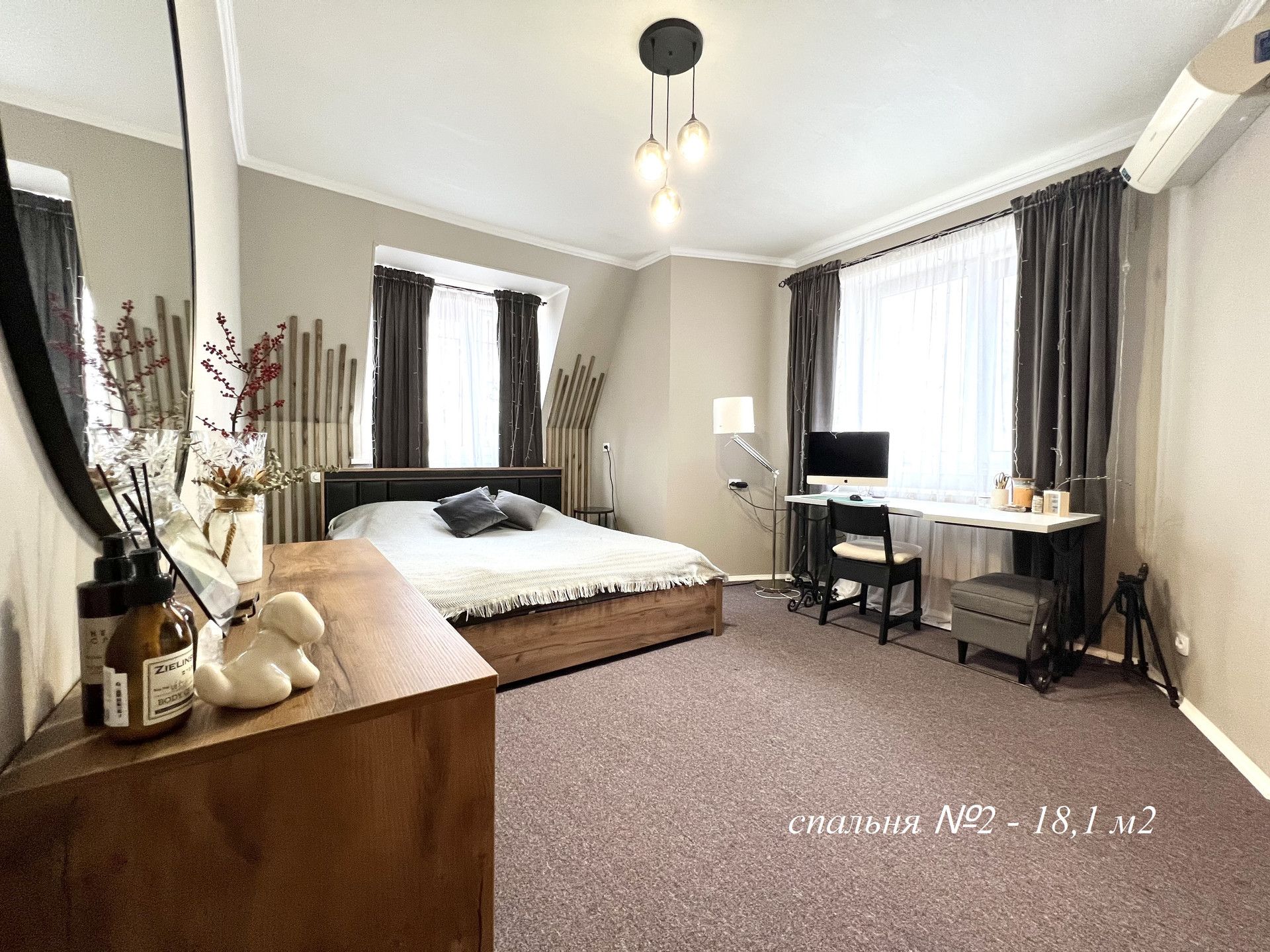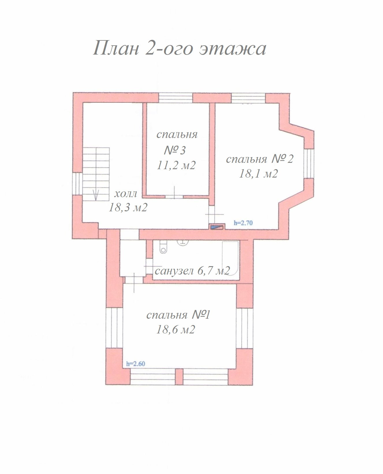 2-ой этаж, мансардный: холл – 18,3 м2, спальня №1 – 18,6 м2 со своим санузлом – 6,7 м2, спальня №2 – 18,1 м2, спальня №3 – 11,2 м2, высота потолка – 2,70 метра.