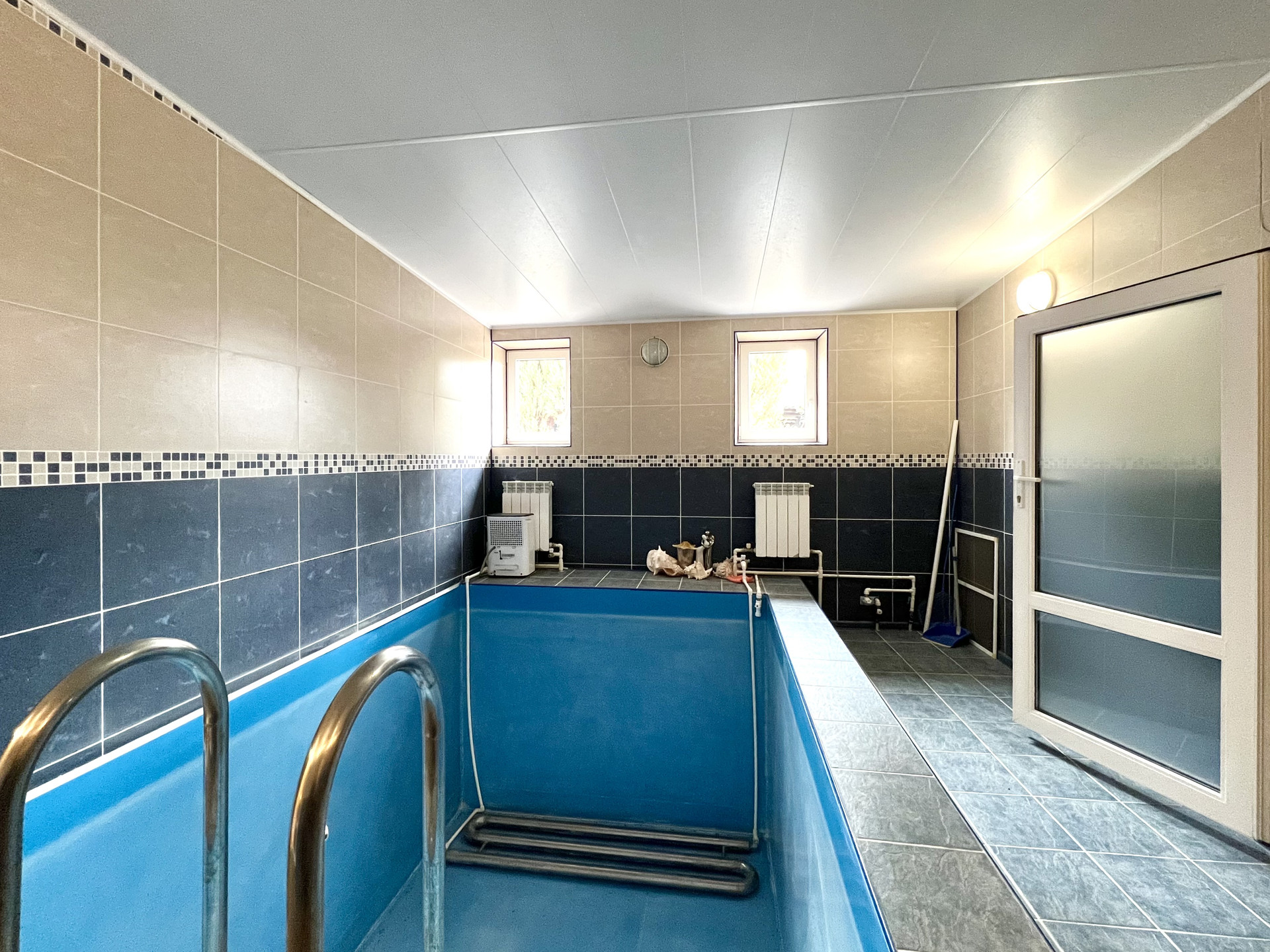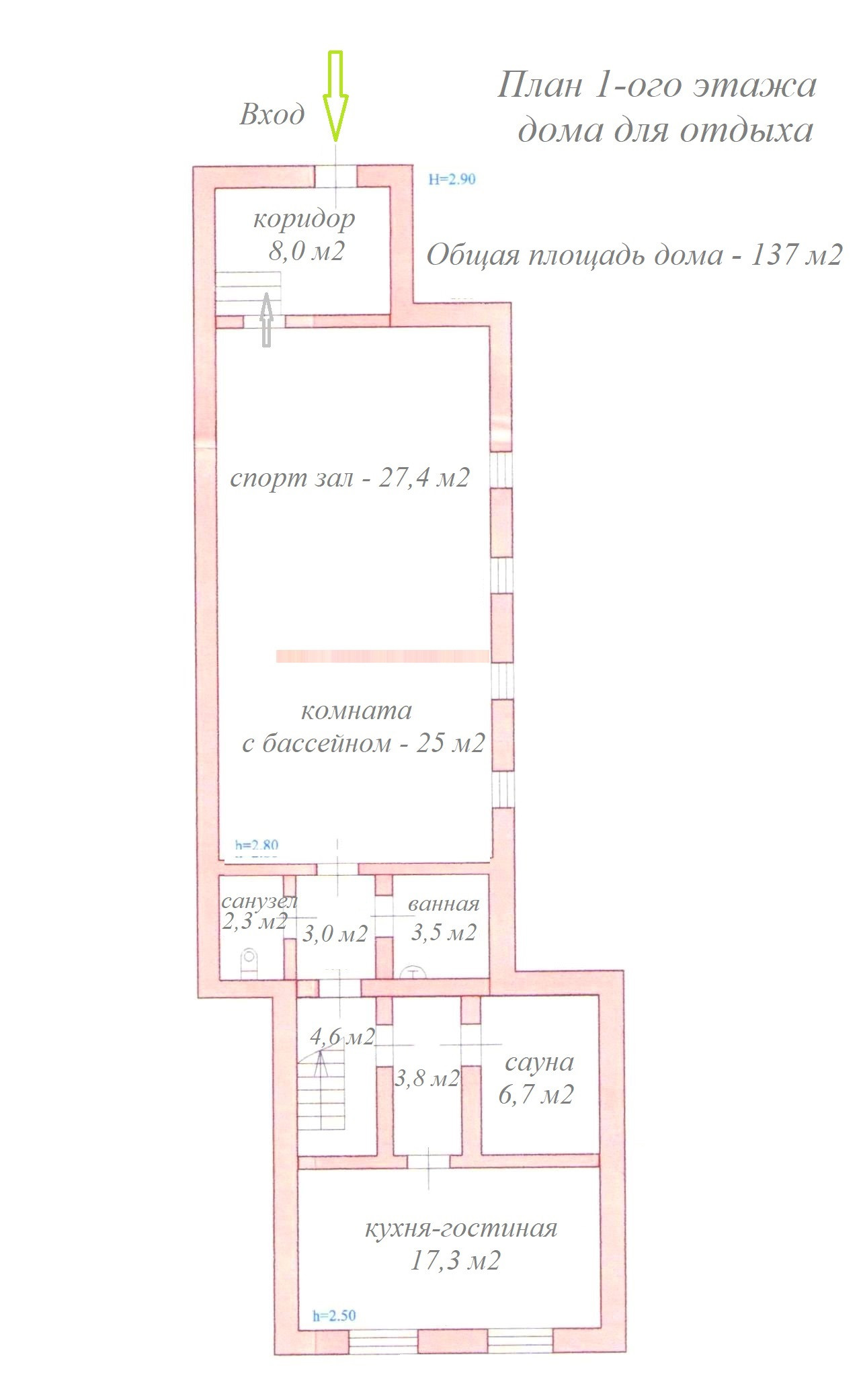 1-ый этаж: коридор - котельная – 8,0 м2, спорт зал – 27,4 м2, комната с бассейном – 25 м2, кухня – гостиная – 17,3 м2, сауна – 6,7 м2, ванная – 3,5 м2, санузел – 2,3 м2, высота потолка – 2,80 метра.