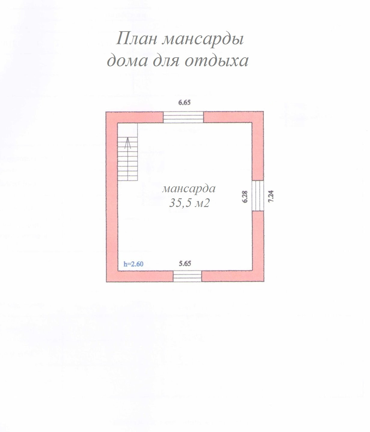 Мансарда – 35,5 м2, высота потолка – 2,60 метра.