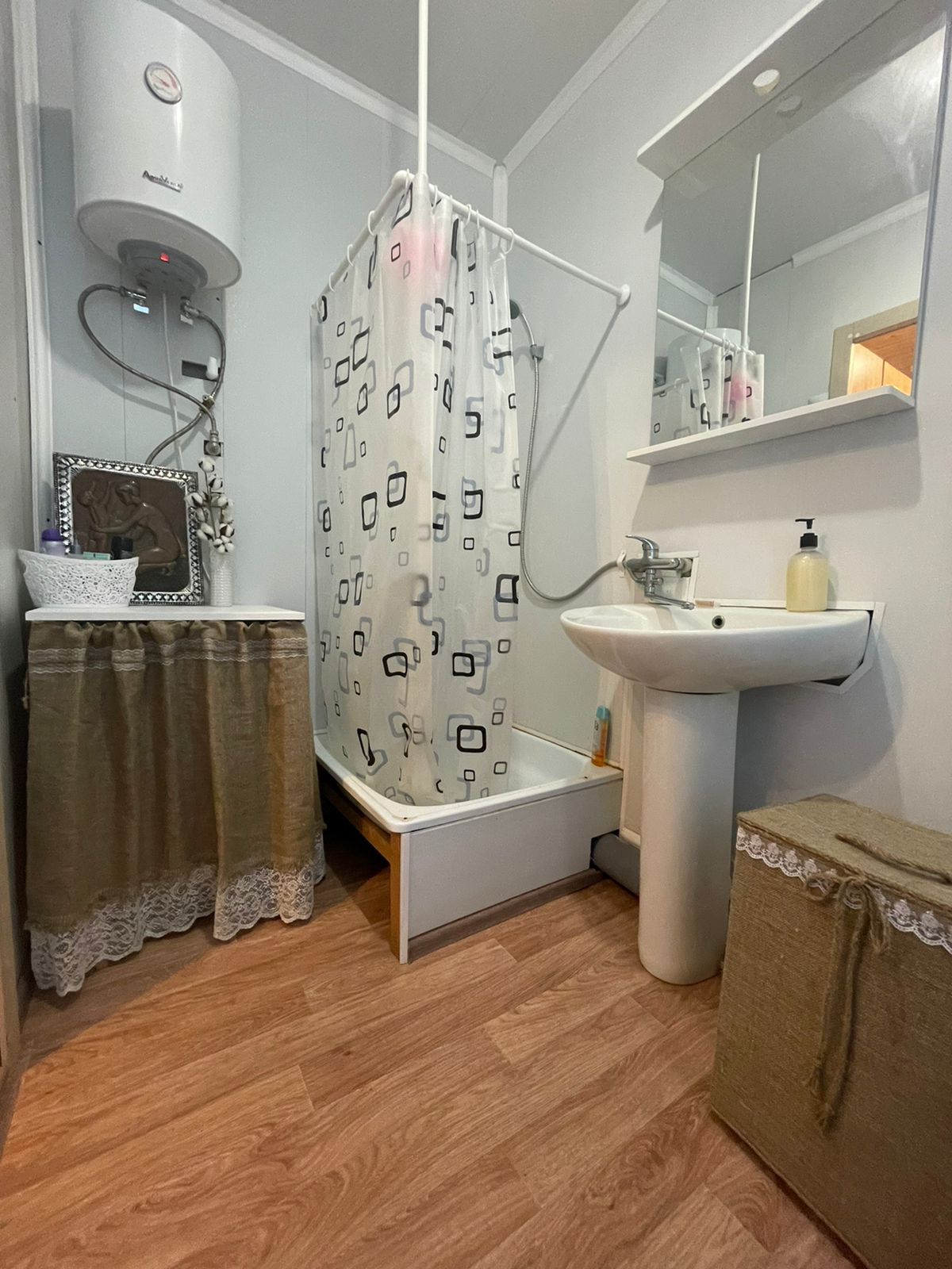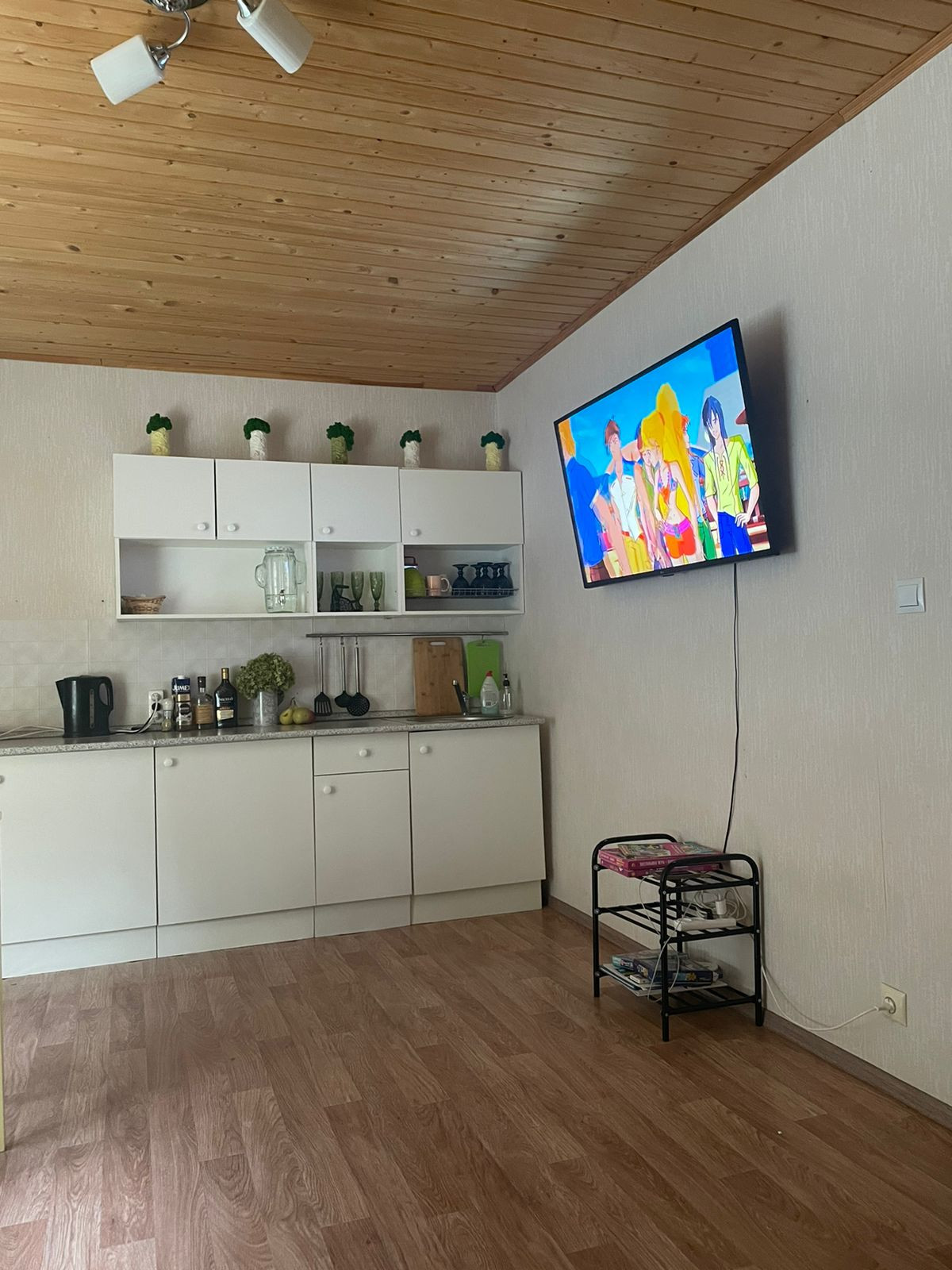 1 этаж - прихожая, большая кухня гостинная, душ + туалет;