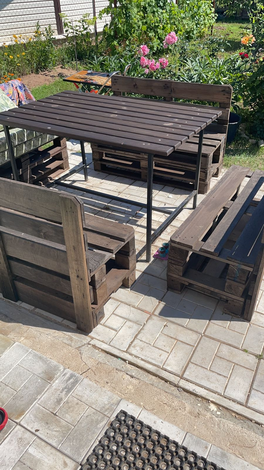 - зона барбекю, аккуратно отделанная плиткой, на которой расположен стол и 4 лавочки для большой компании;