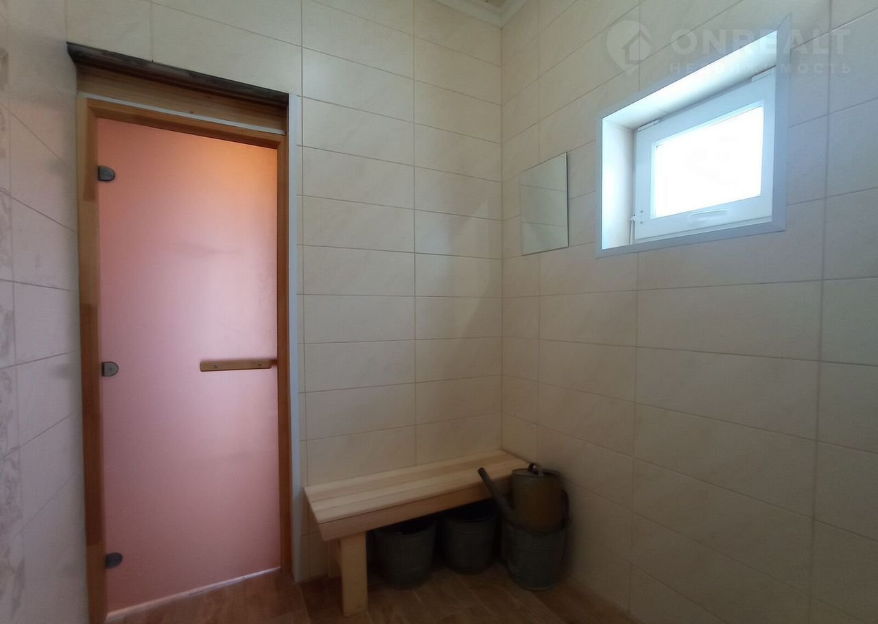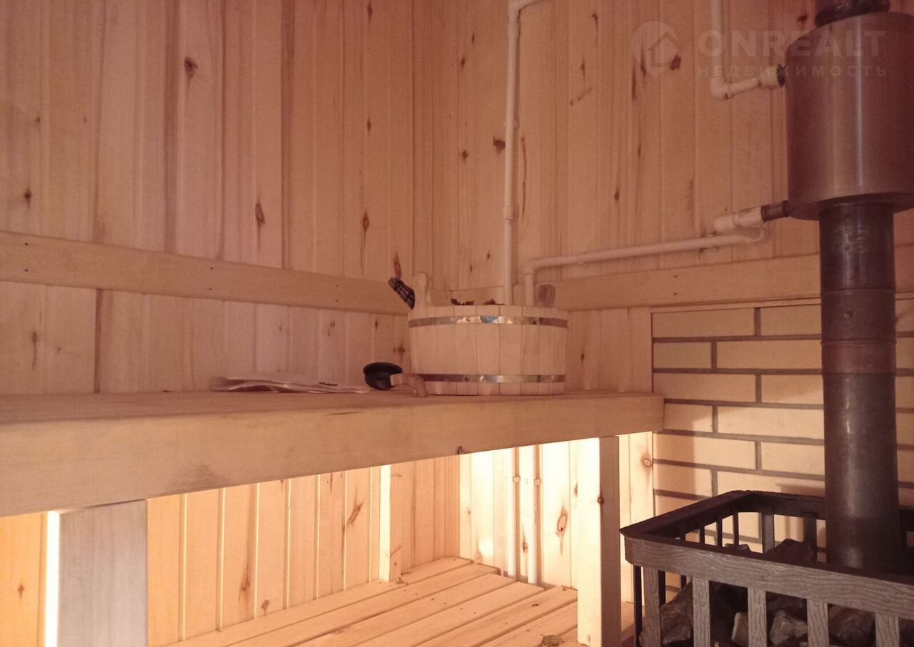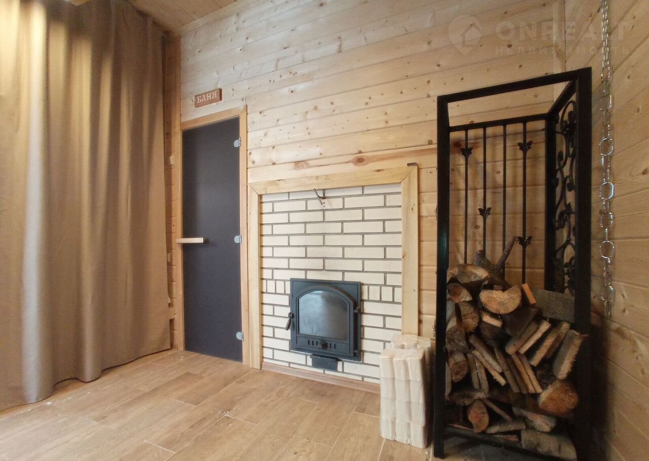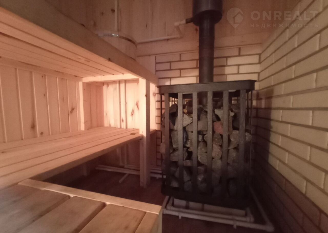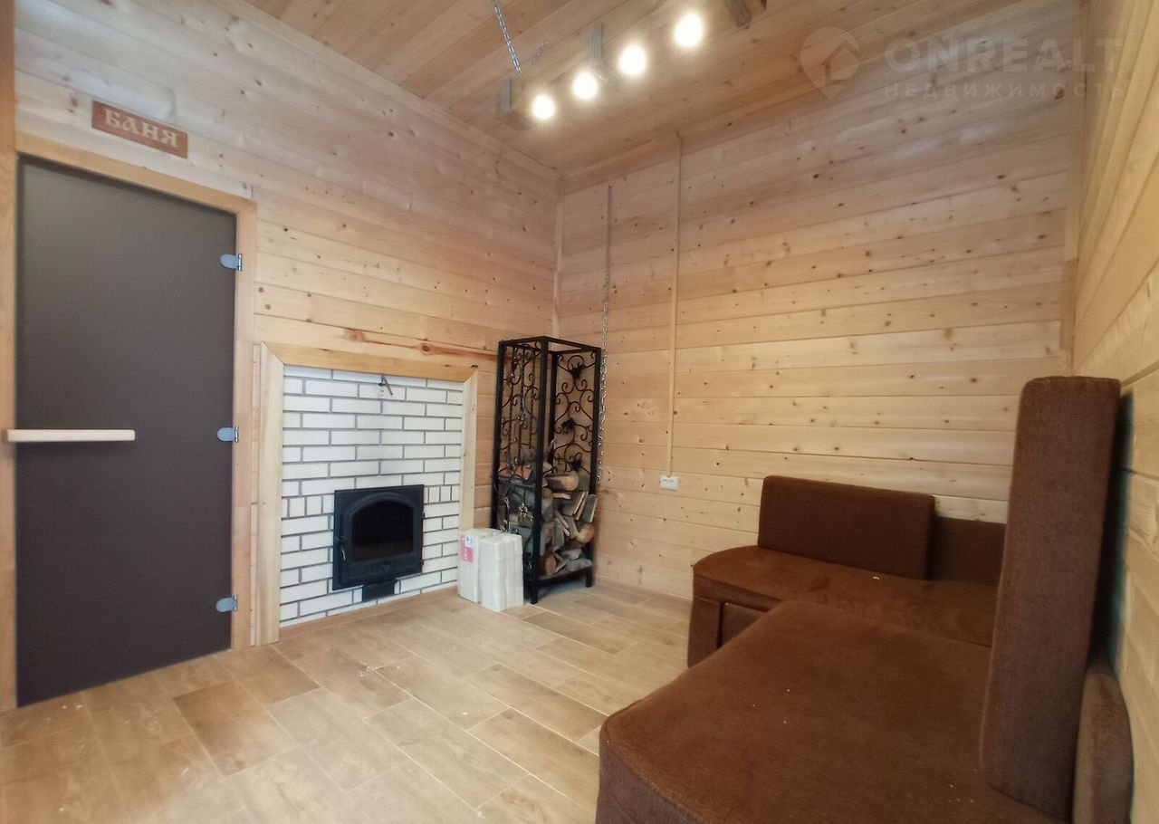 Долговечная чугунная печь и специальные камни для каминов обеспечивают качественное парение. Отделка в комнате - имитация бруса, санузел - керамогранит, в парилке - осина.