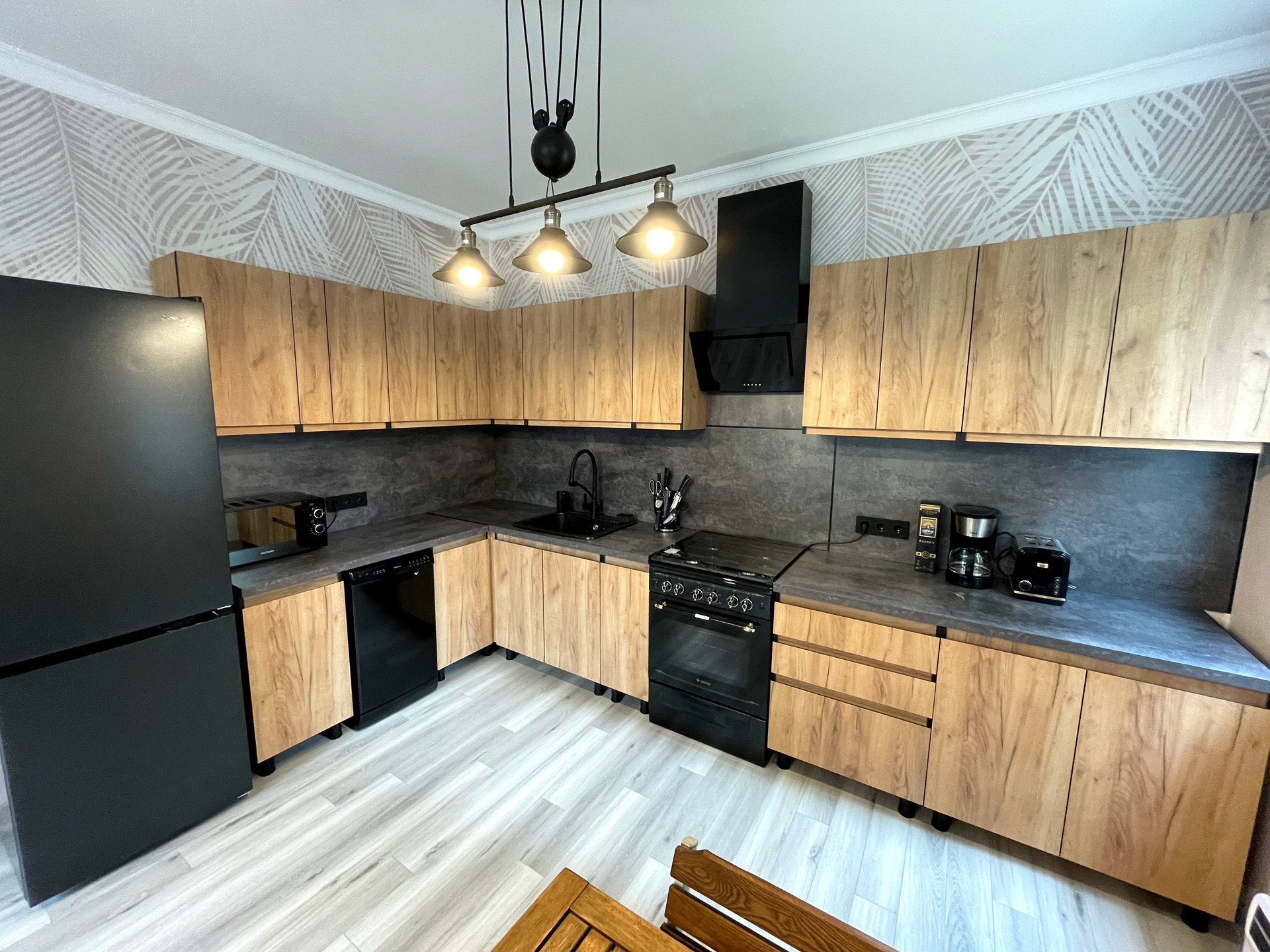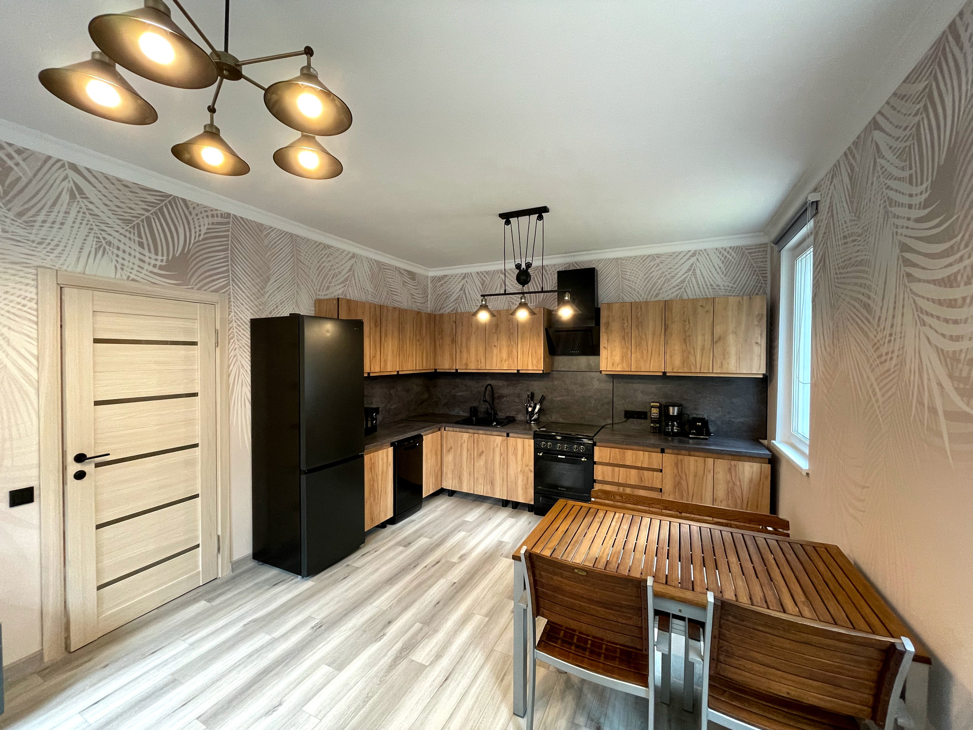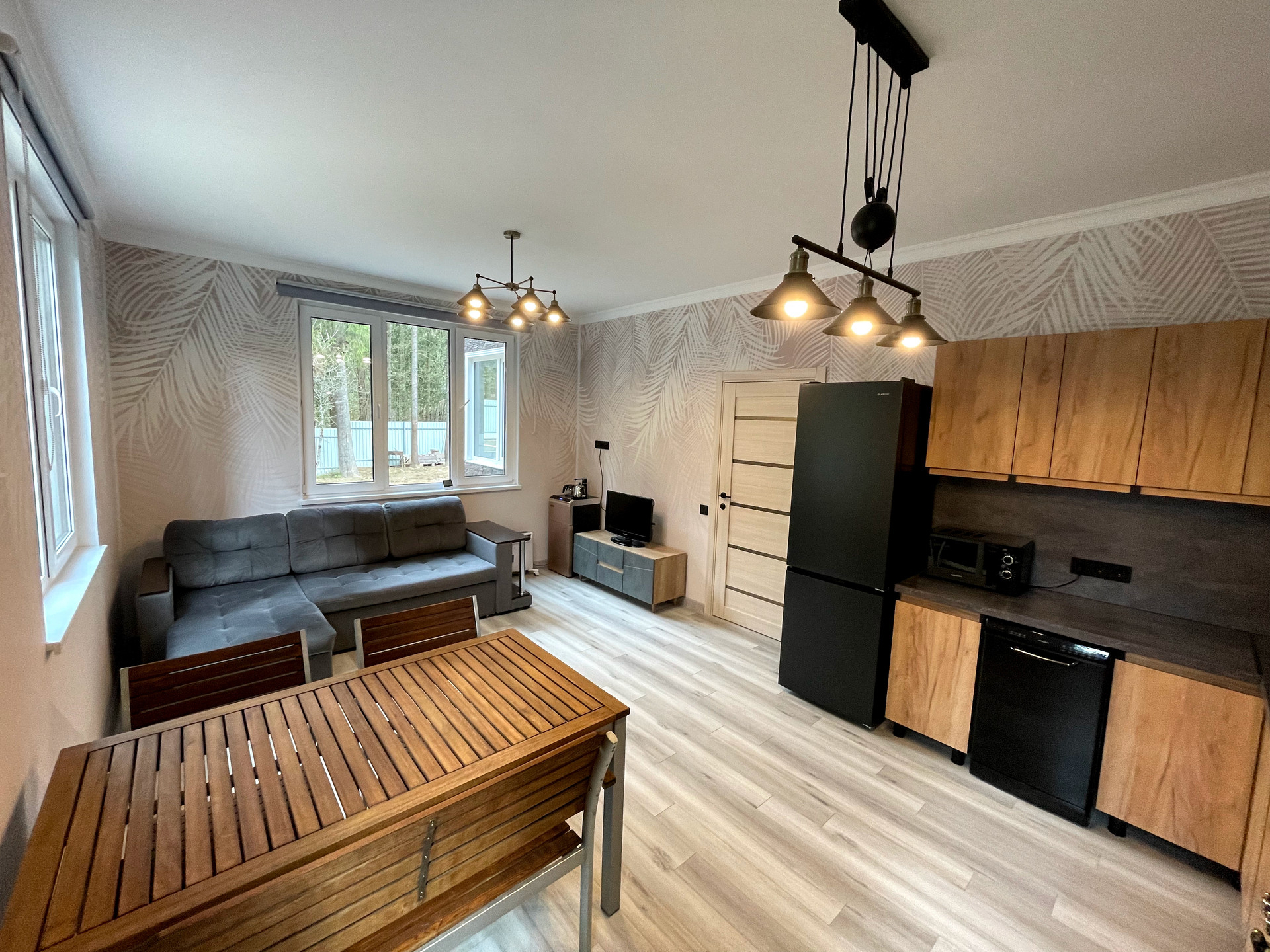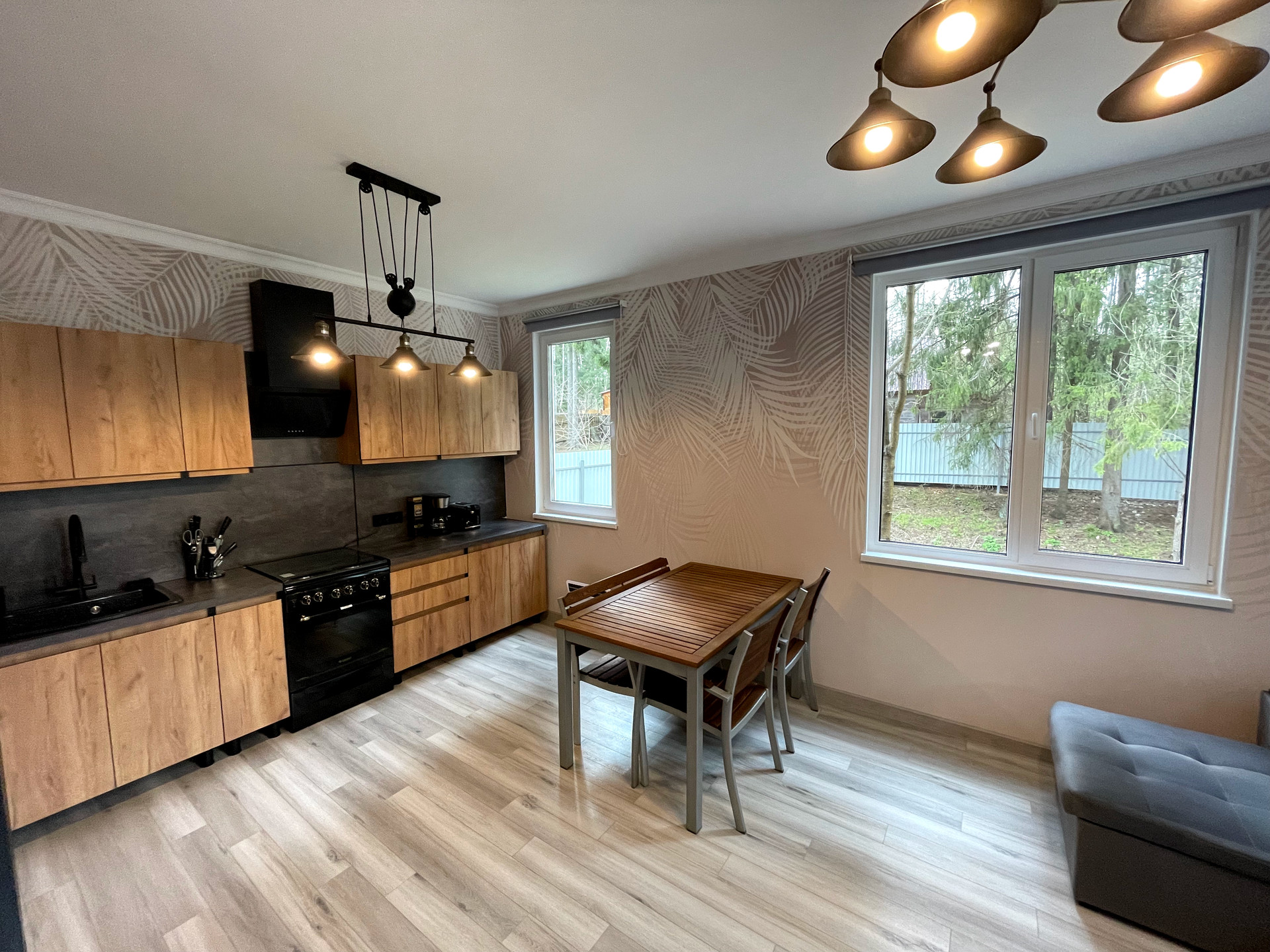 - просторная кухня-гостинная с кухонным гарнитуром и техникой в стиле лофт (заказывали в Леруа), оборудована полноценной газовой плитой (подключена к балону), посудомоечная машинка на 8 комплектов посуды, установлен фильтр питьевой воды с обратным осмосом, покупать питьевую воду не придётся, чайный столик с нижней загрузкой балона, режим охлаждения включался один раз для проверки, работает идеально, капельная кофеварка и тостер, микроволновка на 20 л.