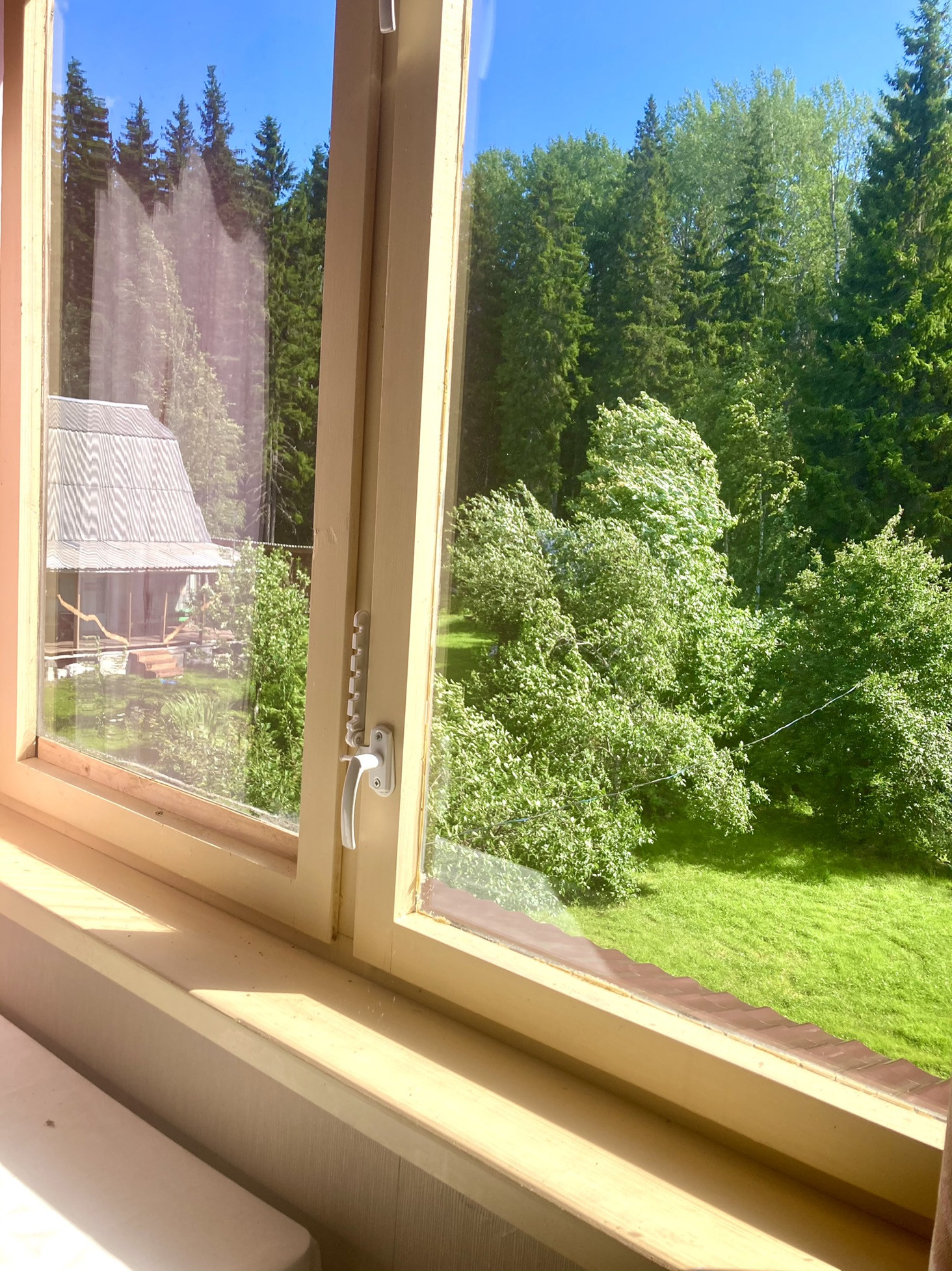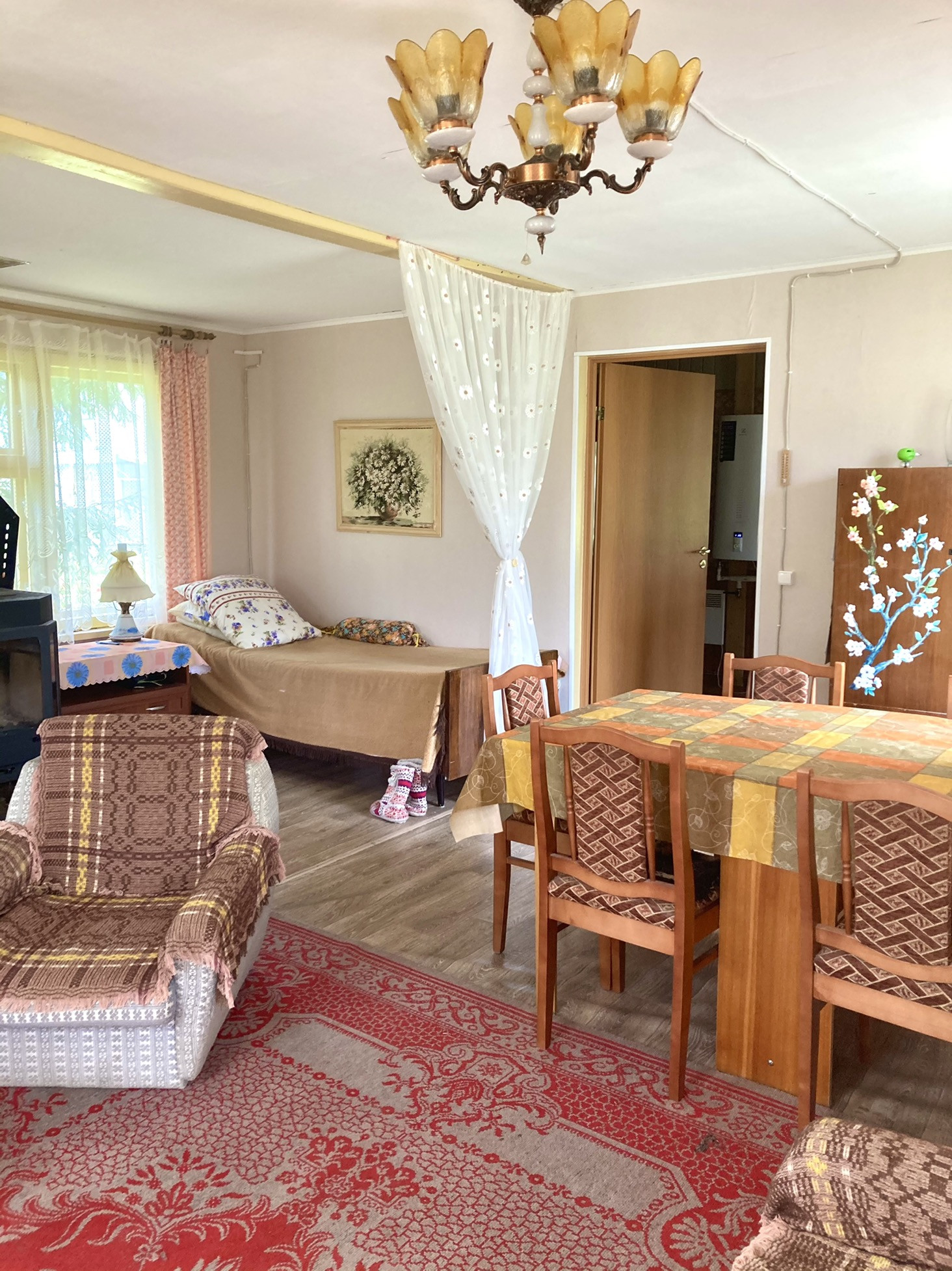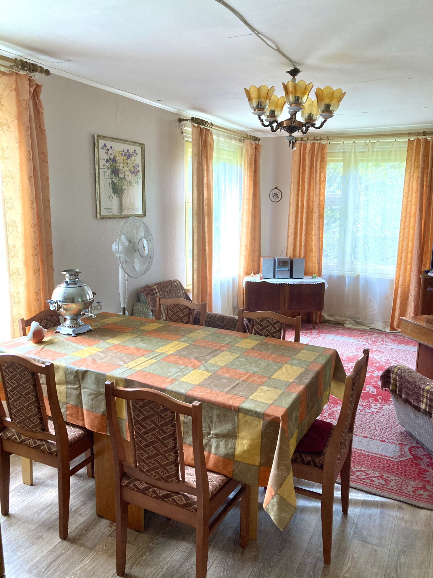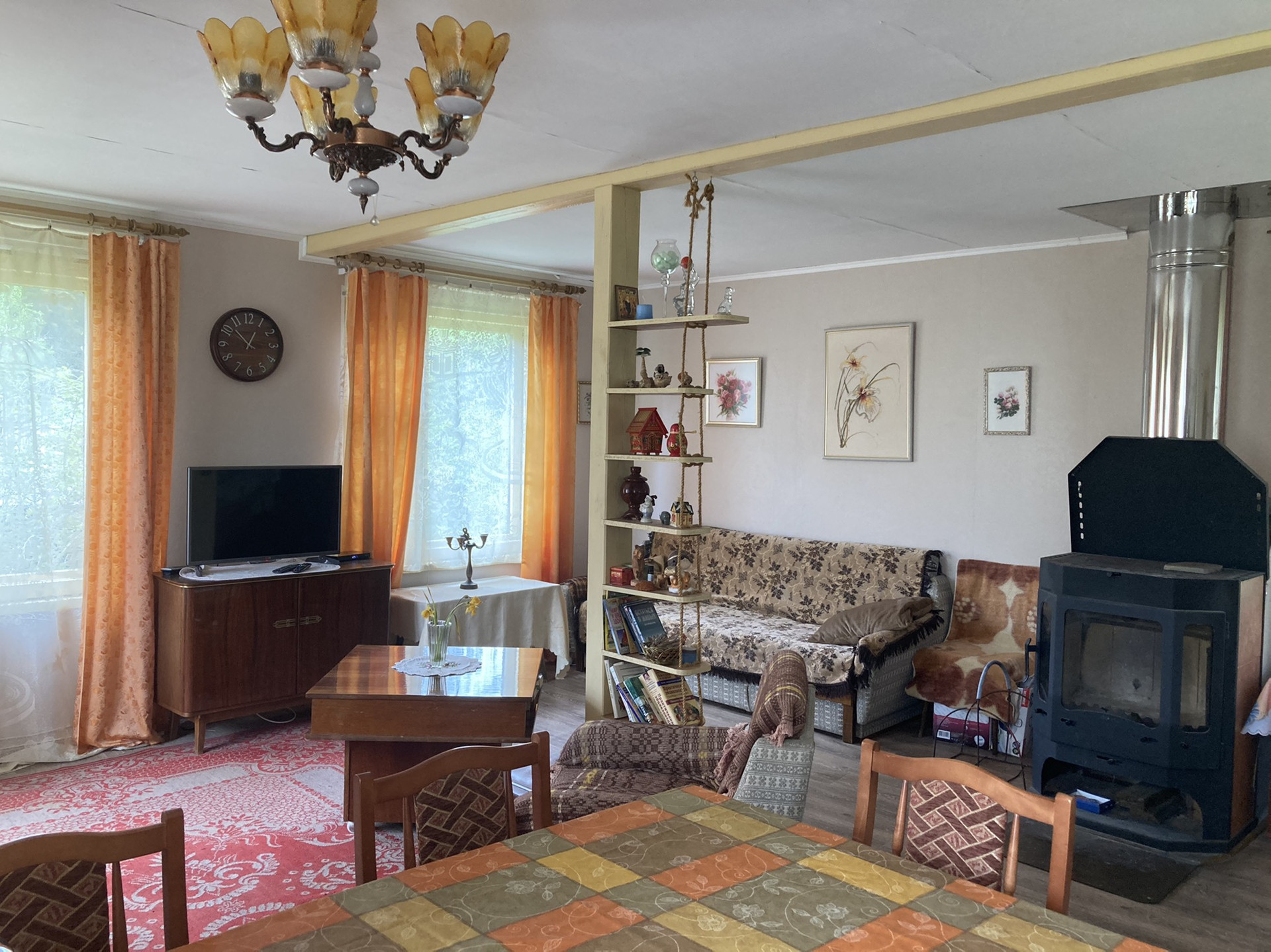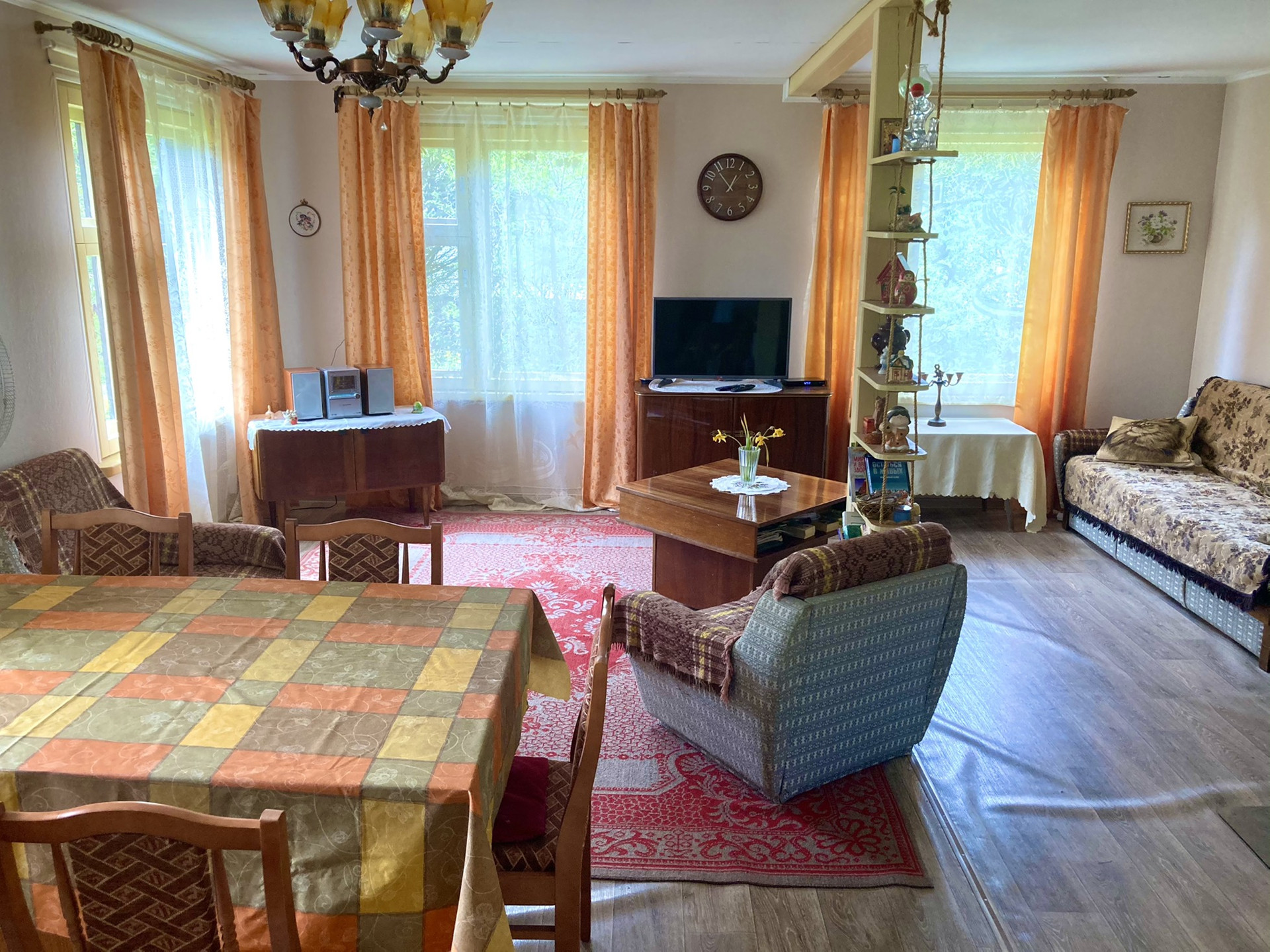 ВсЯ мебель/техника остаётся ; вид из кухонный зоны на участок; установлен городской телефон