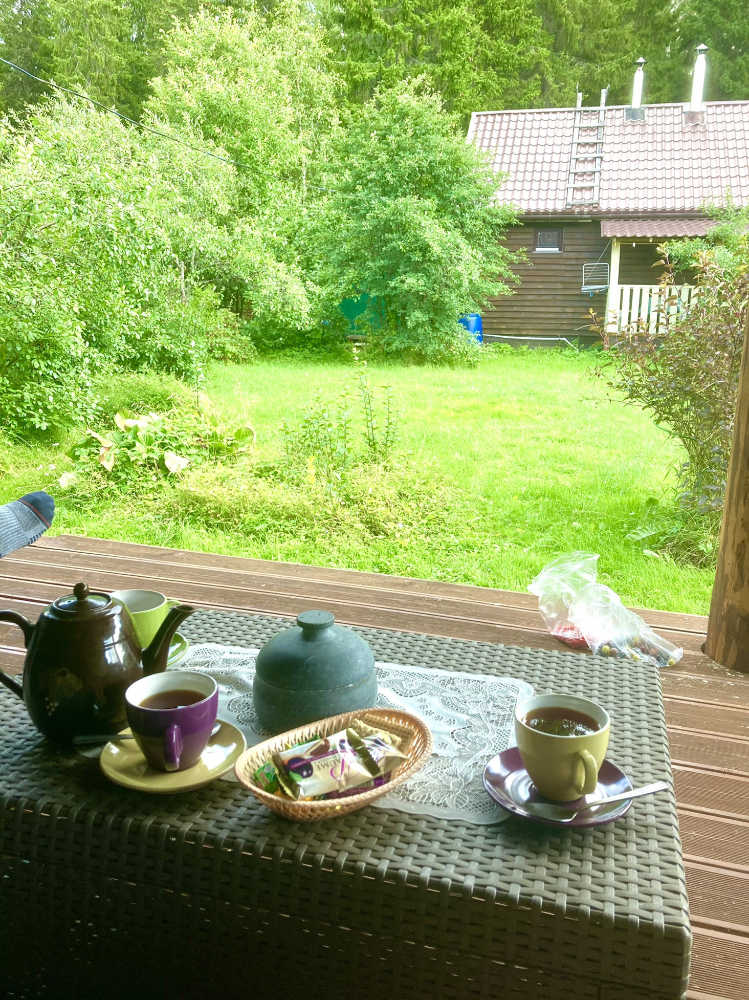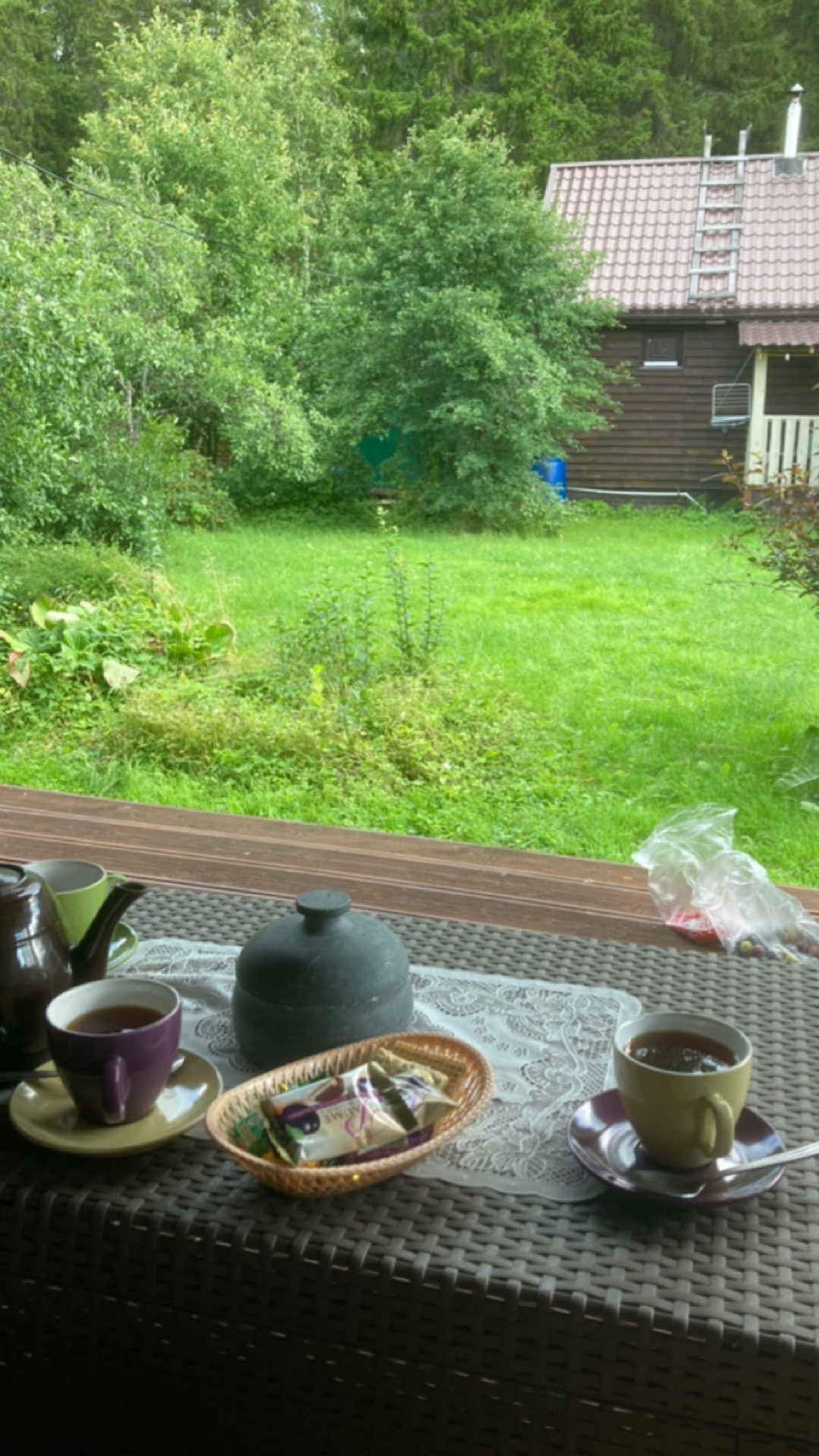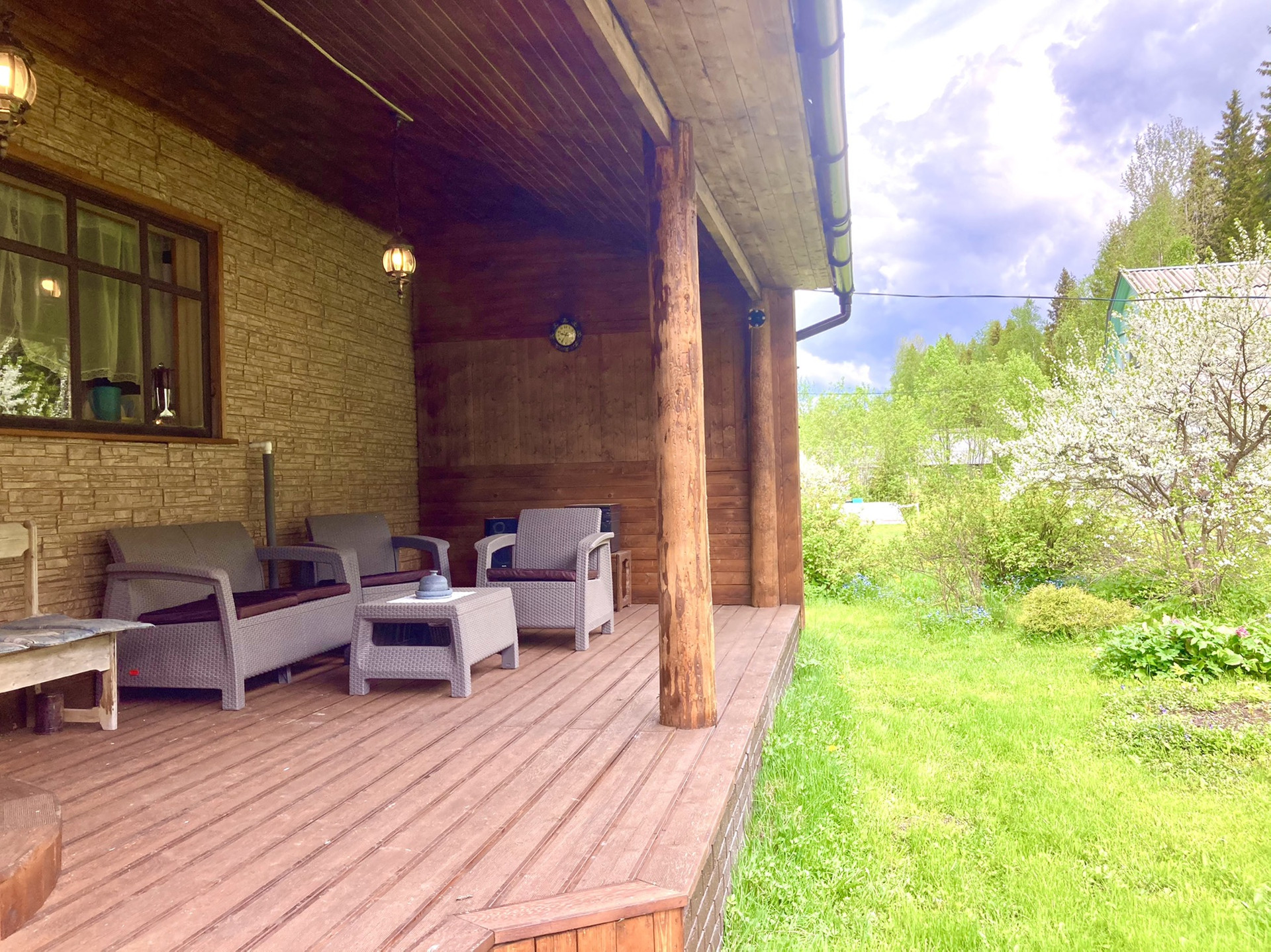 Террасная доска на крытой террасе с видом на многолетние ели; садовая мебель из искусственного ротанга фирма Keter (от 60 тыс комплект )
