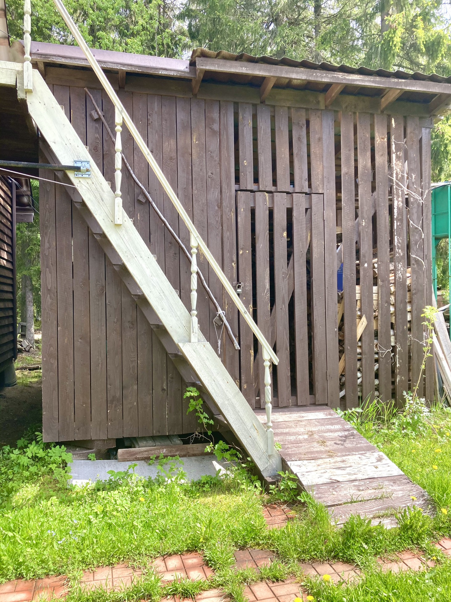Дровянник (2 машины березовых колотых просушенных дров остаётся) с мастерской, финский торфяной туалет ; вместительный хоз.блок - вагончик