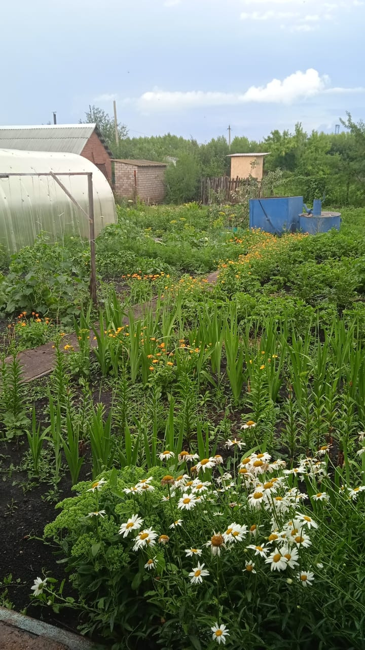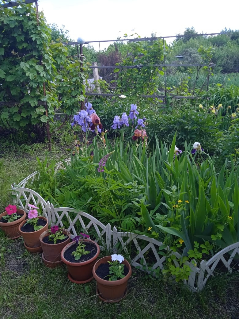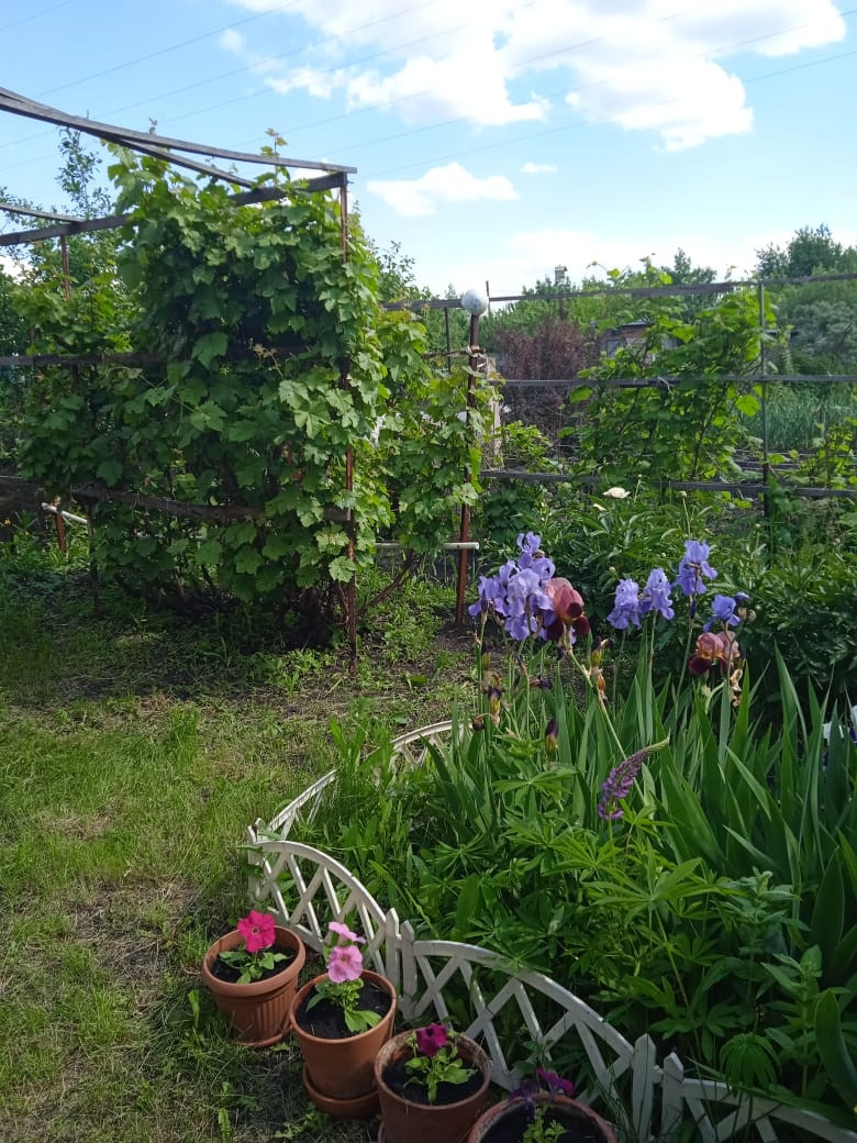 Из насаждений: яблони, сливы, вишни, малина, смородина, виноград, калина.