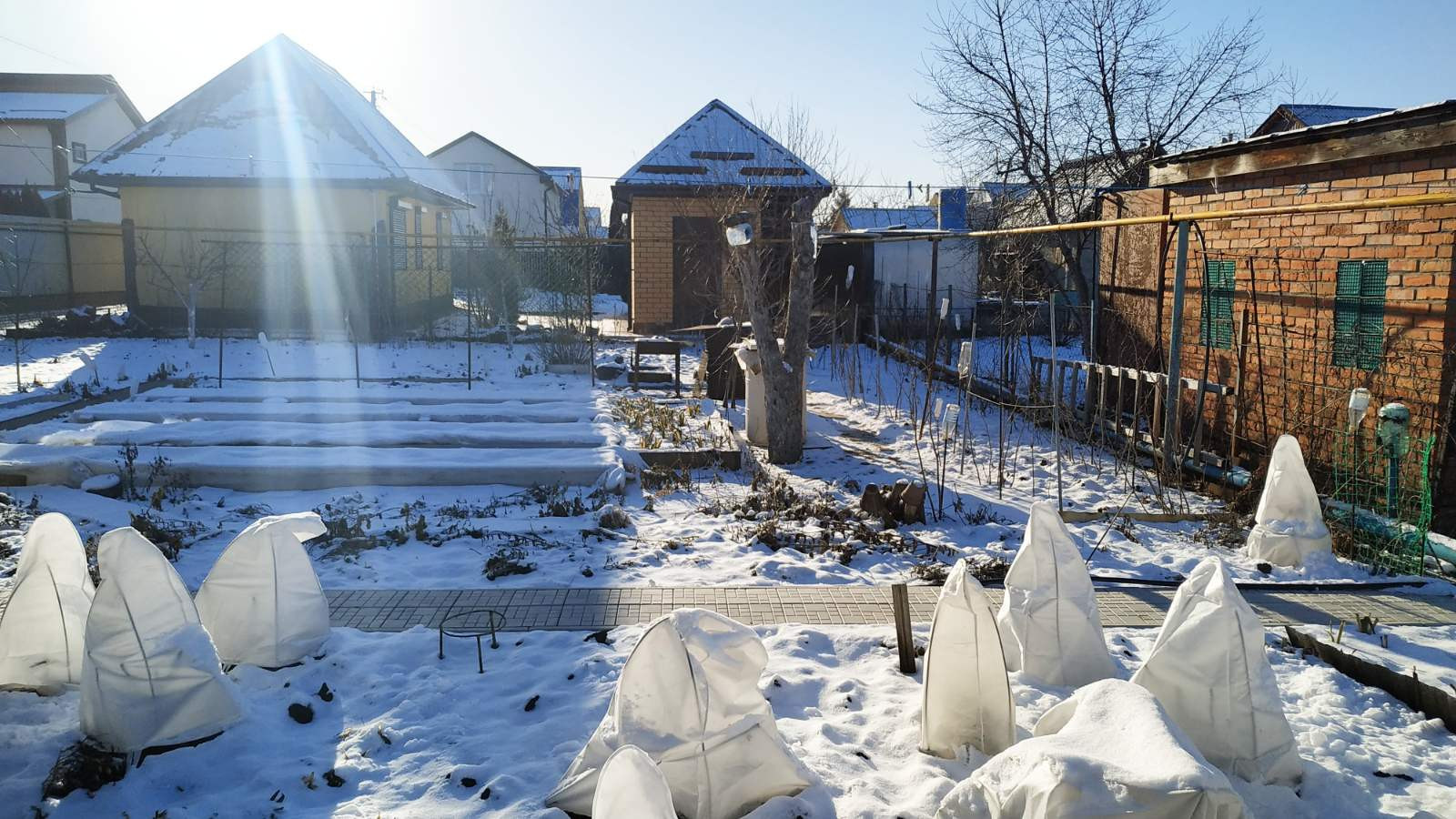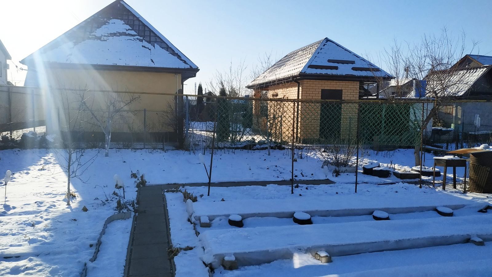 Очень ухоженный участок. Много молодых плодовых деревьев и кустарников.