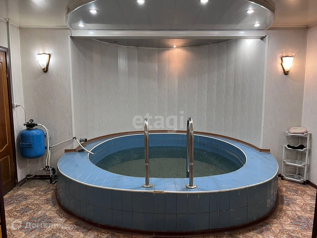 Участок обладает двумя видами водоснабжения: общего пользования и собственной артезианской скважиной. В доме предусмотрено два вида отопления: электричество или газовые баллоны. Также имеется приватная система канализации. Дом включает три этажа: 1. Цокольный этаж: гараж, бойлерная-постирочная, холл с ванной, душевая, отдельный санузел, бассейн, сауна и комната отдыха. 2. Второй этаж: прихожая, большой холл с TV зоной и камином, кабинет, душевая комната с санузлом и кухня с окнами по периметру. 3. Третий этаж: санузел и пять спален, а также гардеробная. Дополнительным преимуществом является наличие летней беседки с водоснабжением на участке.