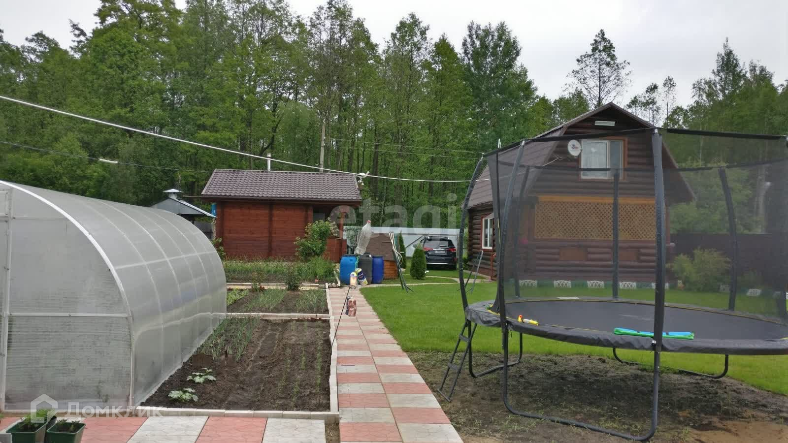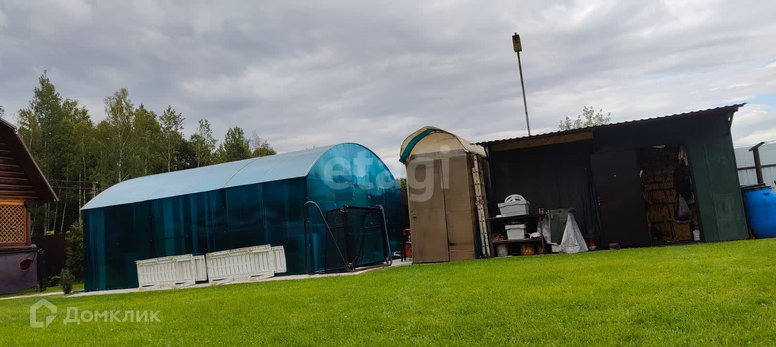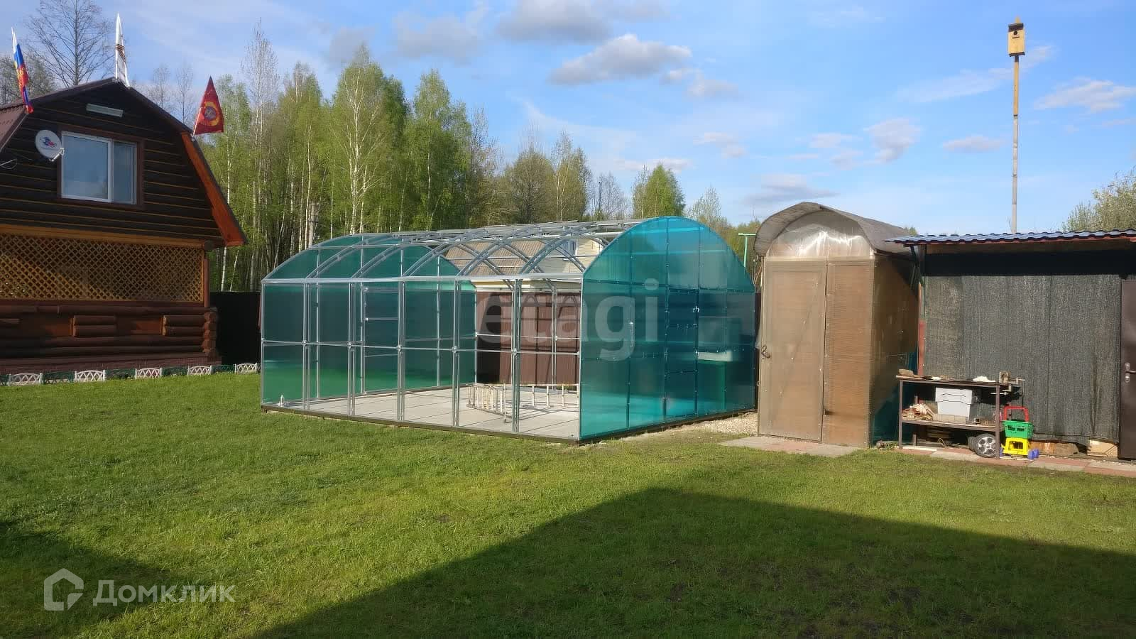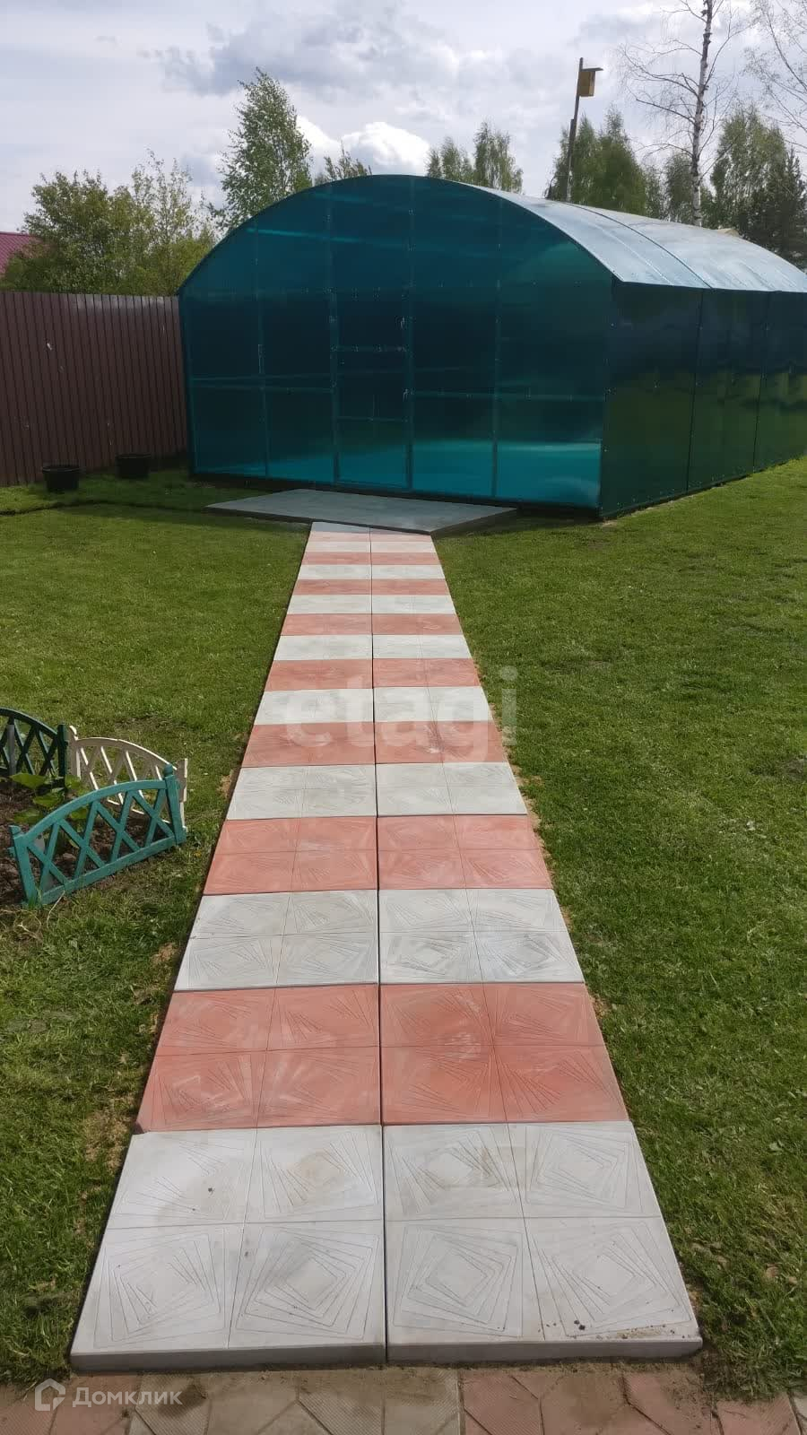 Участок полностью огорожен профнастилом. Есть небольшая теплица 5х3, часть огорода для насаждений.