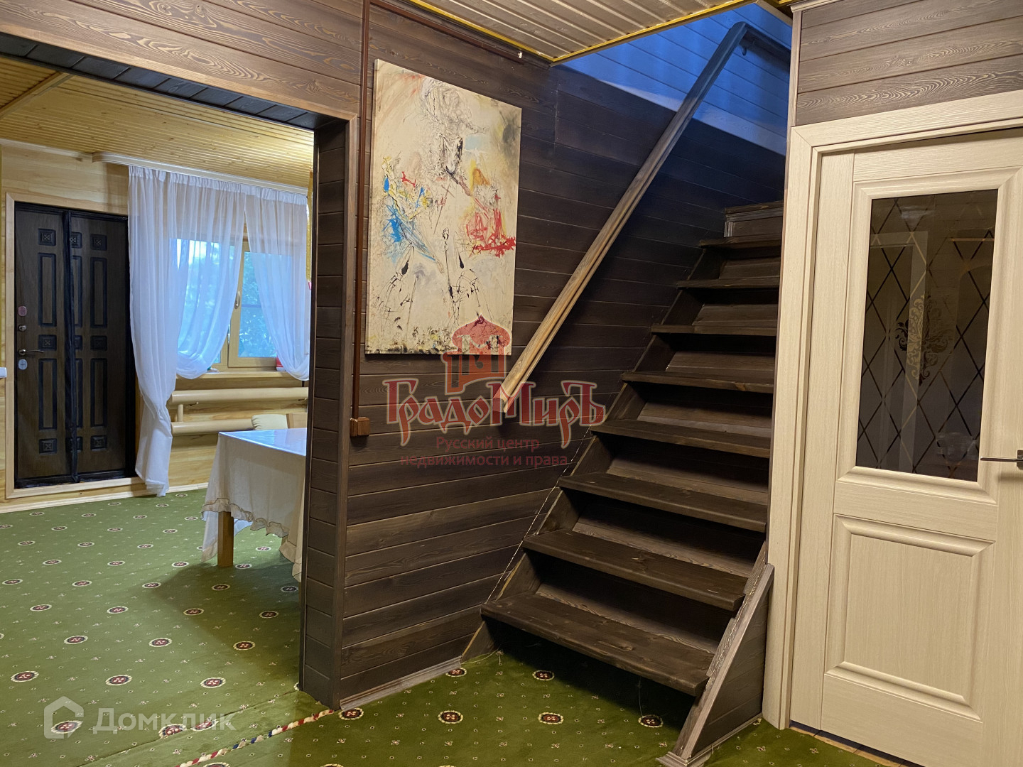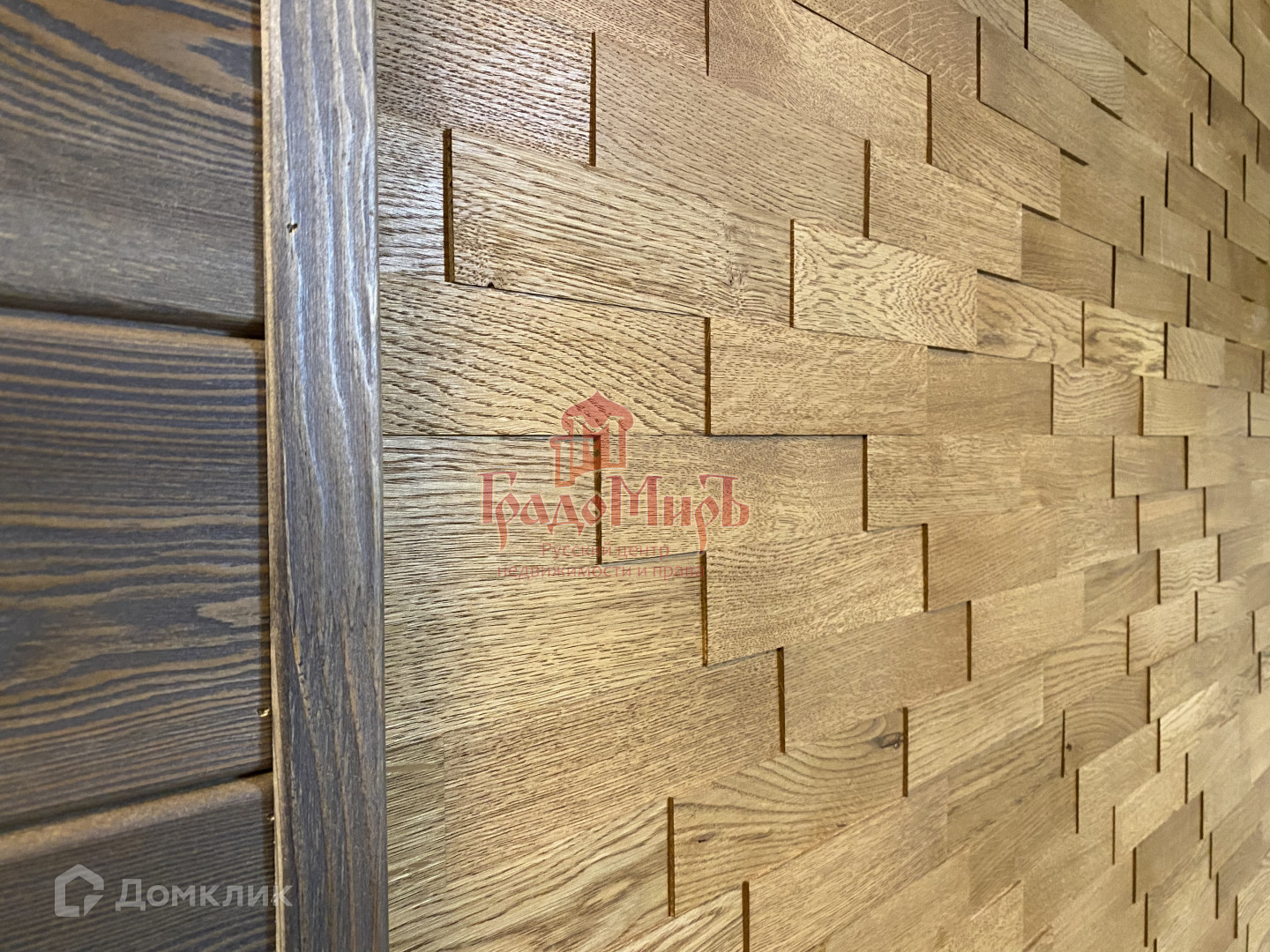Внутренняя отделка дома – сибирская лиственница, окрашенная на производстве по индивидуальному заказу. Гостиная обшита 3d-панелями из натурального дуба.