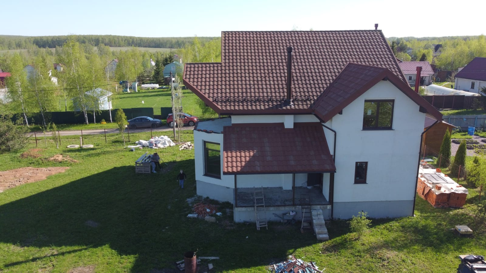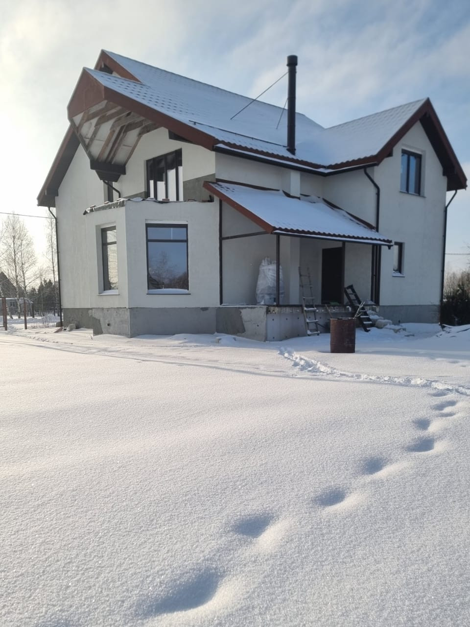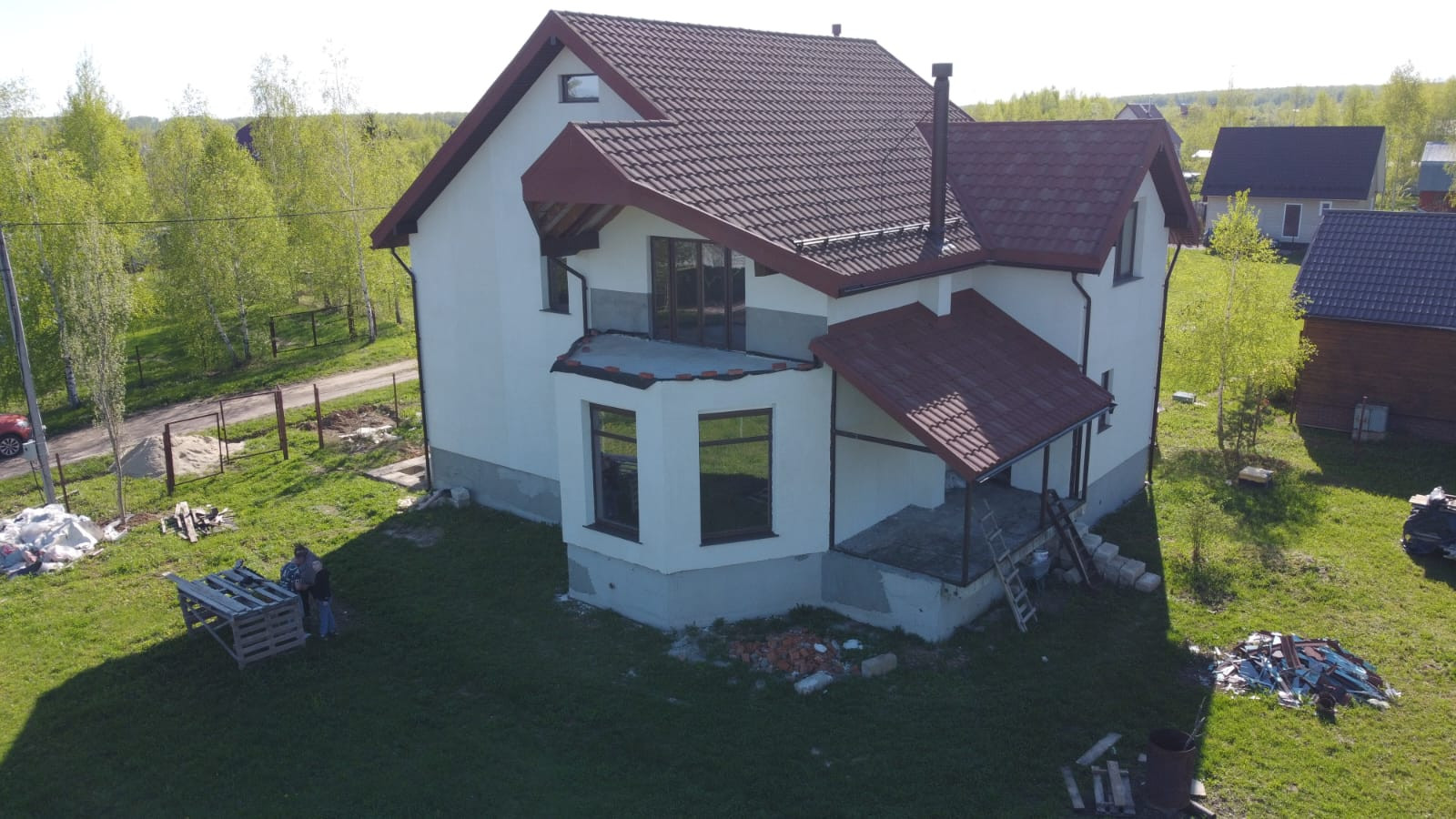 Коттедж сделан из теплой керамики. Ленточный фундамент с утеплением 10 см. Фундамент железобетонная лента с 28 шурфами вглубь ещё на 3 метра (утеплен внутри). Крыша сделана из композитной черепицы (утепление 20 см). В доме установлено газовое оборудование (котел, плита, батарея) и подключен газ, 3 фазы электричества (15 кВт), скважина глубиной 35 м., переливной септик, состоит из 2 колодцев и 8 колец, дымоход для будущего камина, а также зона для сауны. Двухкамерные стеклопакеты(зимнее остекление) Kaleva.