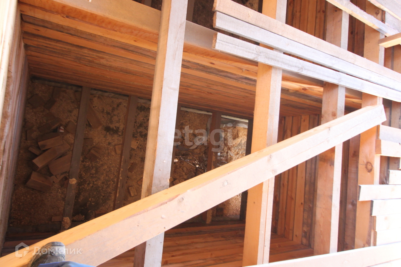Построен с листвяка,между брусьями проложен утеплитель.