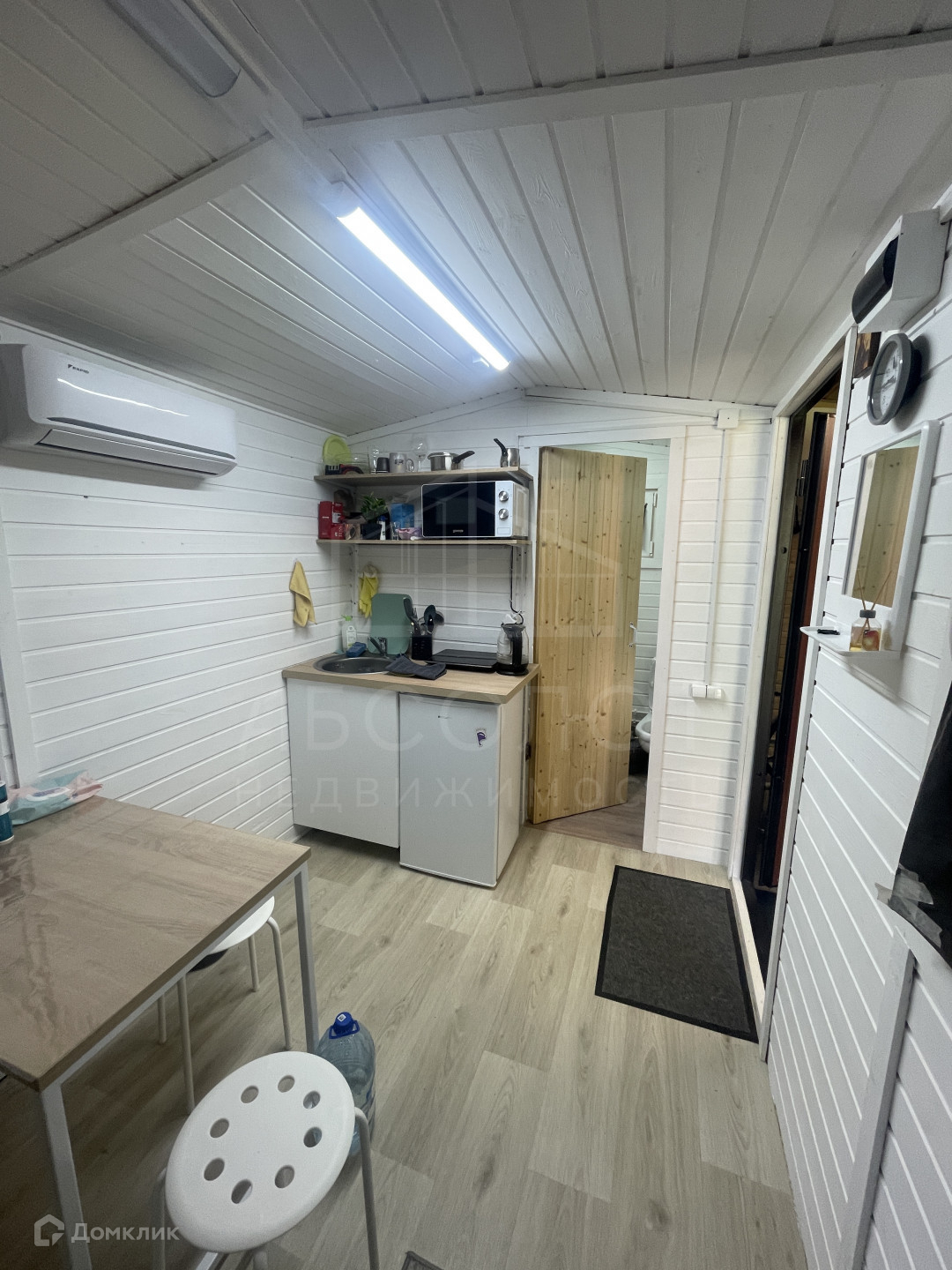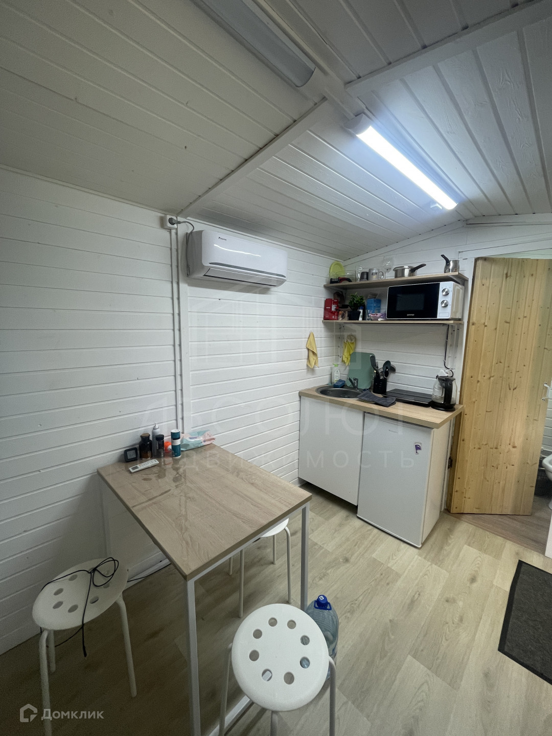 Кухонная зона  с необходимой техникой: холодильник, индукционная плита, микроволновая печь, чайник,  рабочая поверхность, раковина (вода заведена в дом). Обеденный стол и стулья.