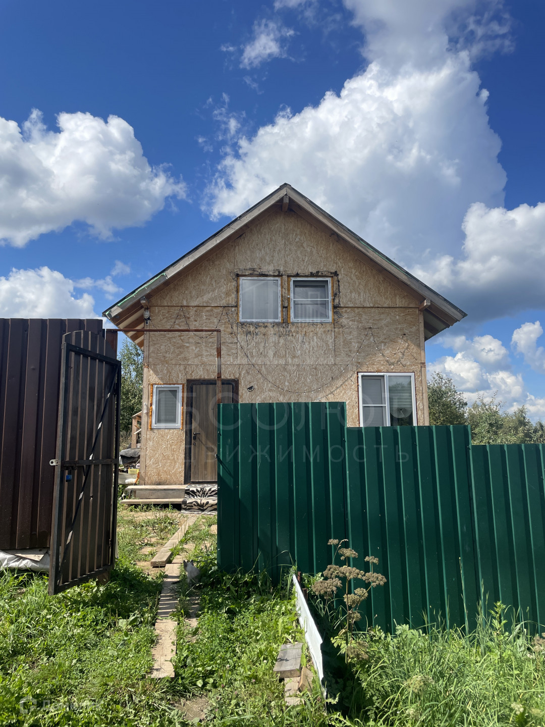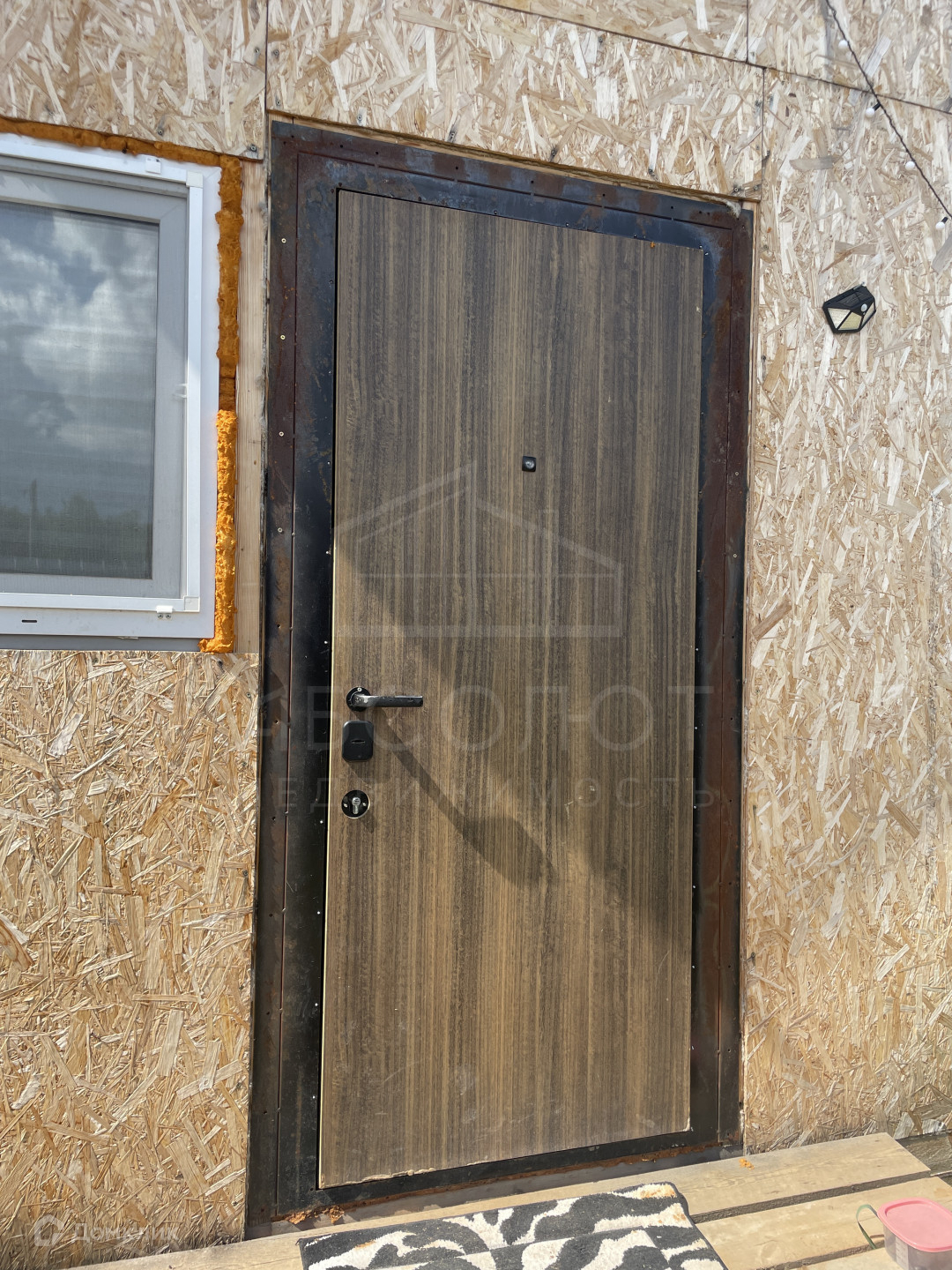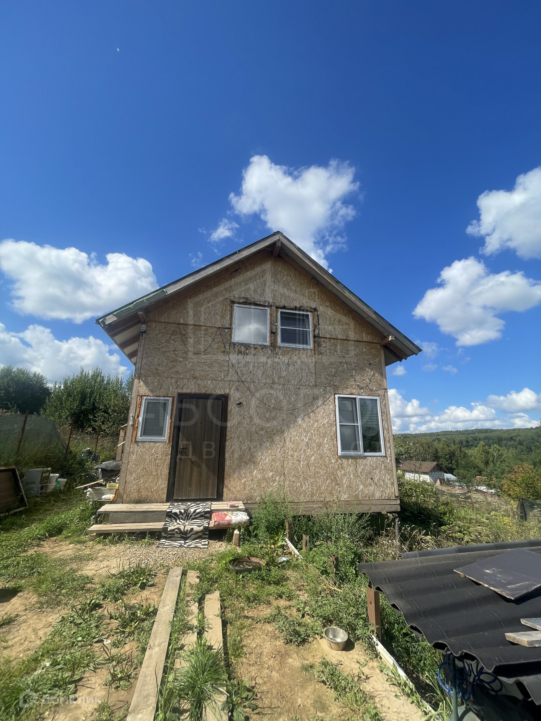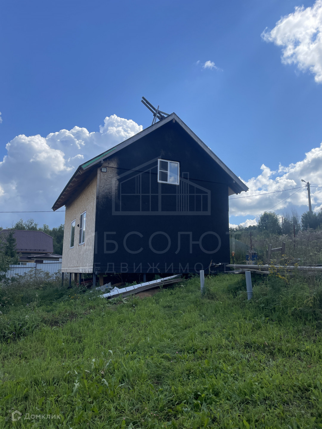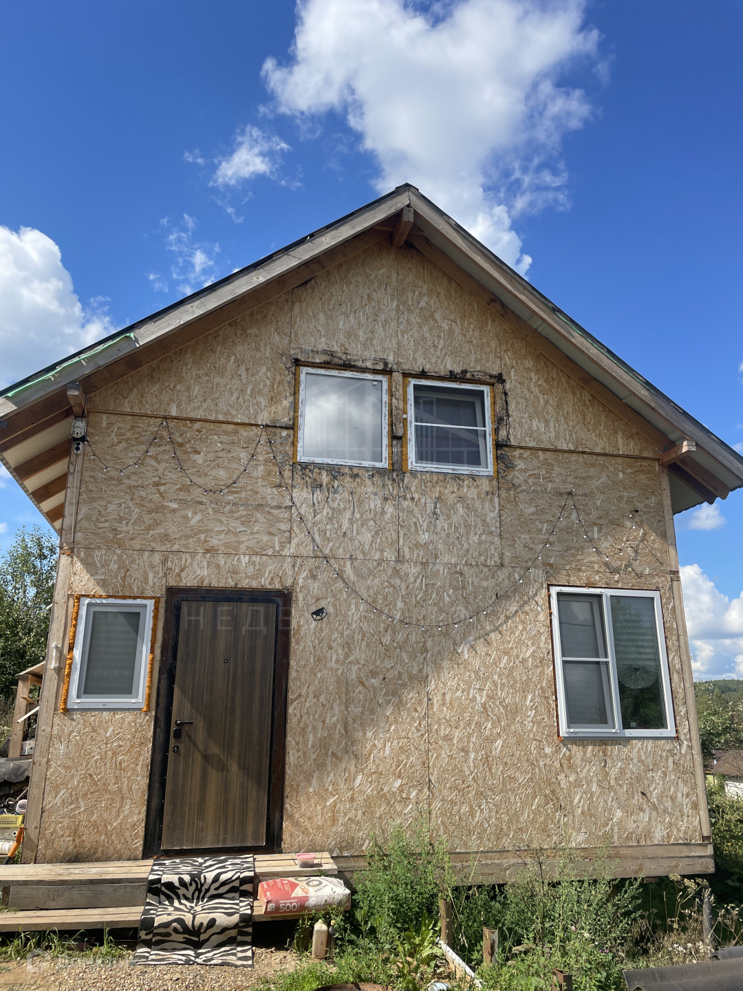 Дом построен из СИП панелей, фундамент - сваи. В ближайшие дни дом докрасят.