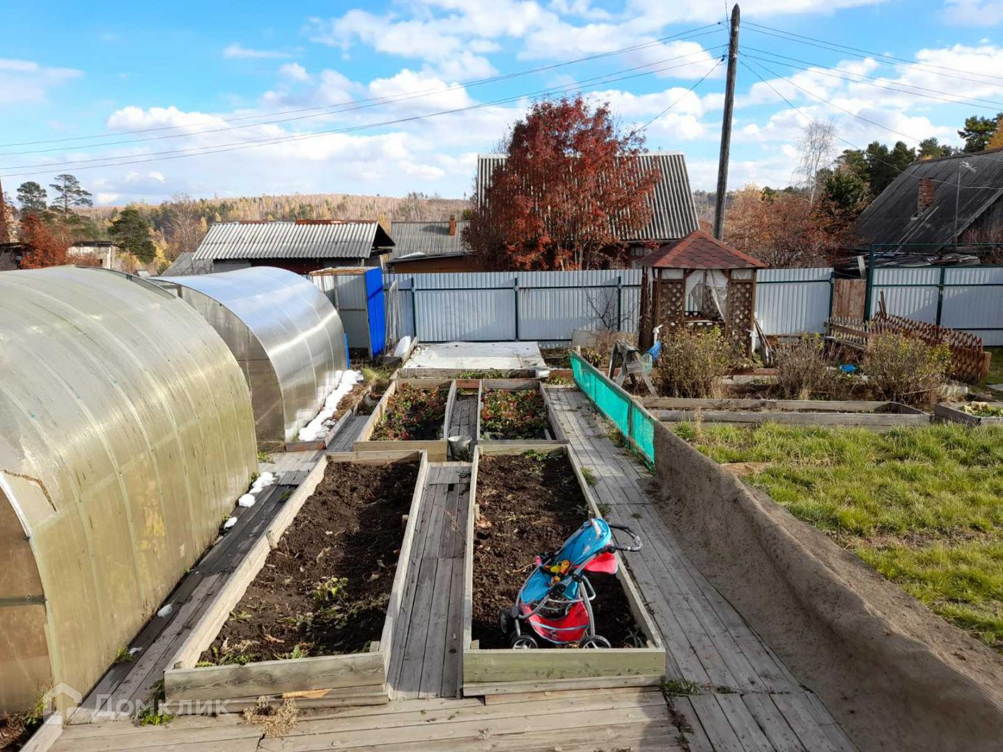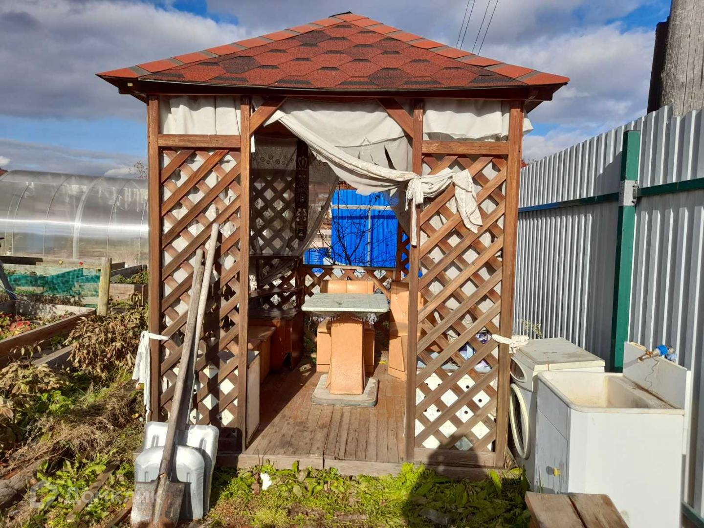 Участок ровный 6 соток, со всех сторон огорожен, лицевая сторона забора профлист на железном каркасе. На участке и в теплицах деревянные дорожки. Имеется: беседка, 2 теплицы из поликарбоната, летний душ, подиум под бассейн, кладовка под хознужды.