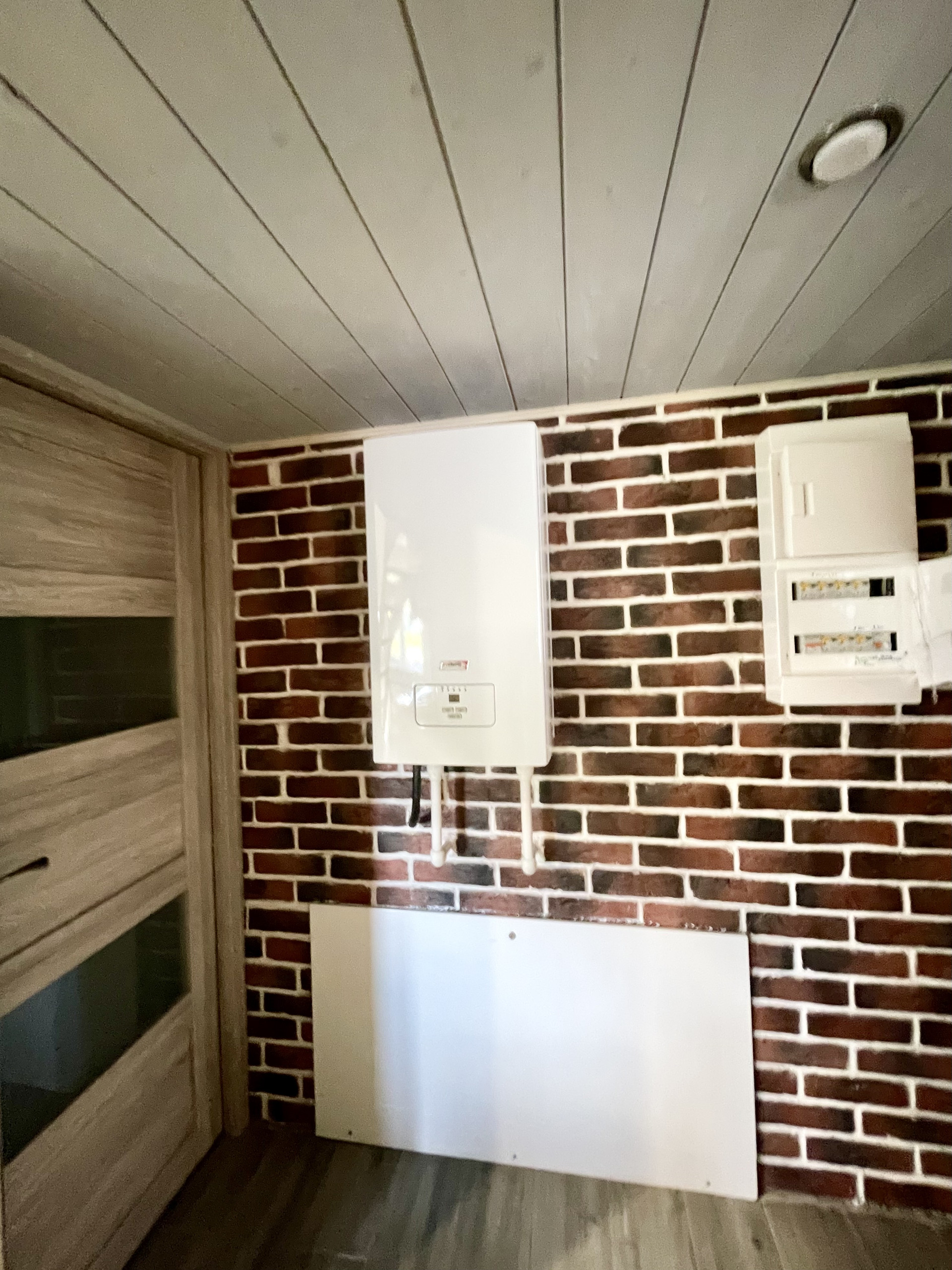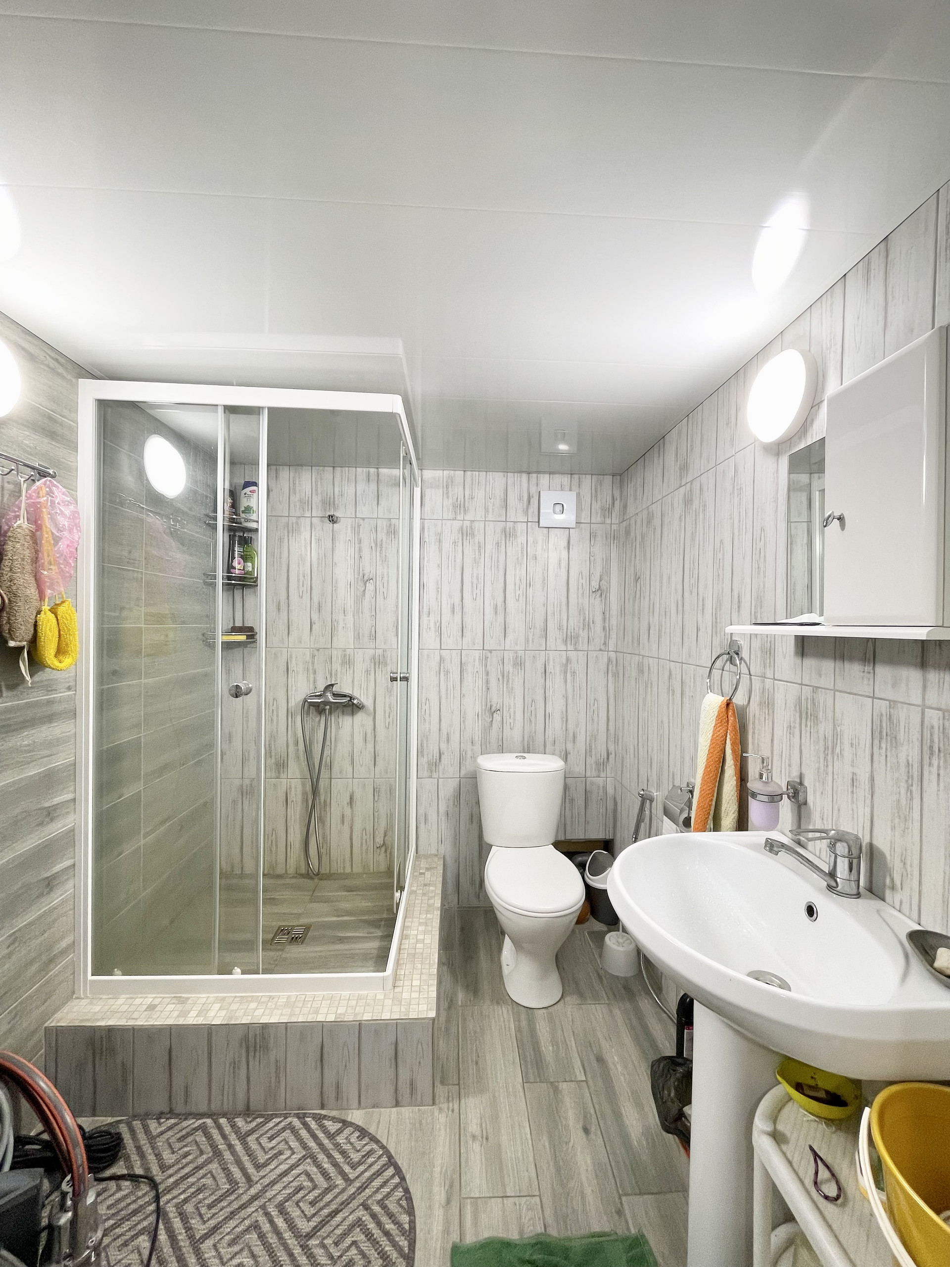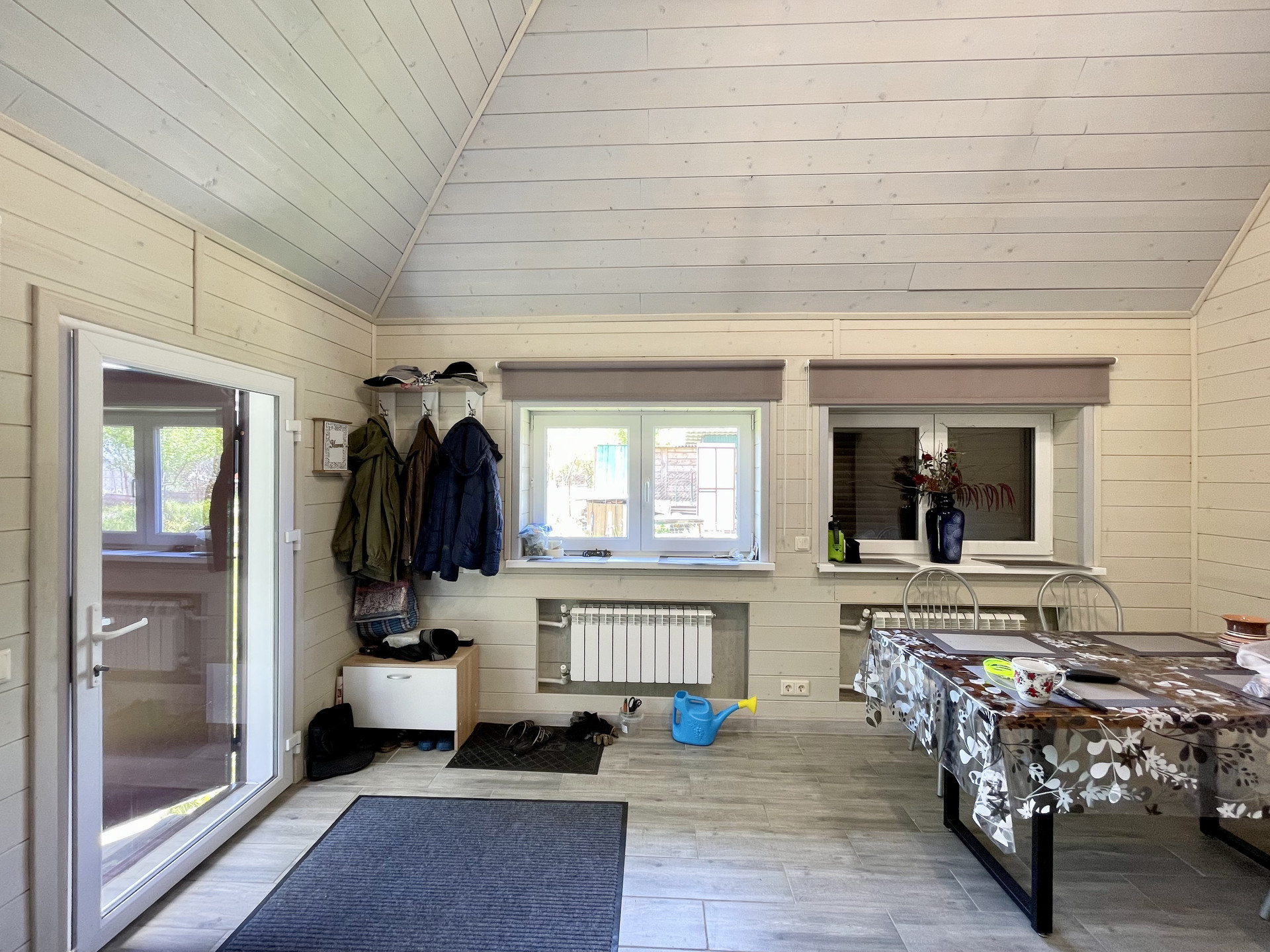 В доме новый современный ремонт, много света и воздуха, санузел с душевой кабиной в плитке, электрический котел, биметаллические батареи, теплый пол по всему дому. На полу плитка. Везде установлены пластиковые окна и рольставни. Две входные двери-пластиковая и железная.