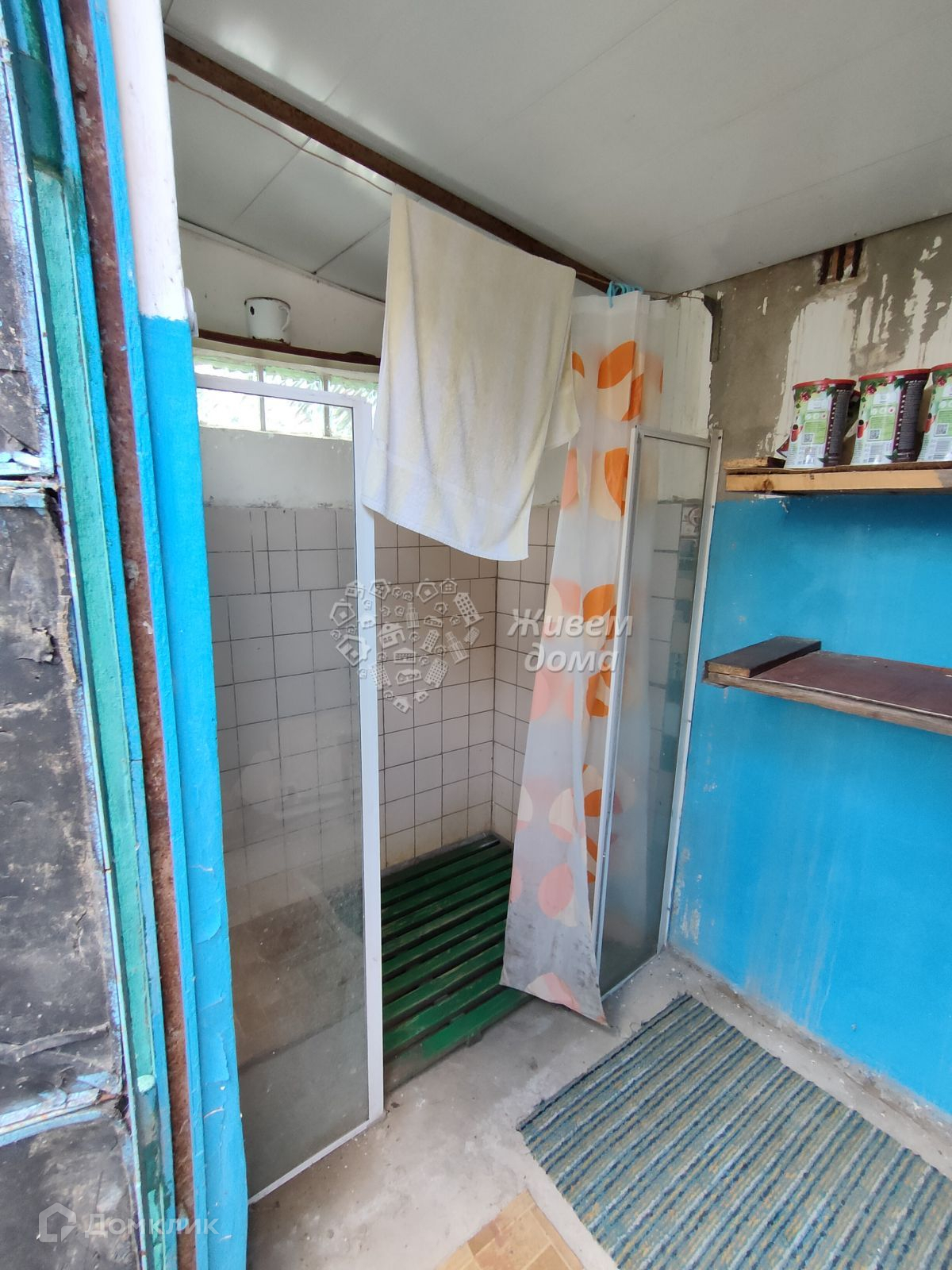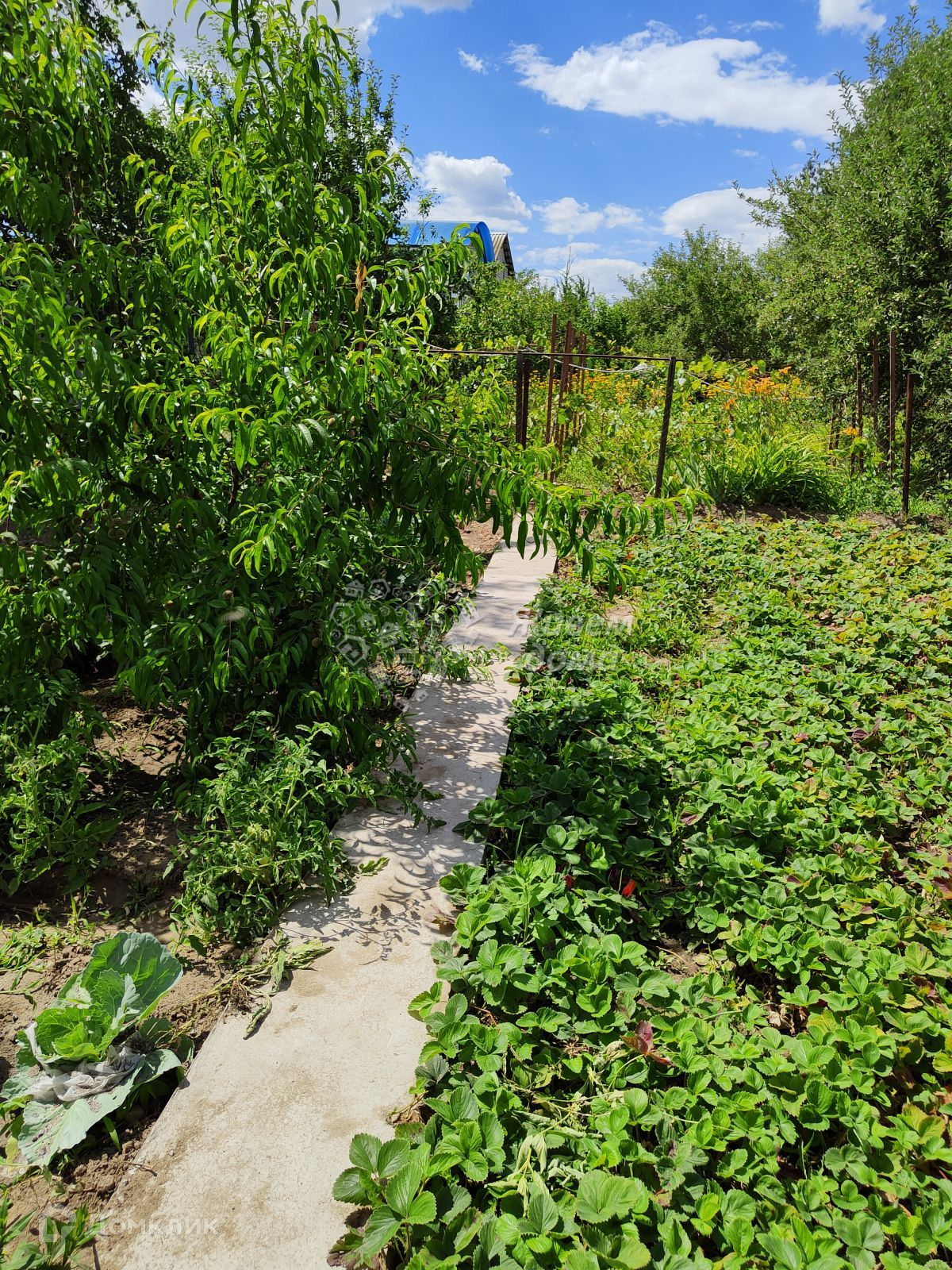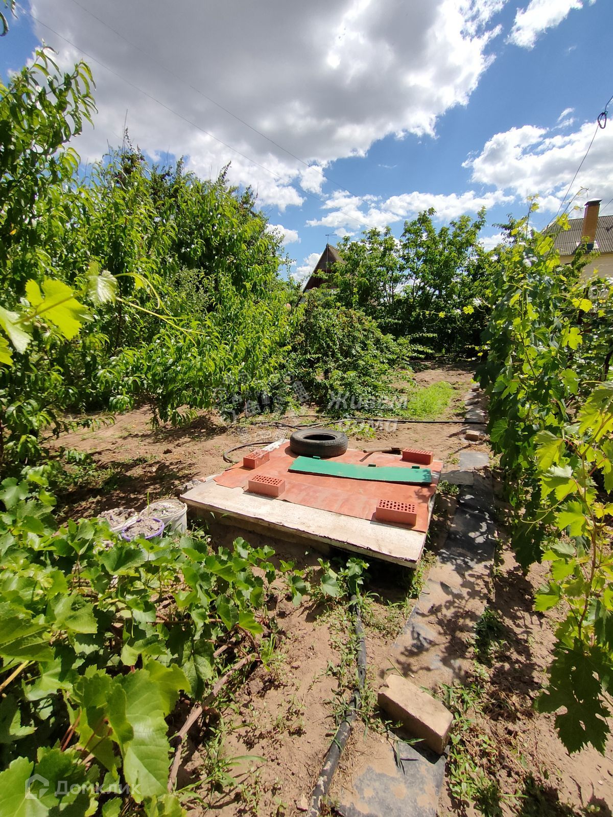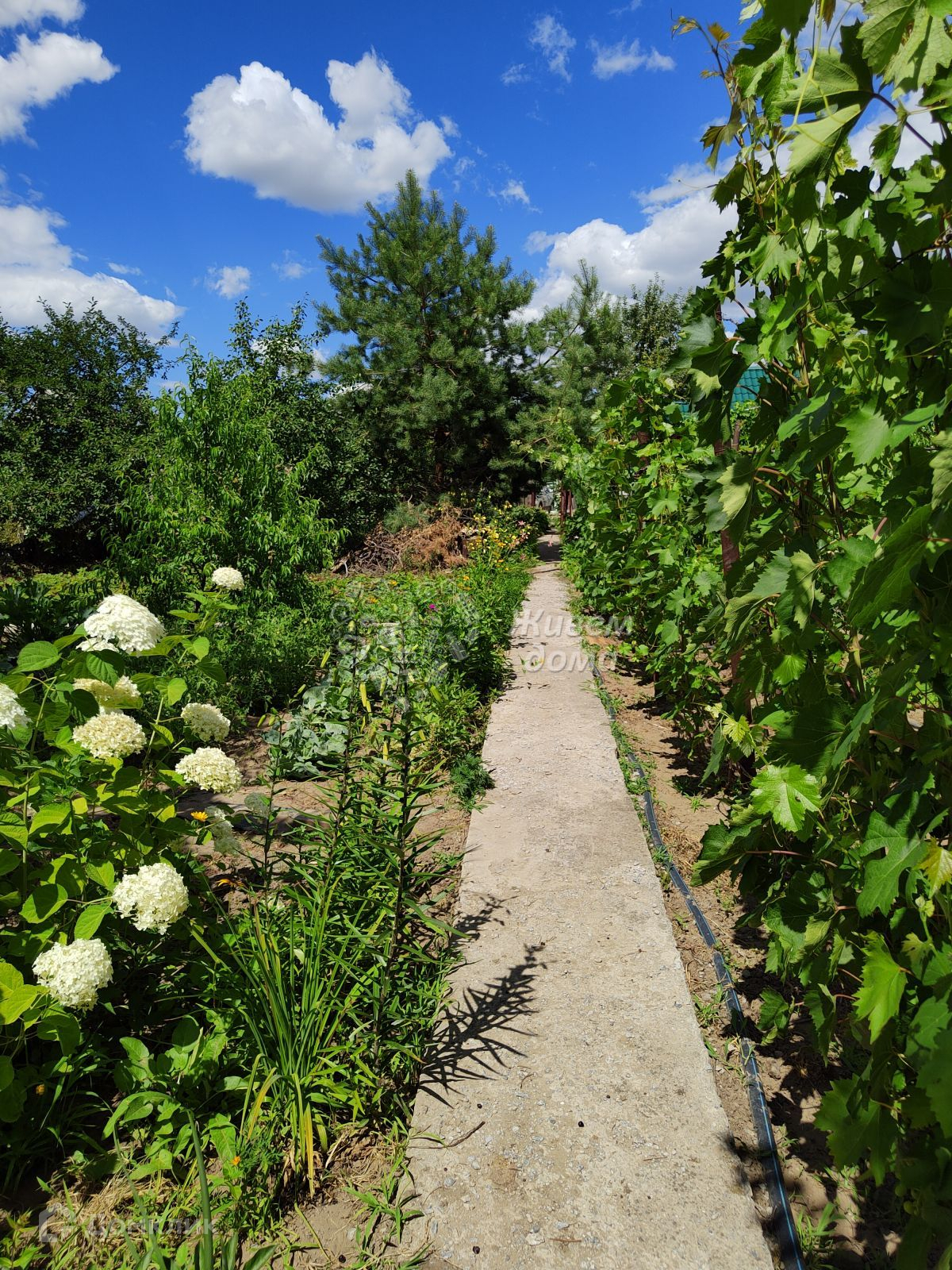 На участке также имеется обустроенный душ и туалет. Большое количество плодовых деревьев, виноград, грядки с овощами. Имеется скважина для воды. Сквозь весь участок проходят бетонные дорожки.