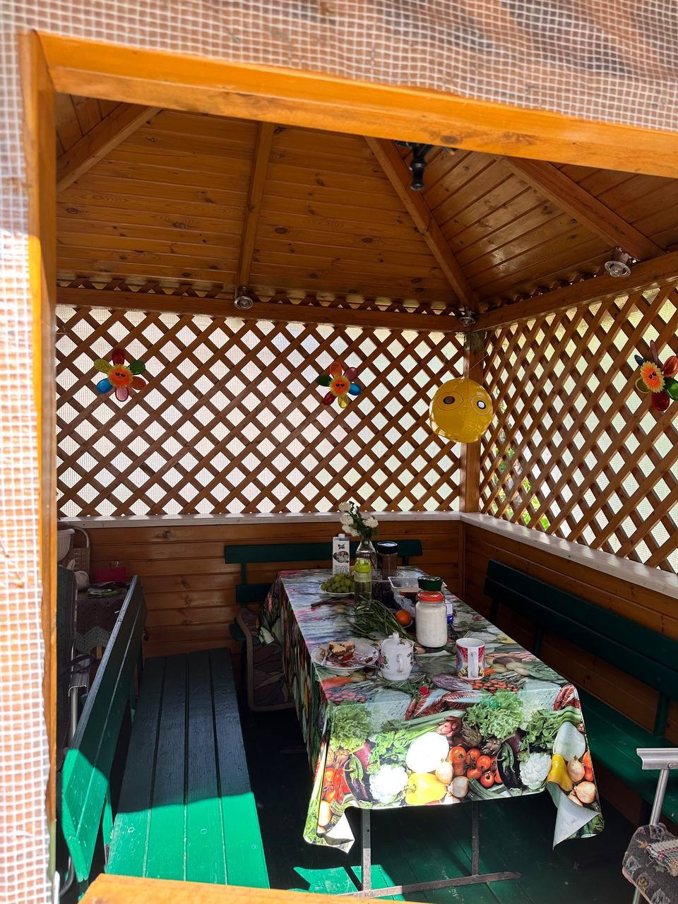 Беседка, теплица, хоз постройка для хранения инструмента. Плодовые деревья. водоснабжение центральное, так же на территории СН есть колодец.