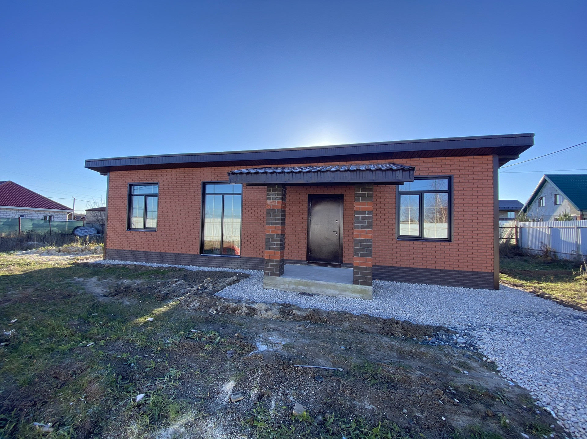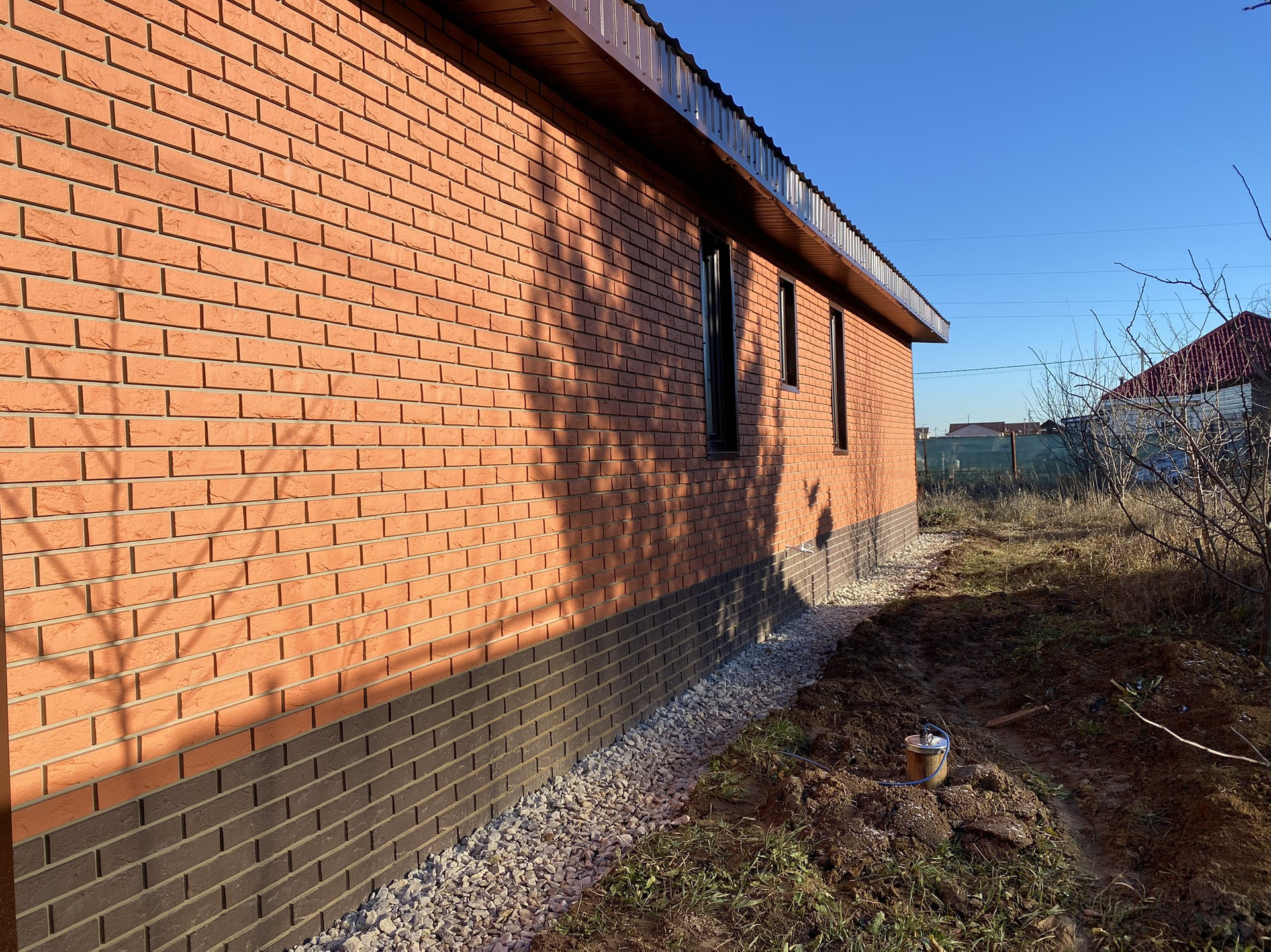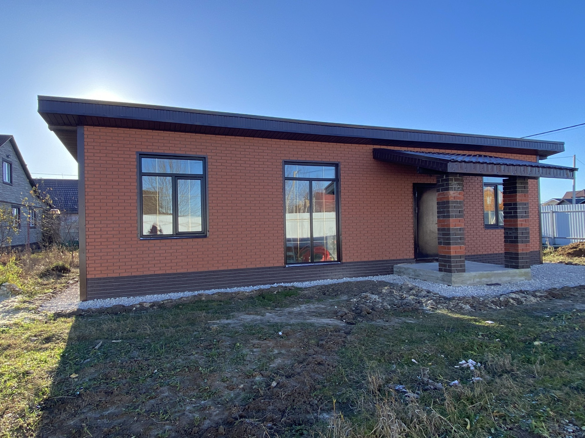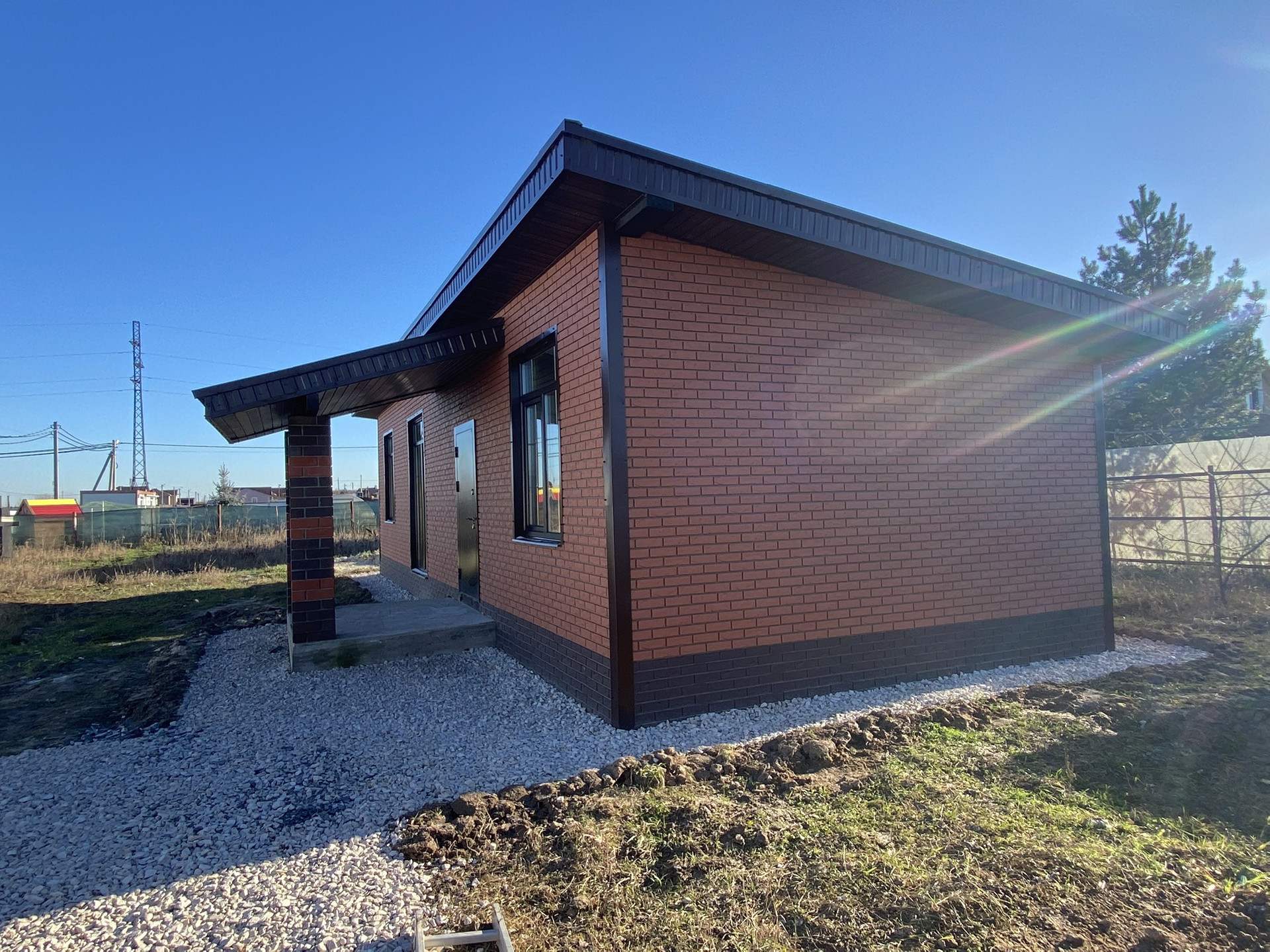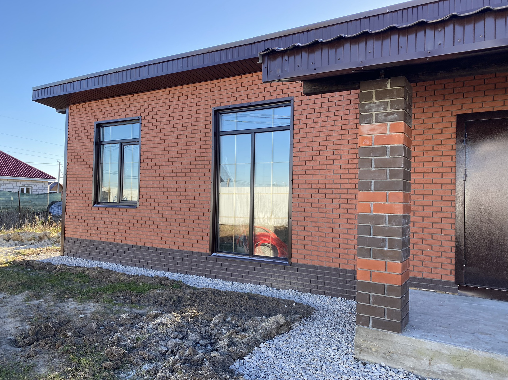Дом 1 этаж, газобетонный блок, утеплен, фундамент монолитная плита, крыша односкатная из металочерепицы, внешняя отделка - фасадные панели под кирпич.