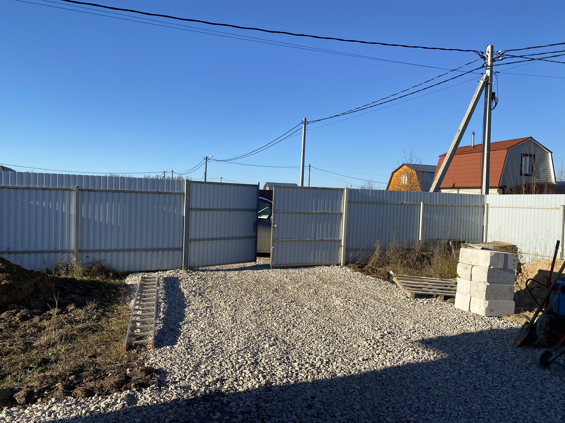 Дом расположен на участке 8 соток, огорожен забором из профлиста. Сделана парковка, дорожка и отмостка из щебенки.