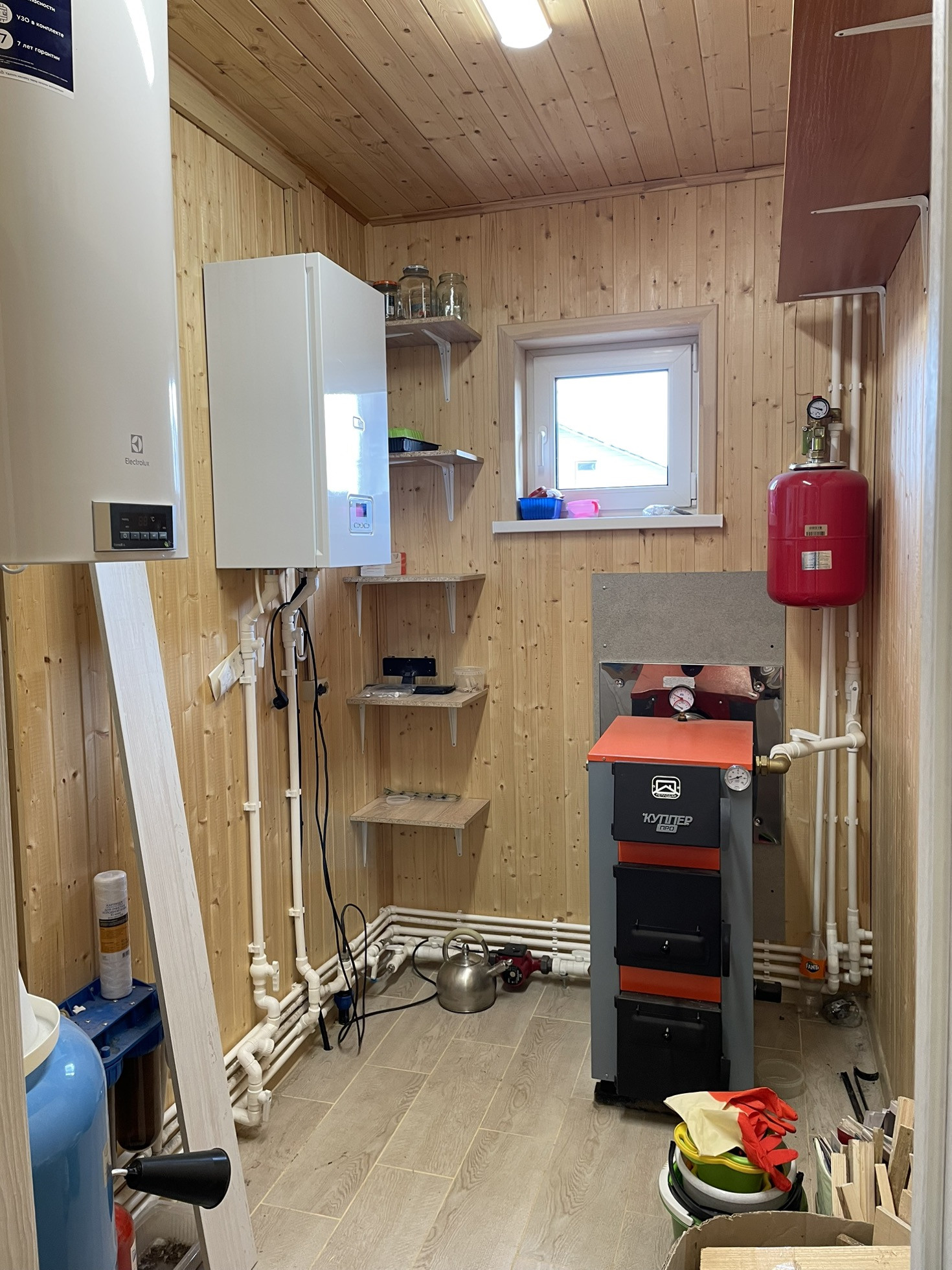 - отопление: батареи, электрокотел 9 кВт, дровяной котел Купер Про 28.