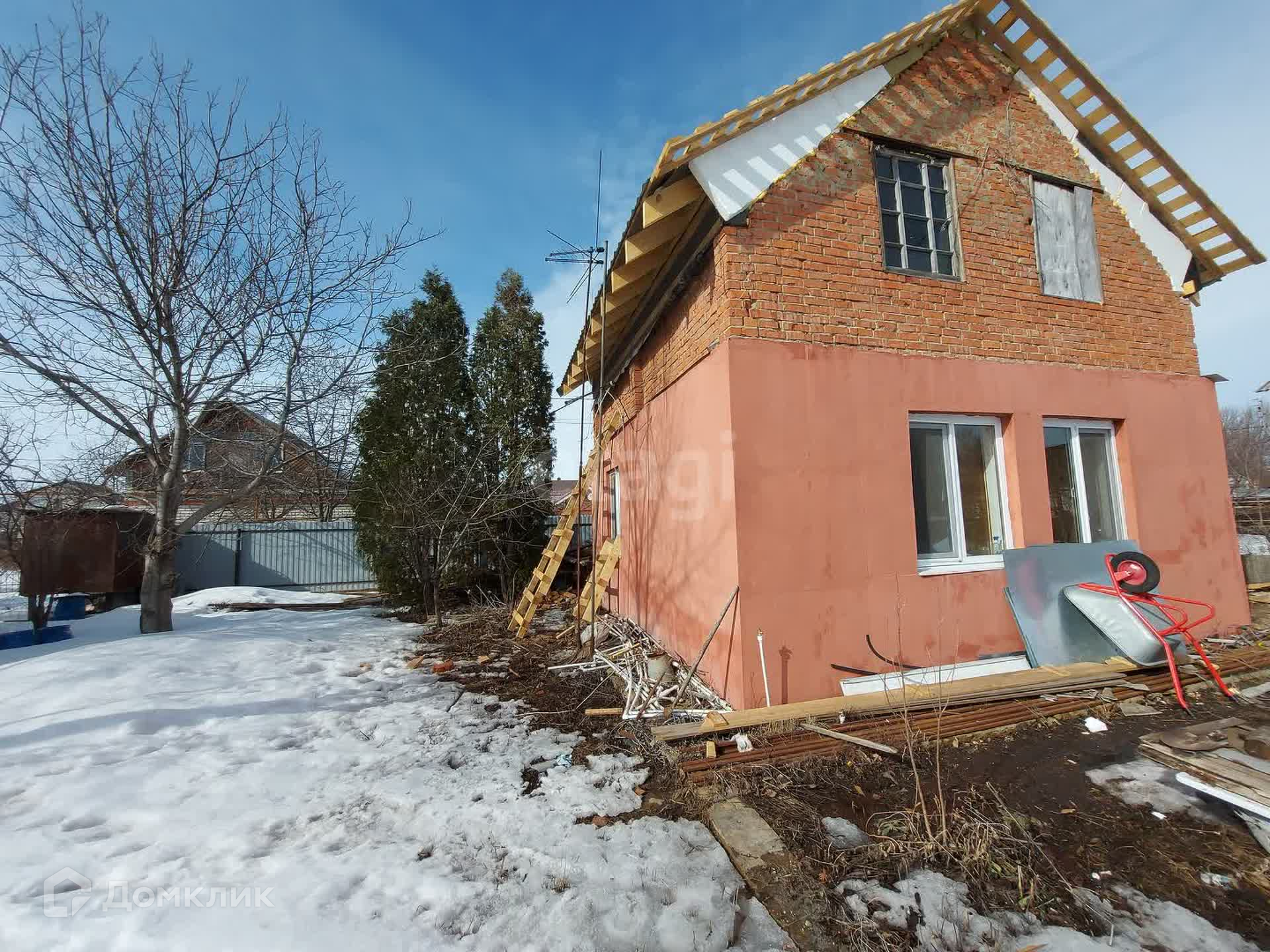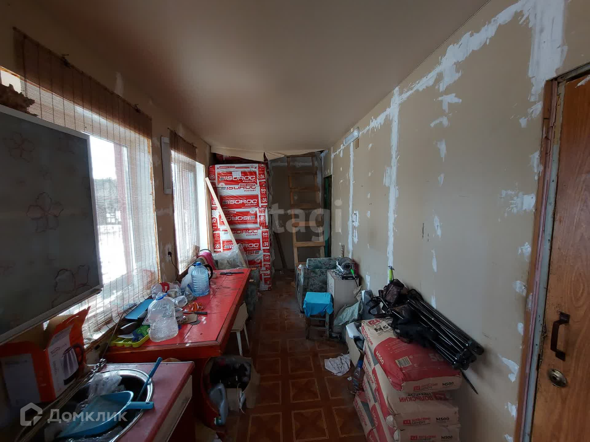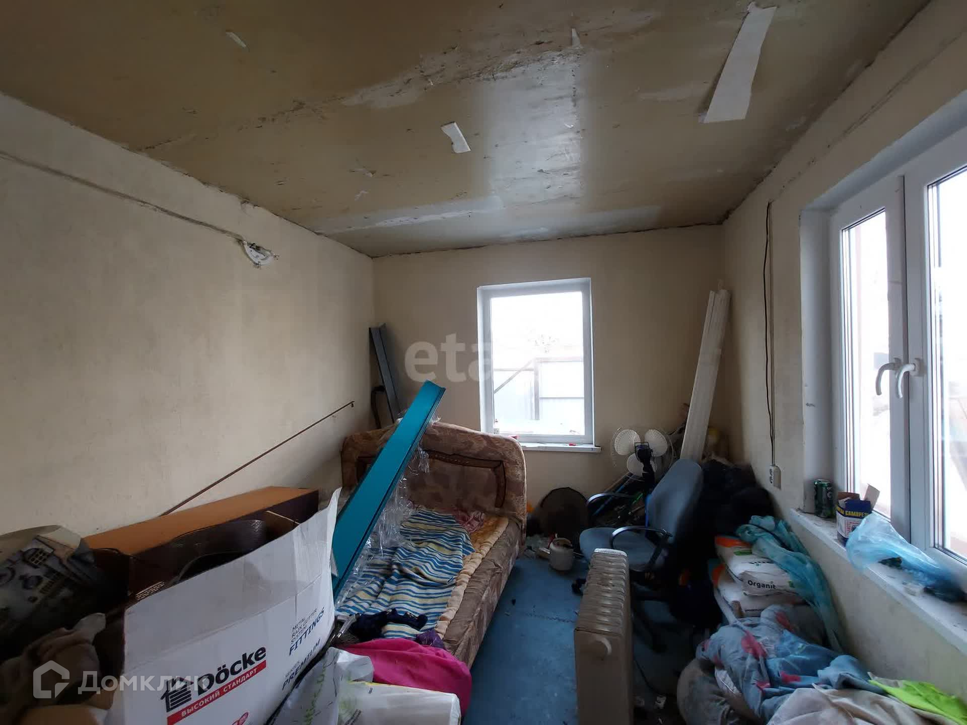 На первом этаже кухня и 2 равнозначные комнаты, второй этаж в свободной планировке, планировалась терраса с прямым выходом. На данным момент в доме произведены работы: заменена и утеплена крыша, установлены пластиковые окна и утеплен фасад на 1 этаже, заменена электро-проводка. Внутри дом готов к косметическому ремонту, стены выровнены, потолки в черновом виде. По договоренности можно оставить частично стройматериал для дальнейших ремонтных работ.